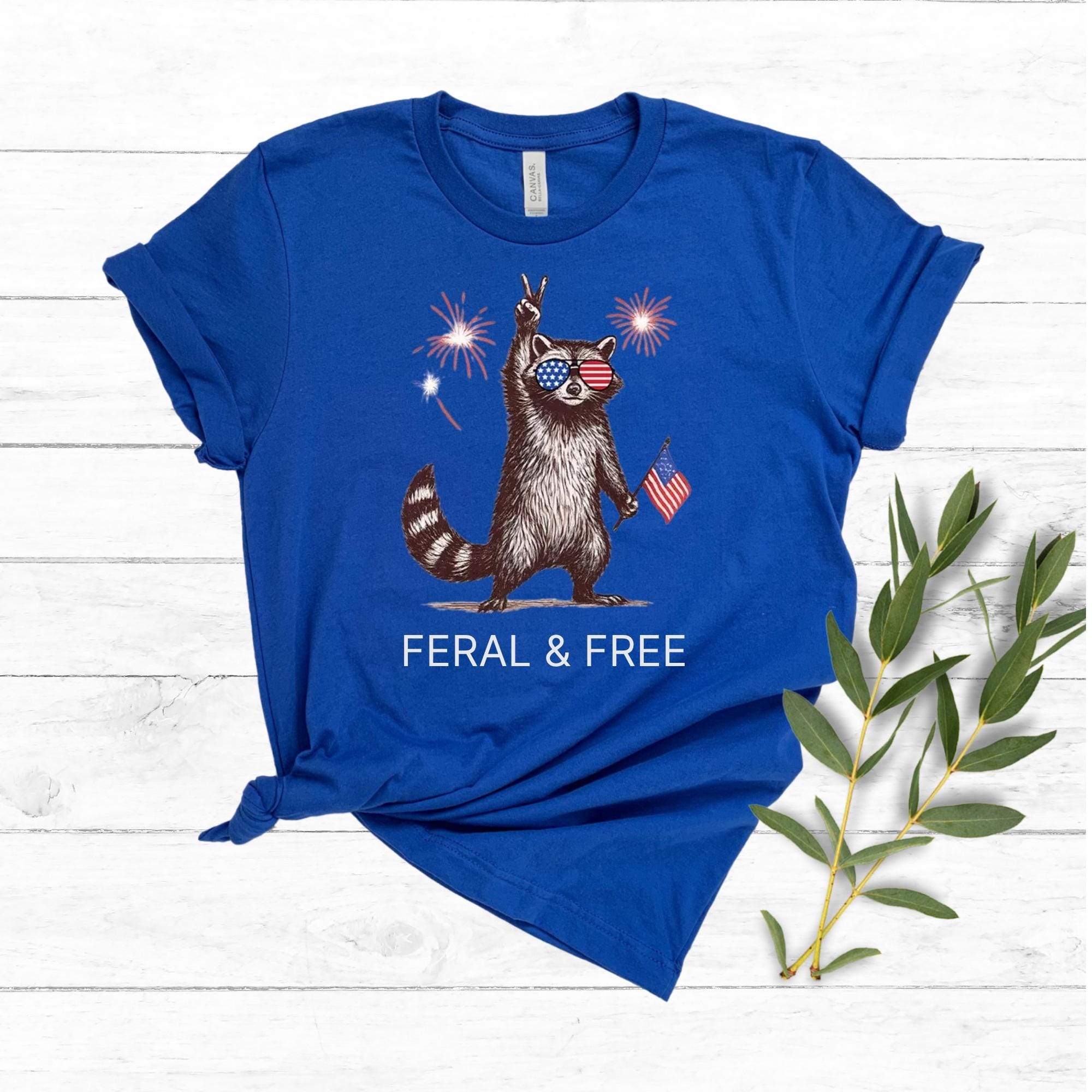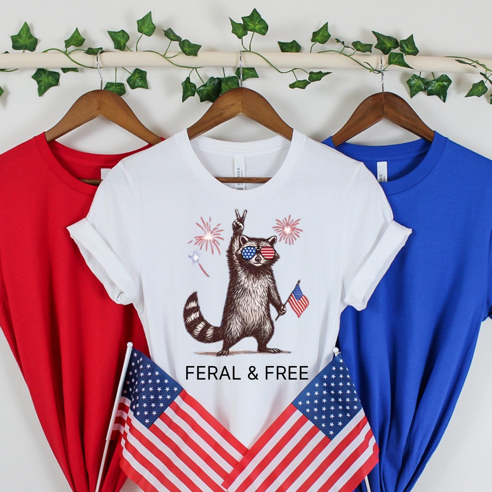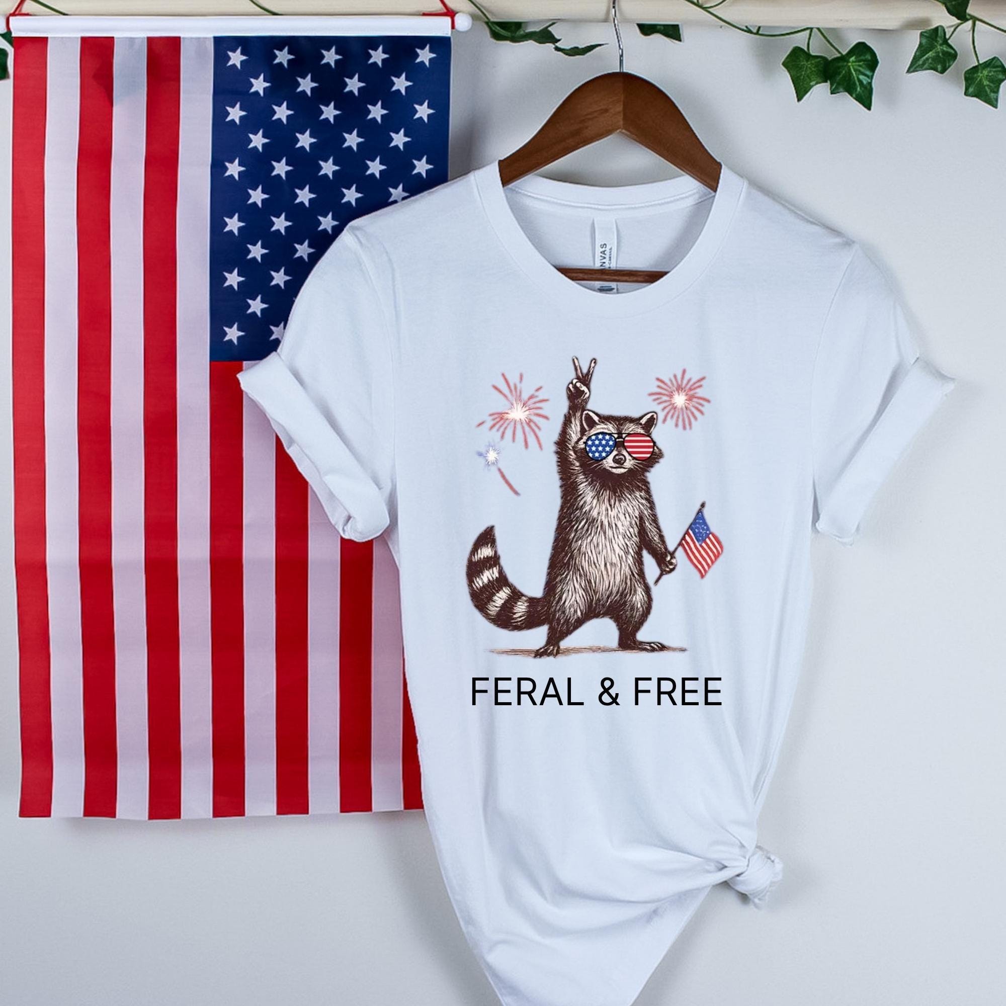 Feral & Free Raccoon T-Shirt,Funny 4th of July Shirt, American Feral Girl Summer Meme Shirt, Patriotic Independence Day Gift