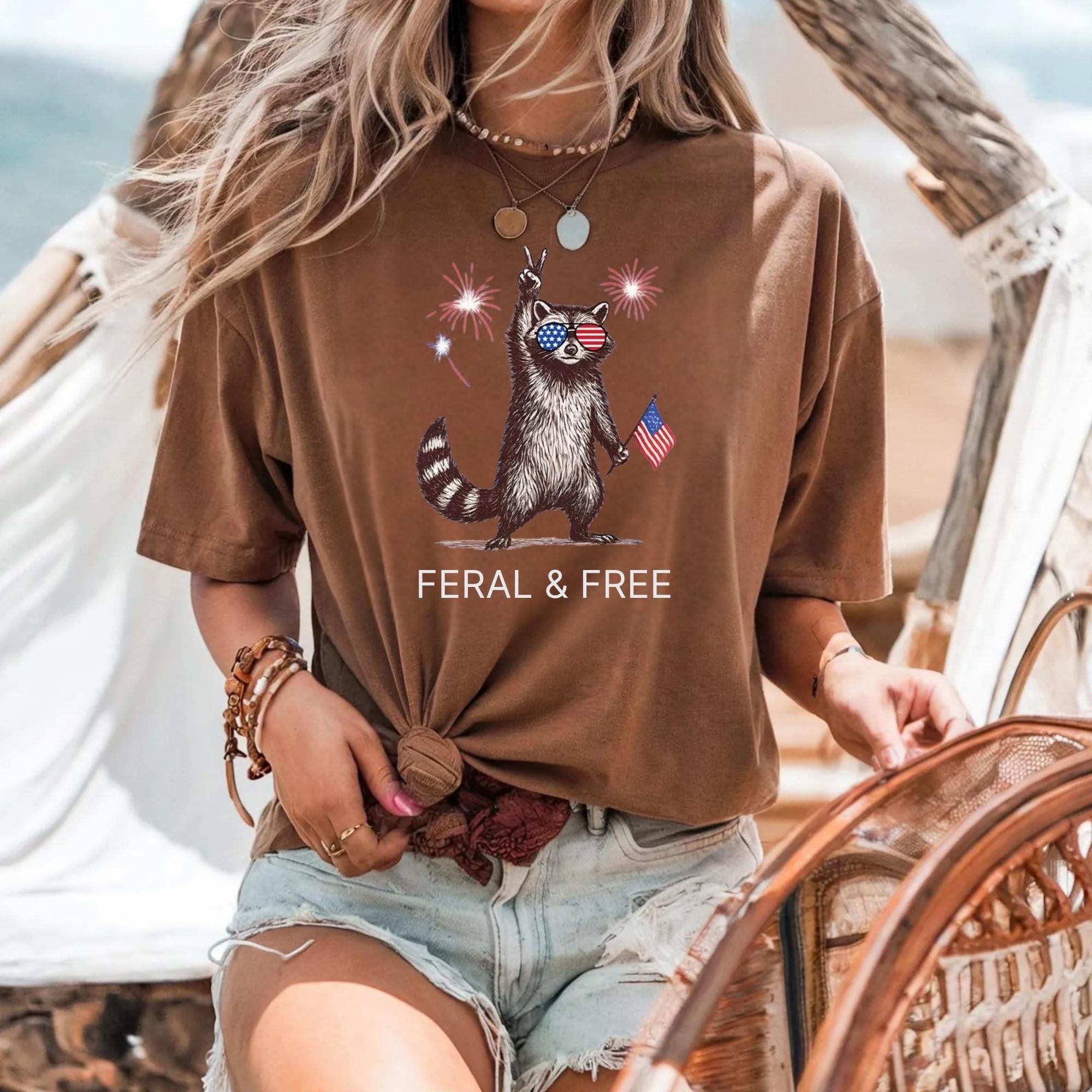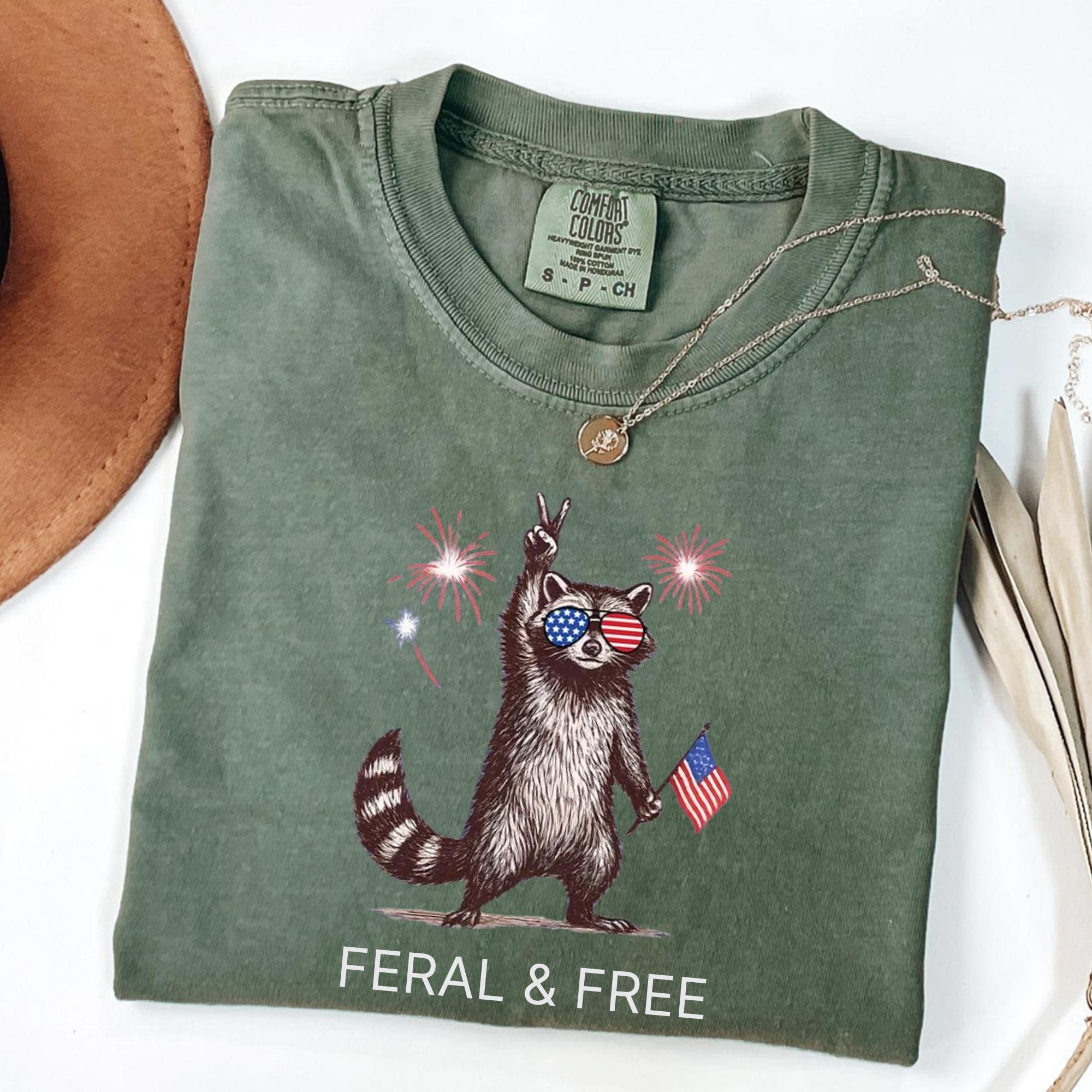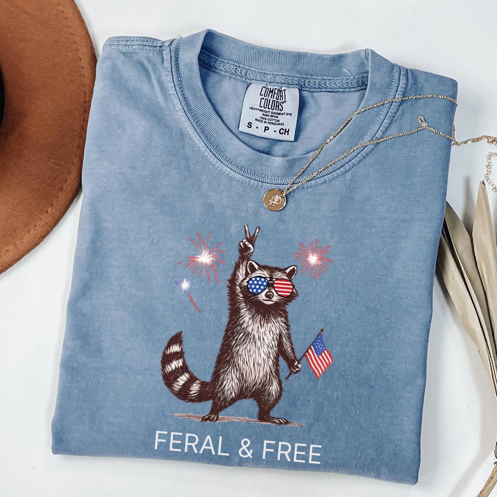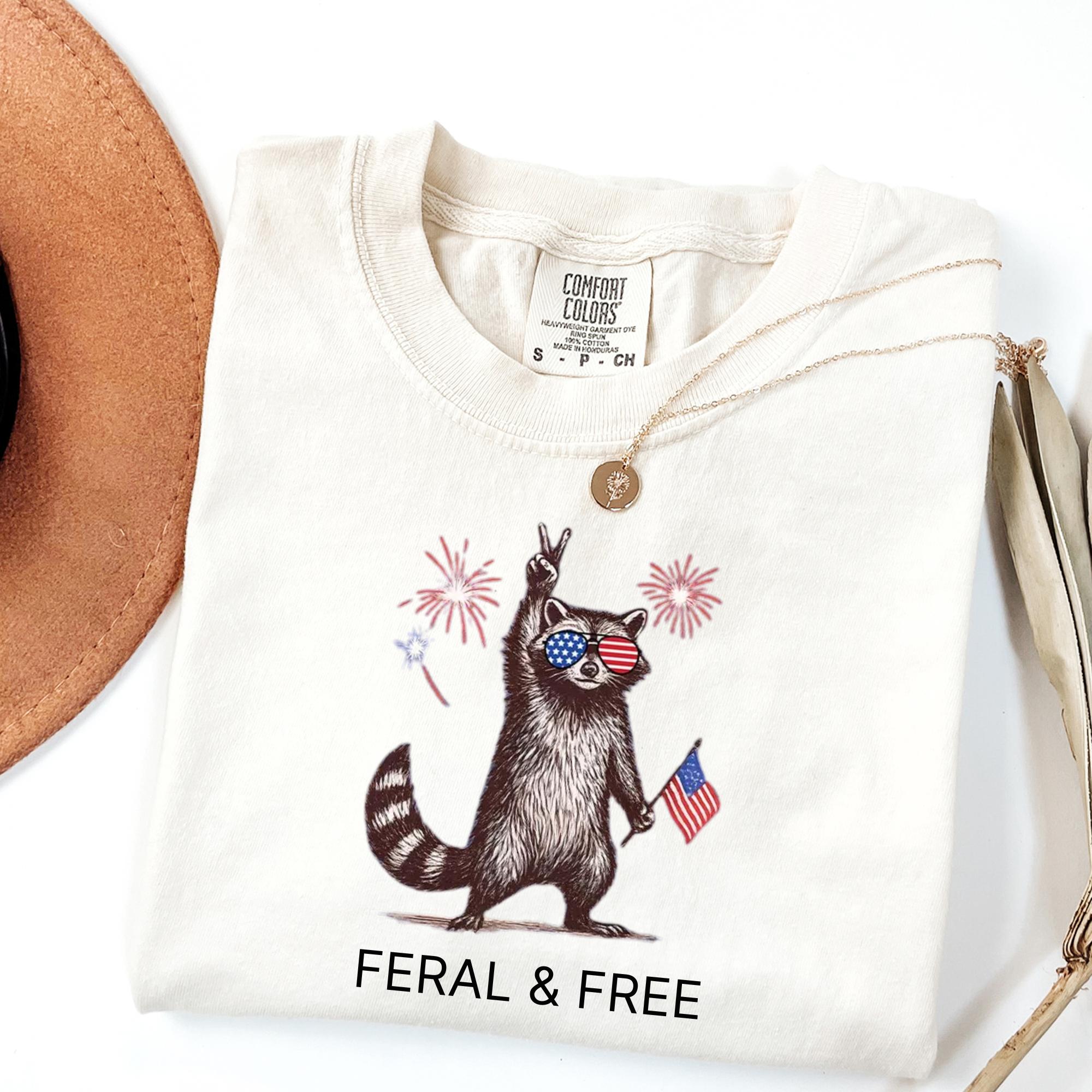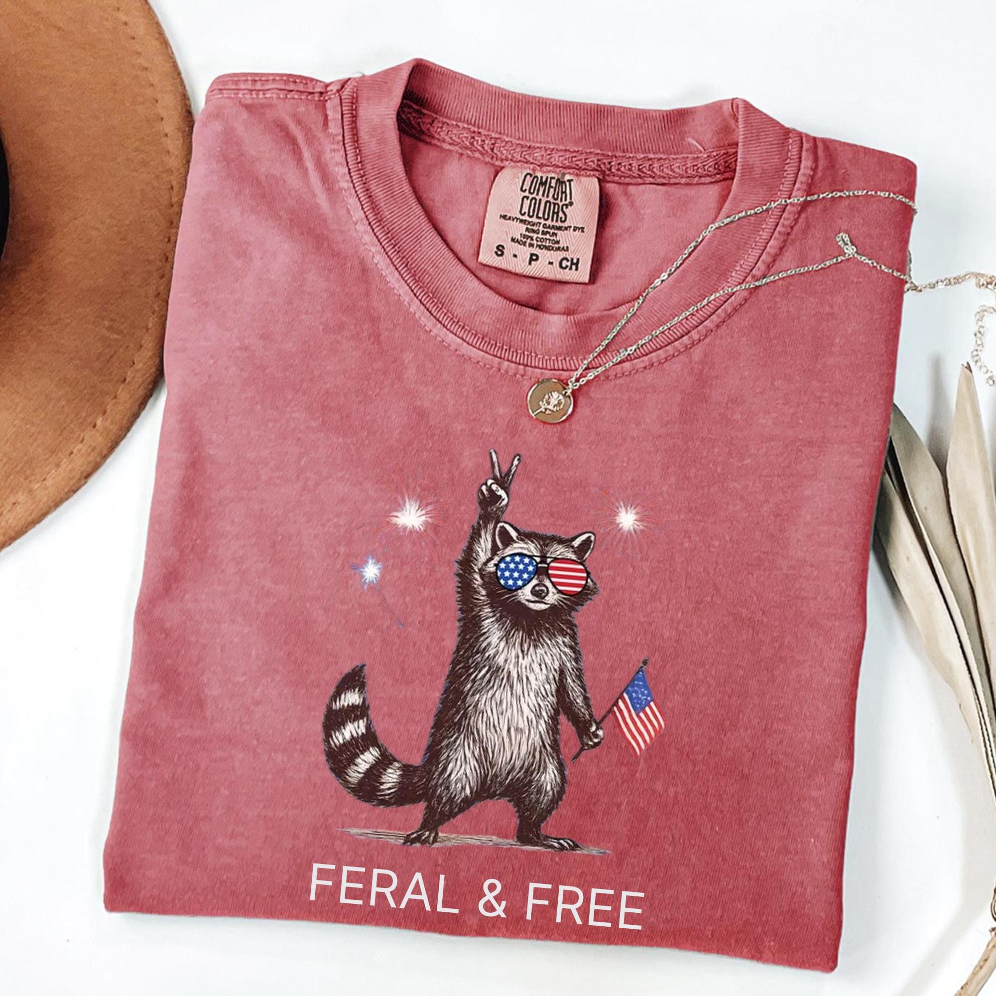 Comfort Colors® Feral & Free Raccoon T-Shirt,Funny 4th of July Shirt, American Feral Girl Summer Meme Shirt, Patriotic Independence Day Gift