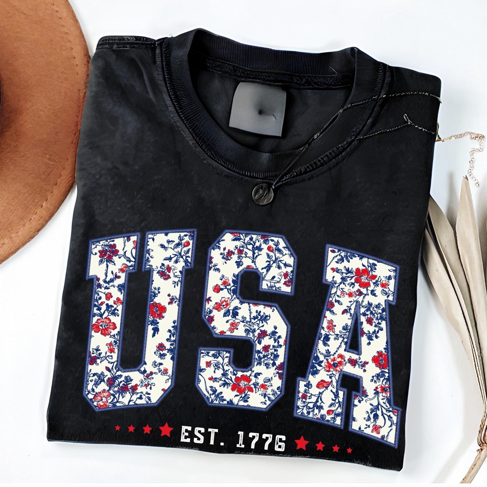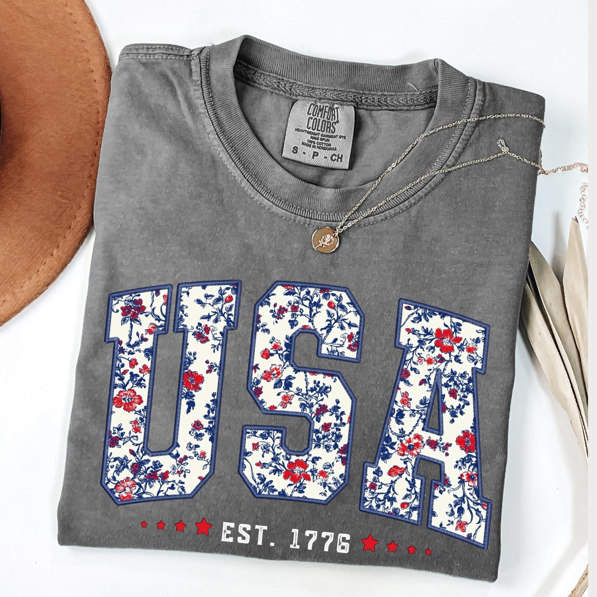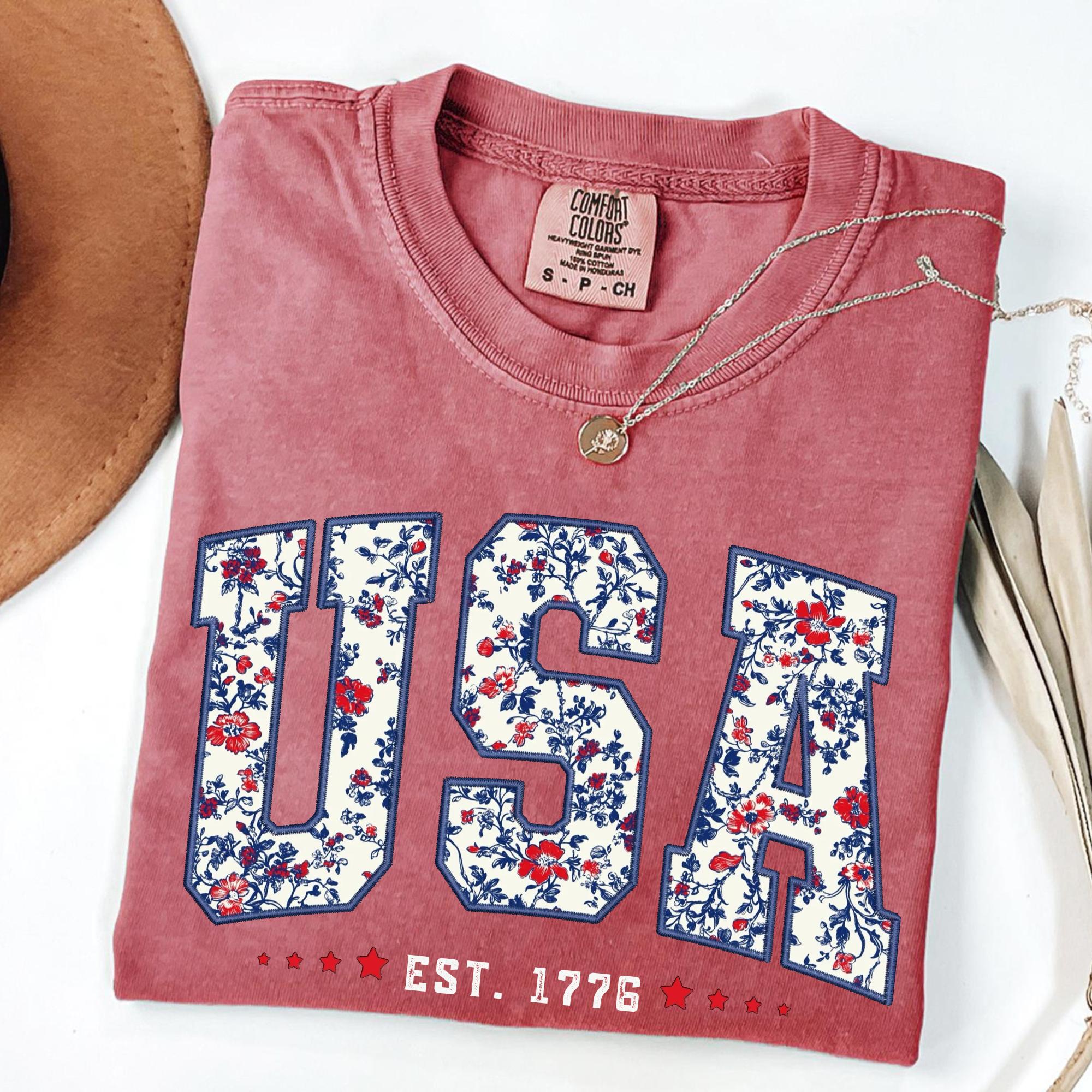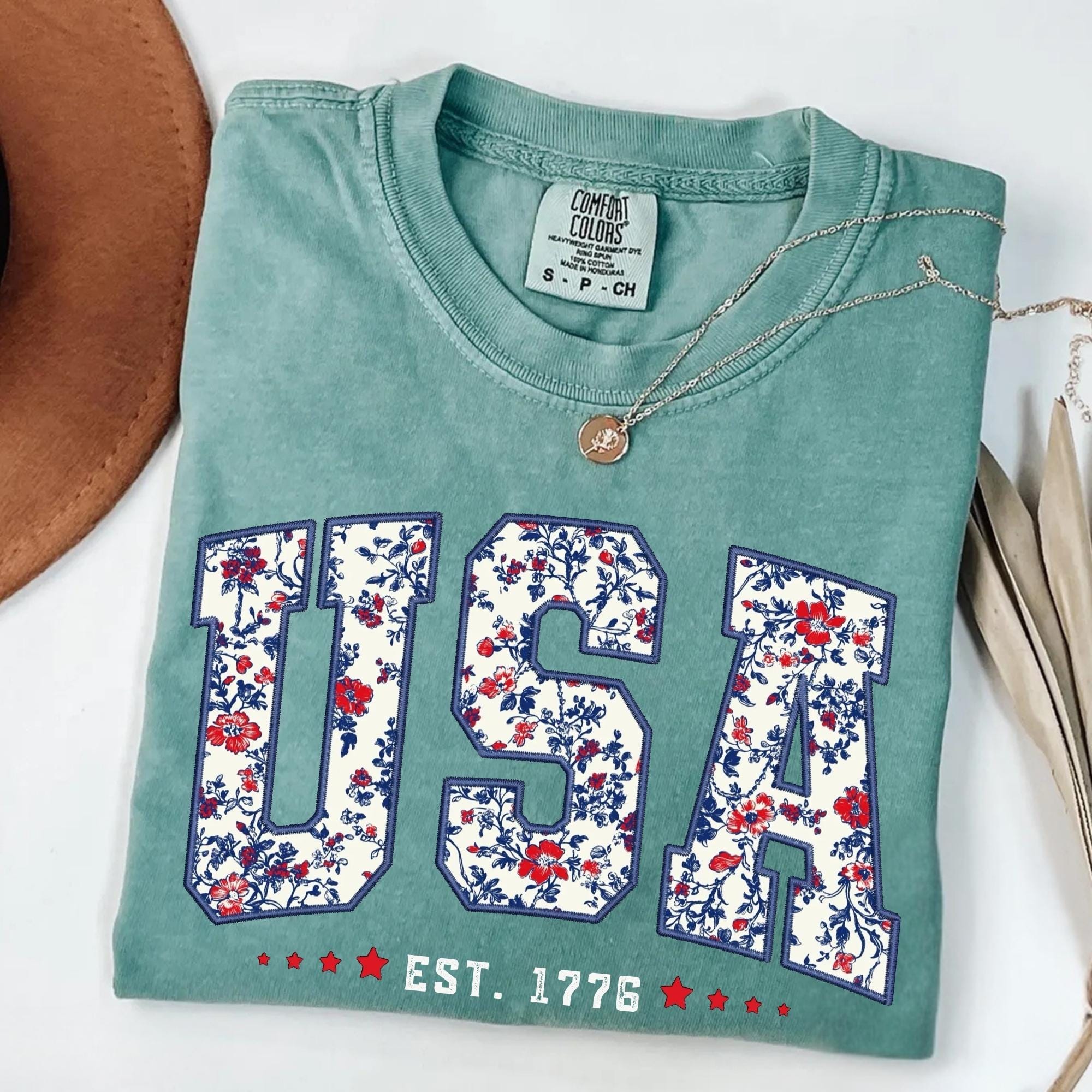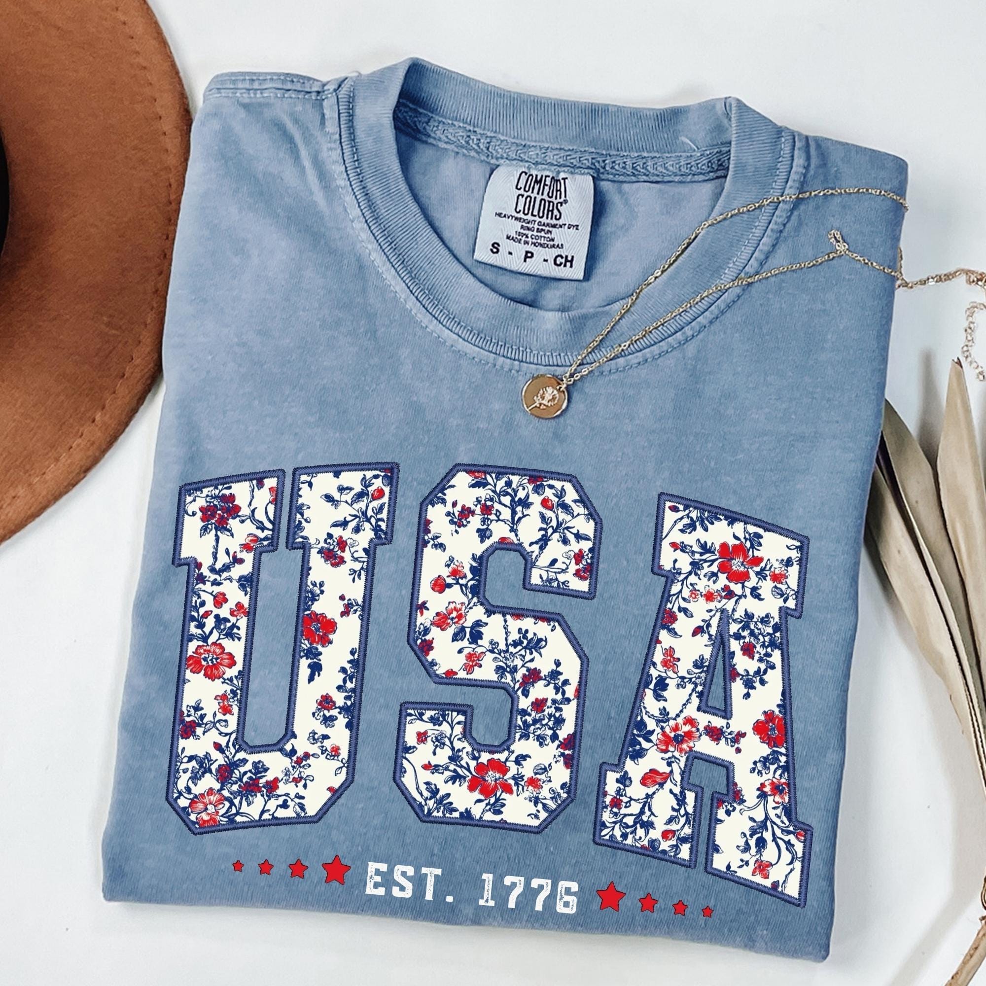 Comfort Colors© Floral USA Shirt, America Shirt, Fourth of July Shirt,4th of July Tee,Patriotic Women Shirt,USA Est 1776 Shirt,Girly USA Tee