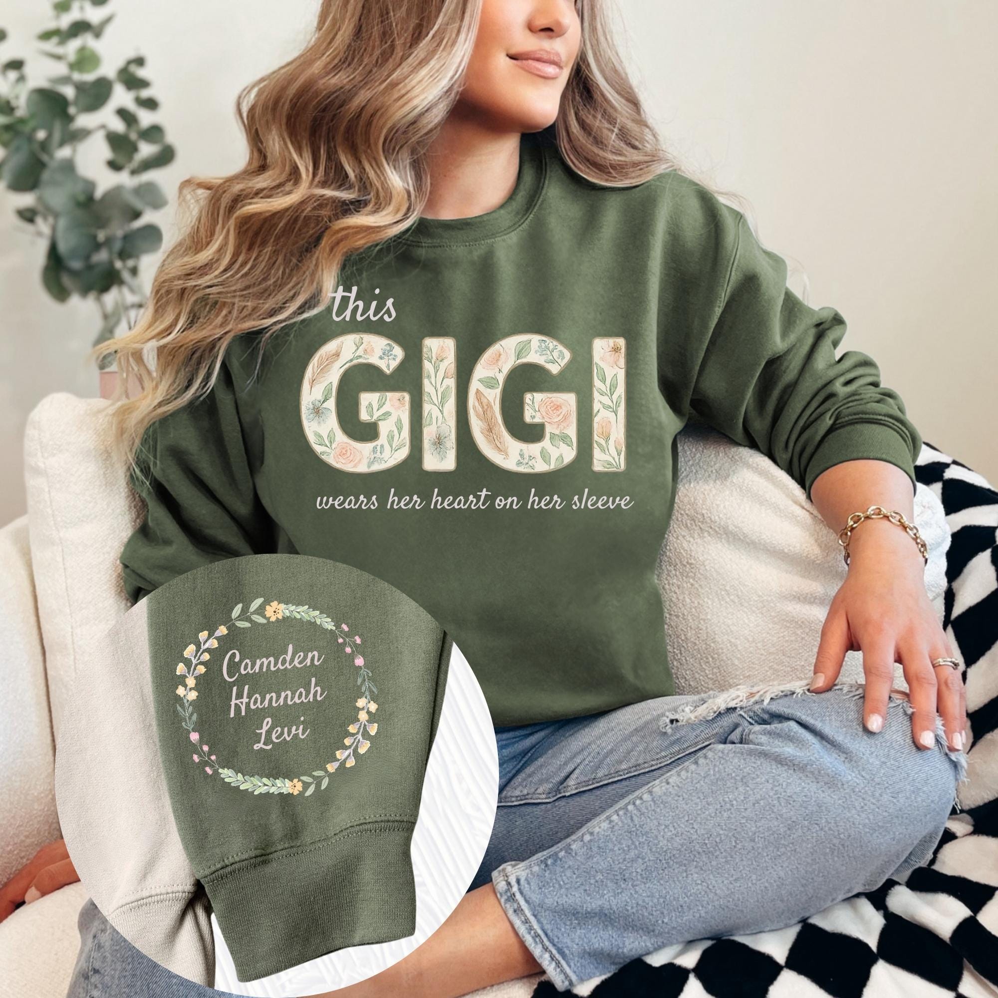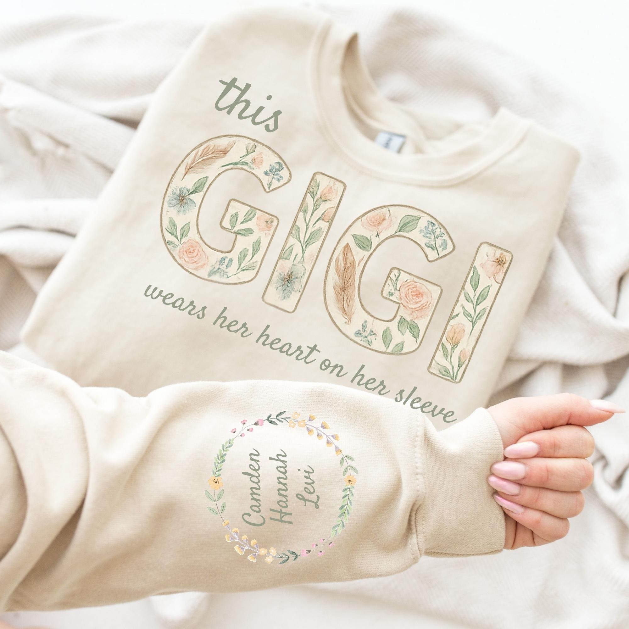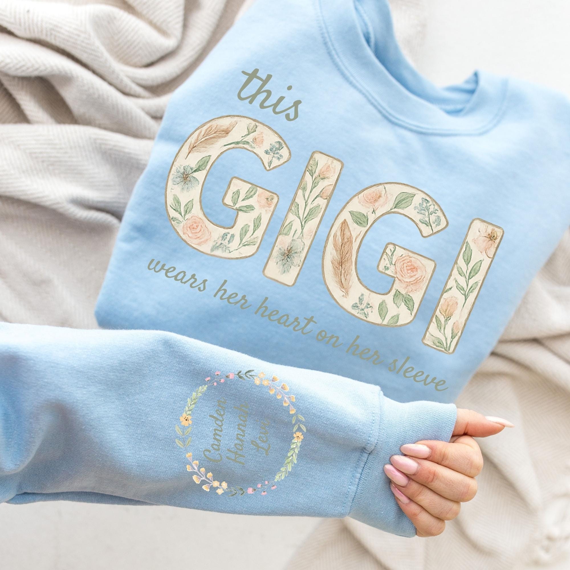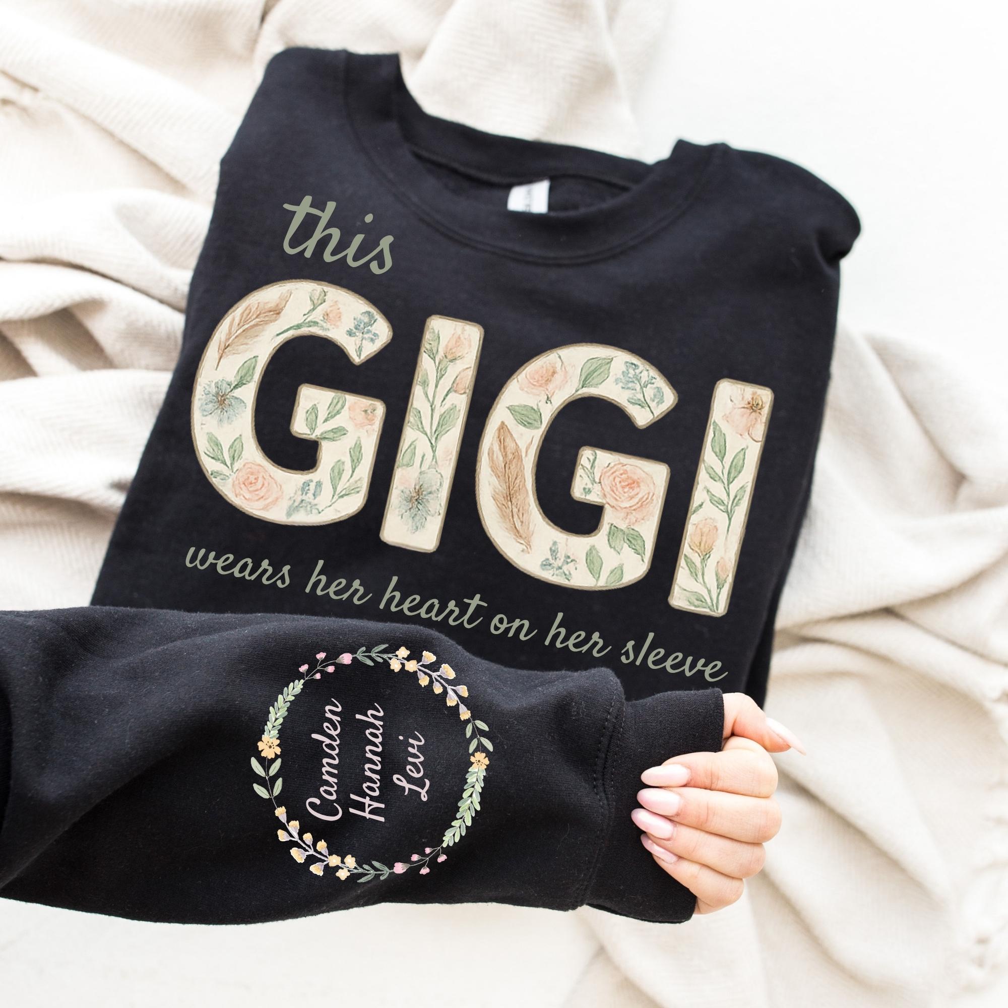 Custom This GIGI Wears Her Heart On Her Sleeve Sweatshirt, Shirt with Names On Sleeve, Mommy Heart Hoodie, Mother's Day Gift, Nana Outfit