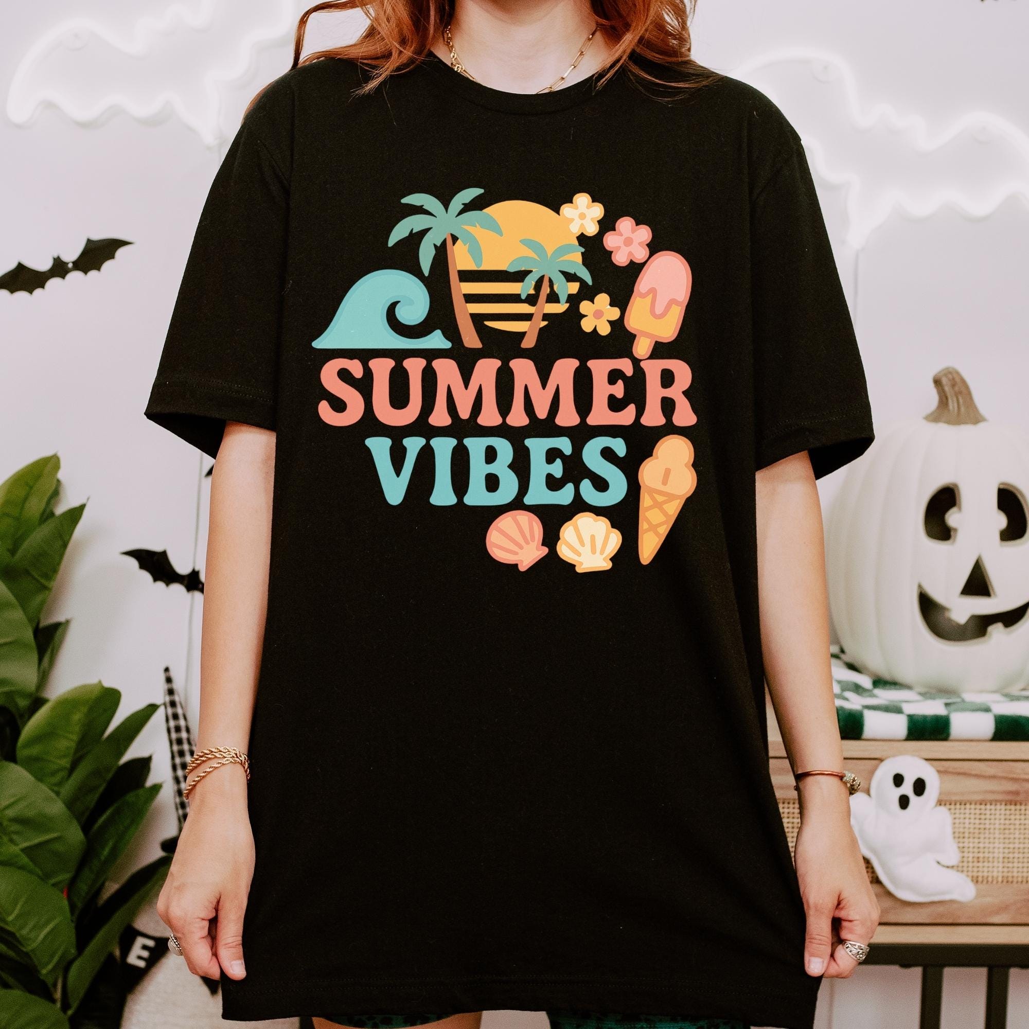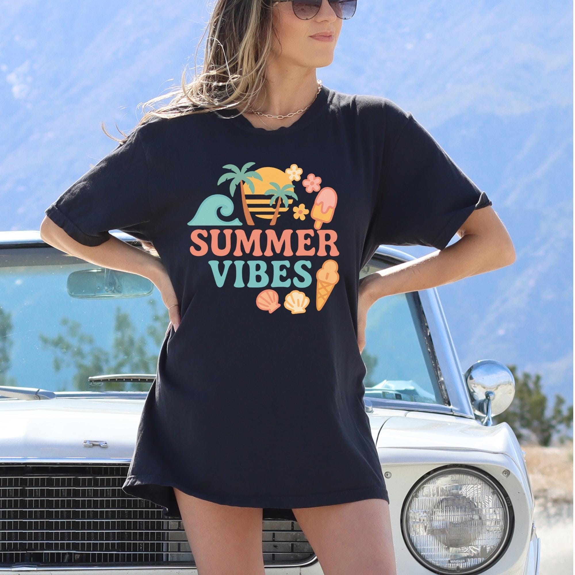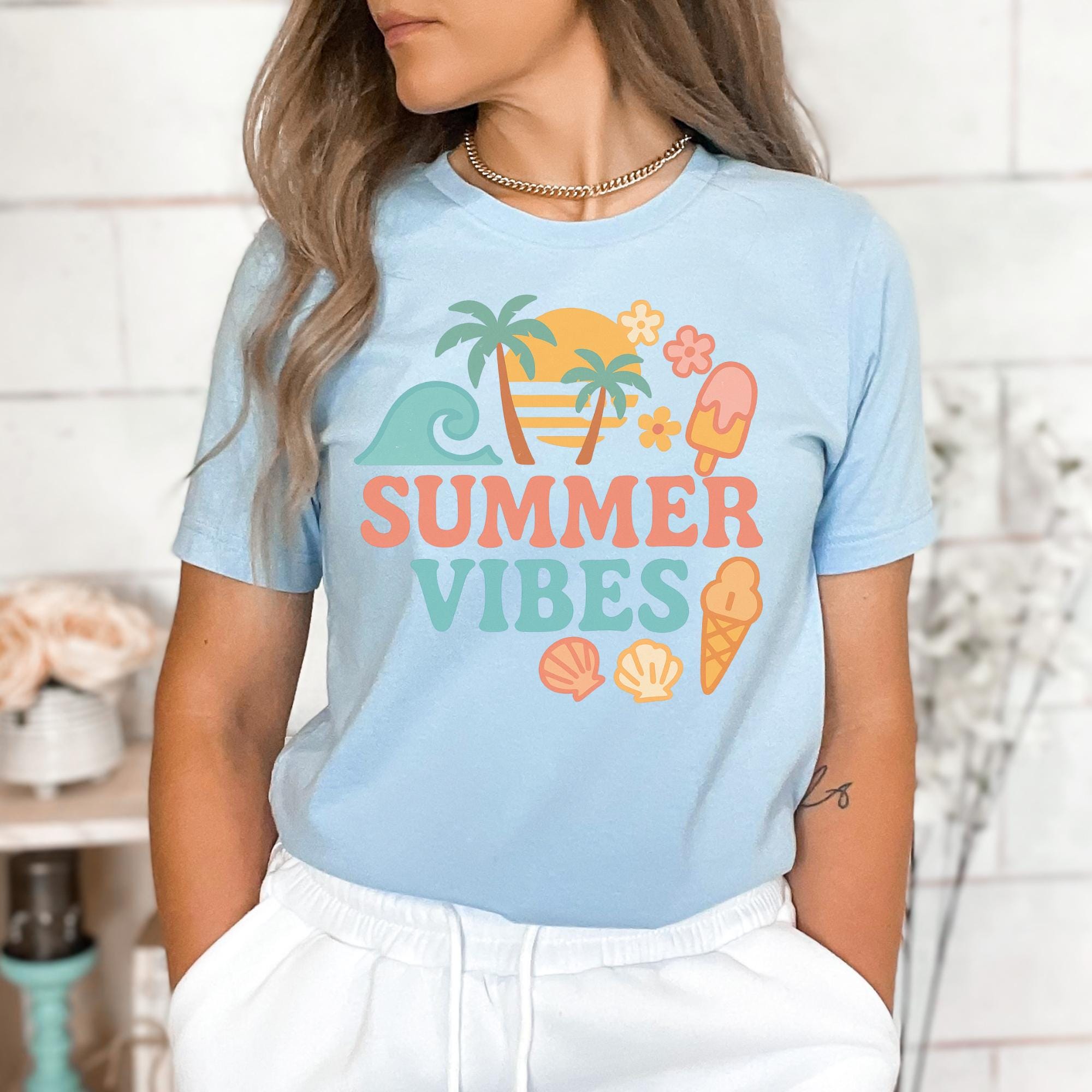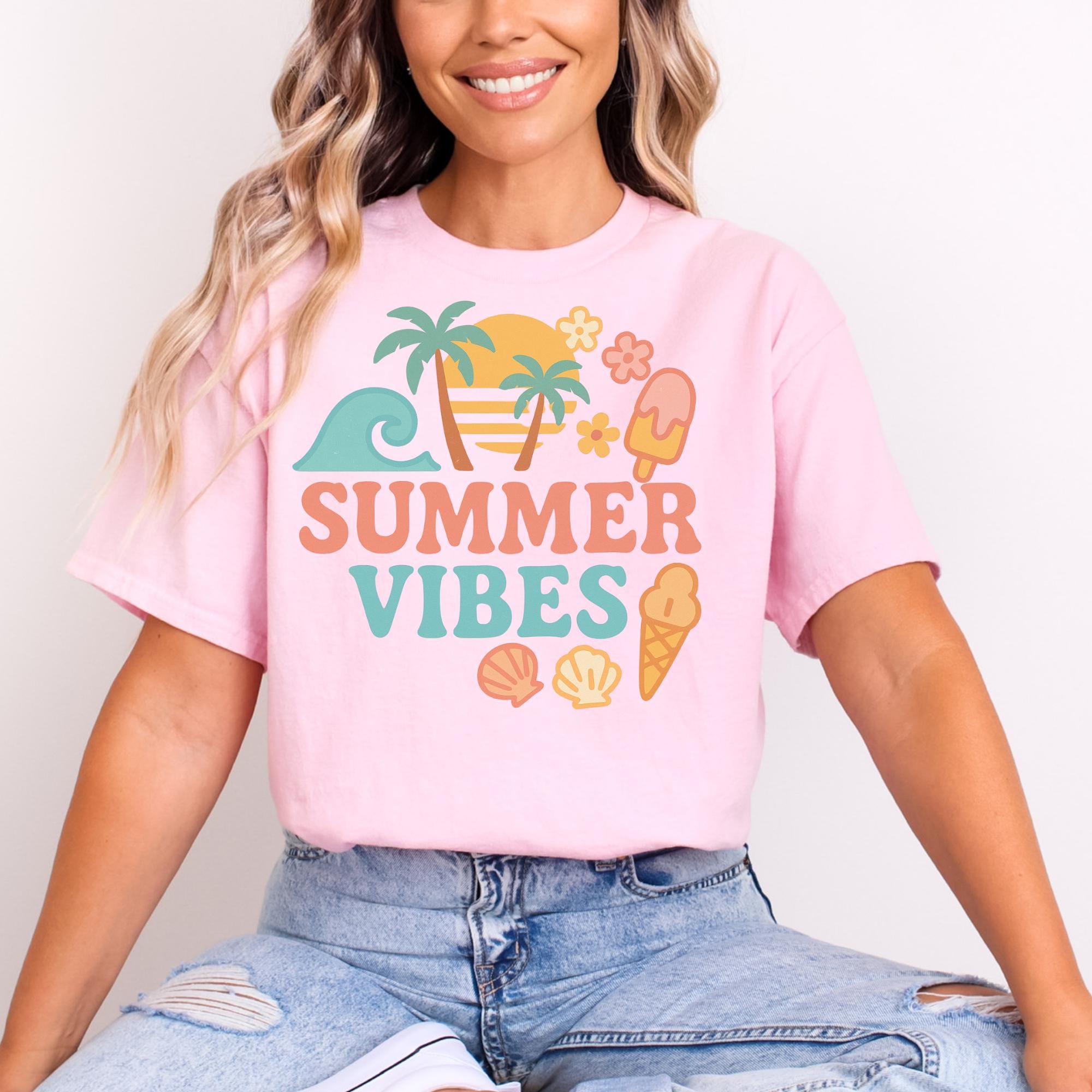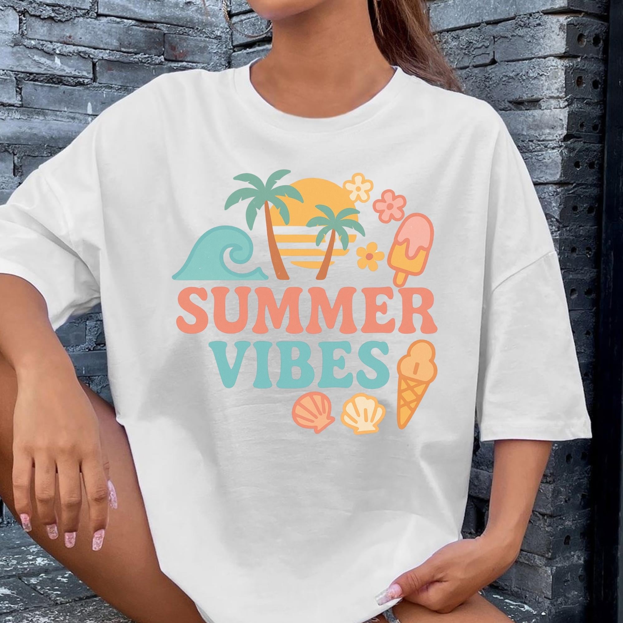 Retro Summer Vibes T-Shirt β Cute Pastel Beach Icons, Palm Trees & Ice Cream | Fun Vacation Tee
