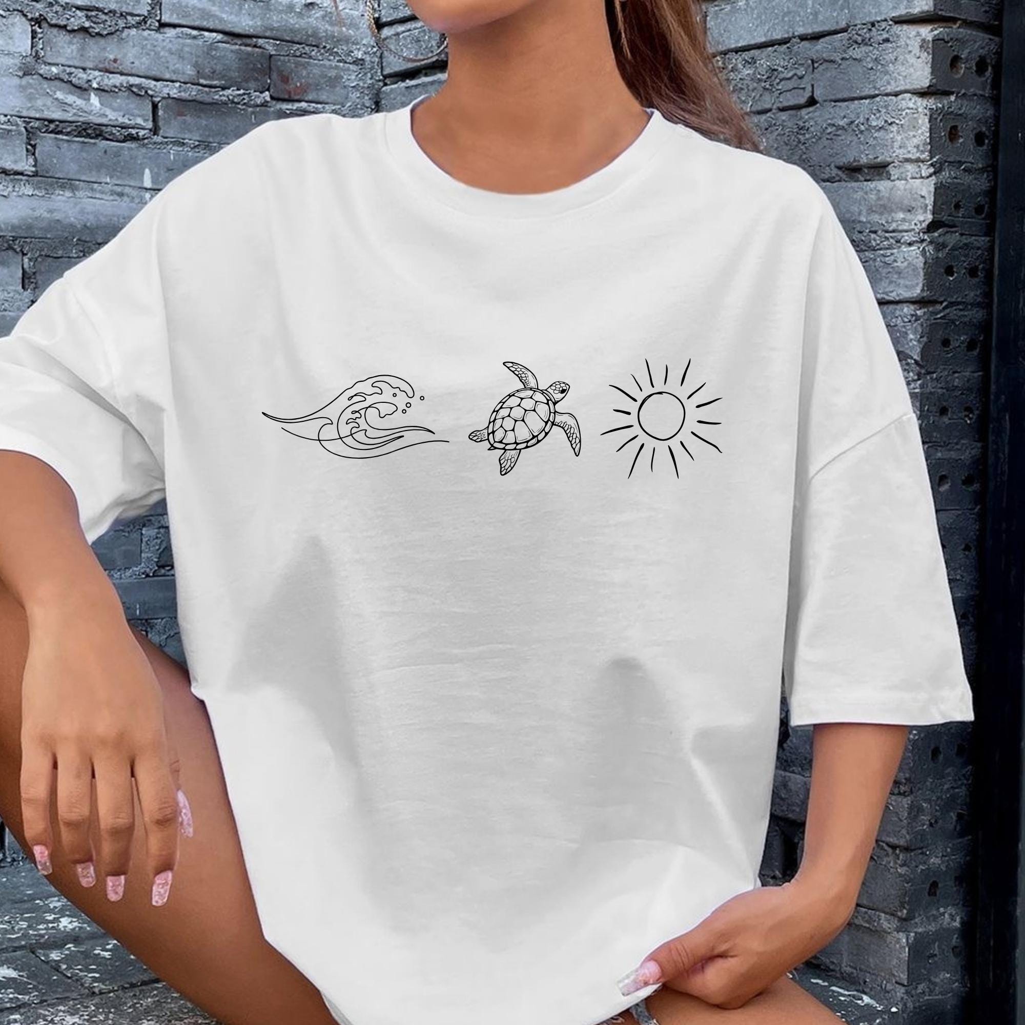 Minimal Sea Turtle Cotton T-Shirt, Wave & Sun Design