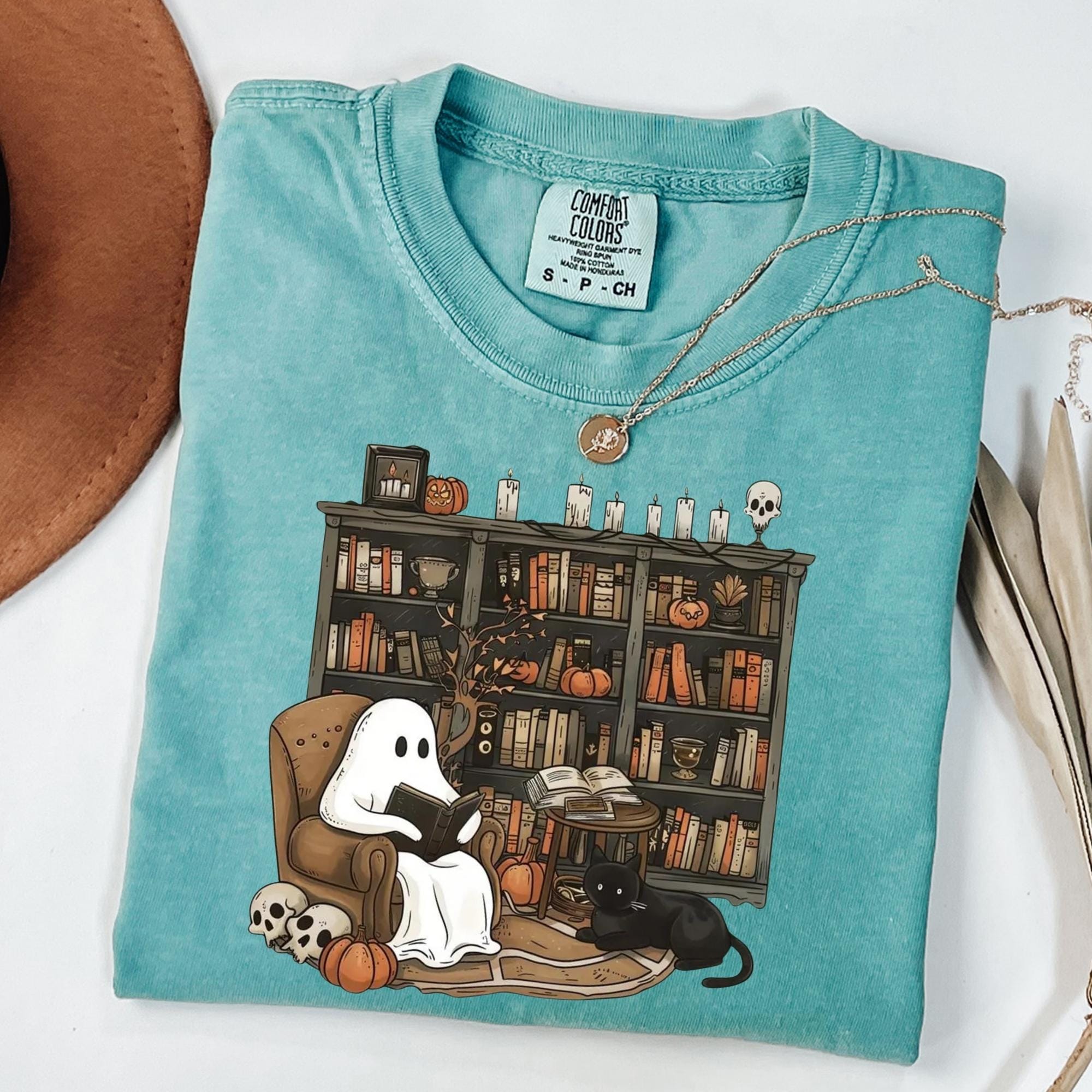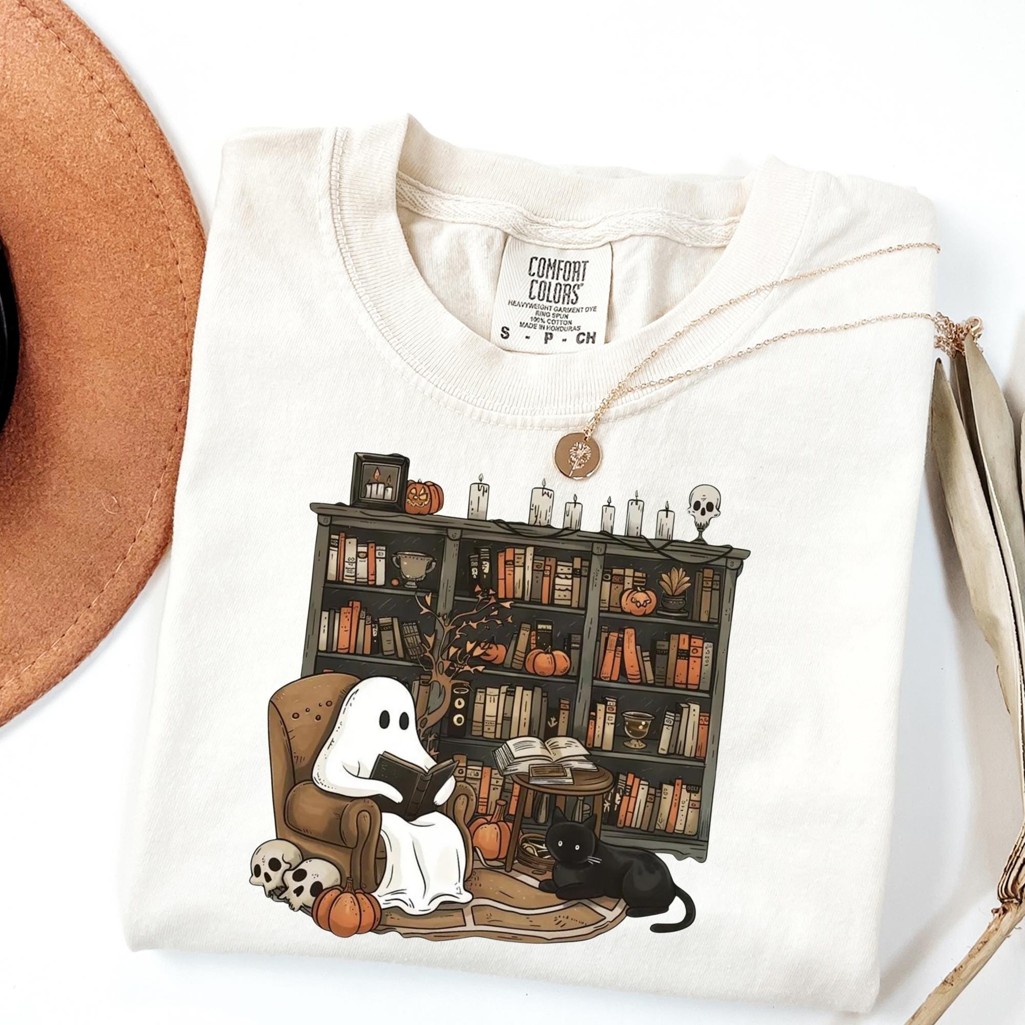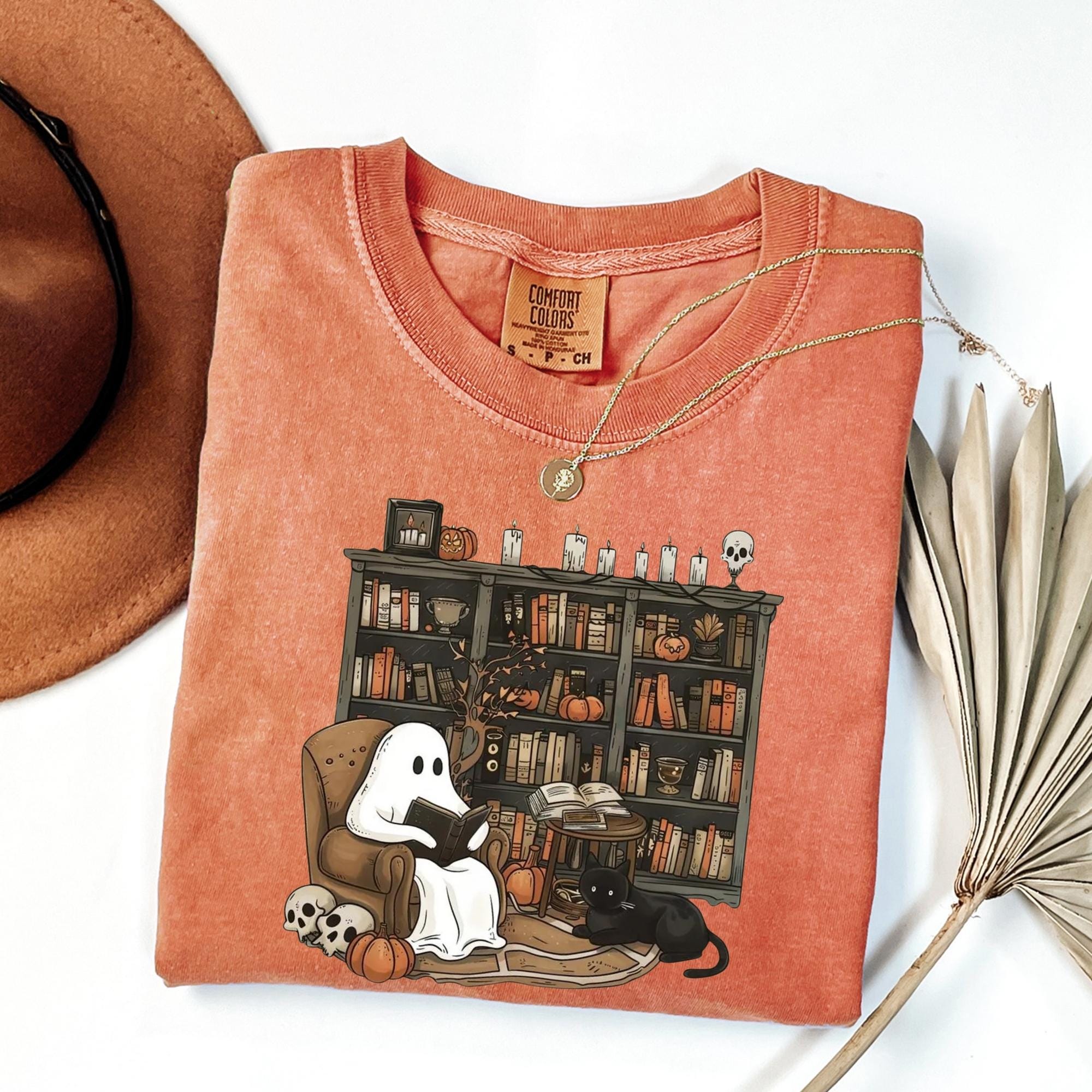 Comfort Colors® Retro Ghost Reading Books, Librarian Ghost, Halloween Teacher Sweatshirt, Halloween Shirt, Teacher Gift, Boo School