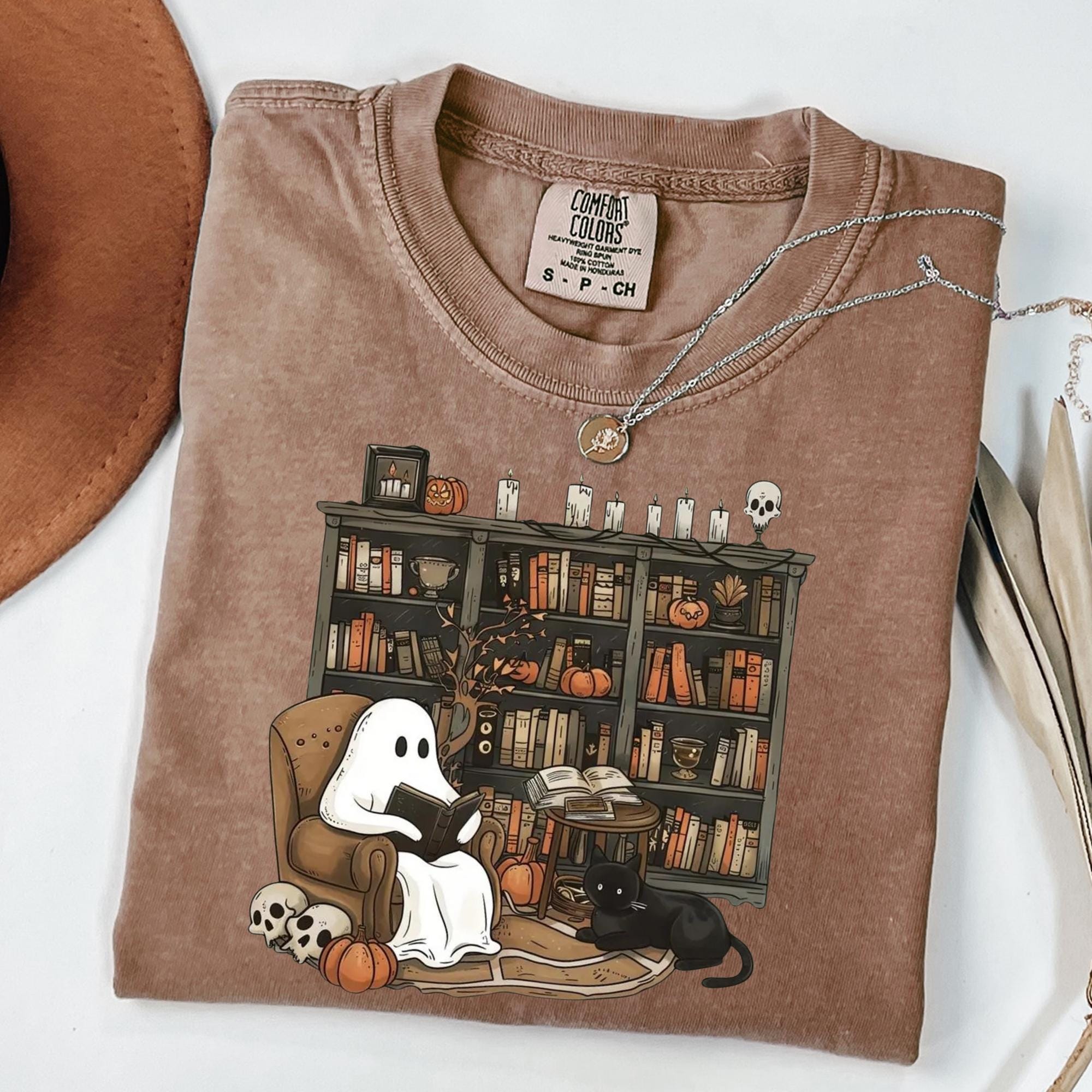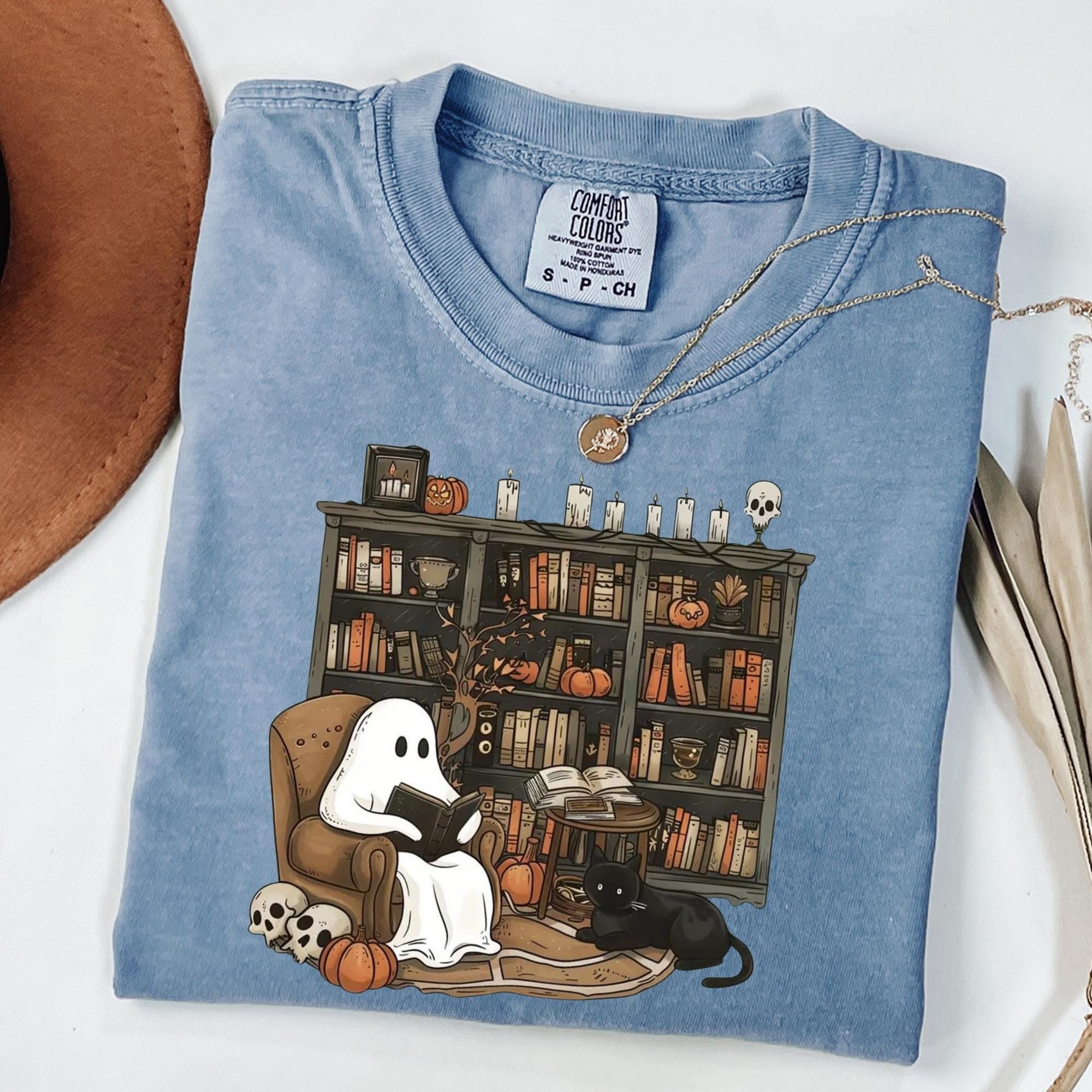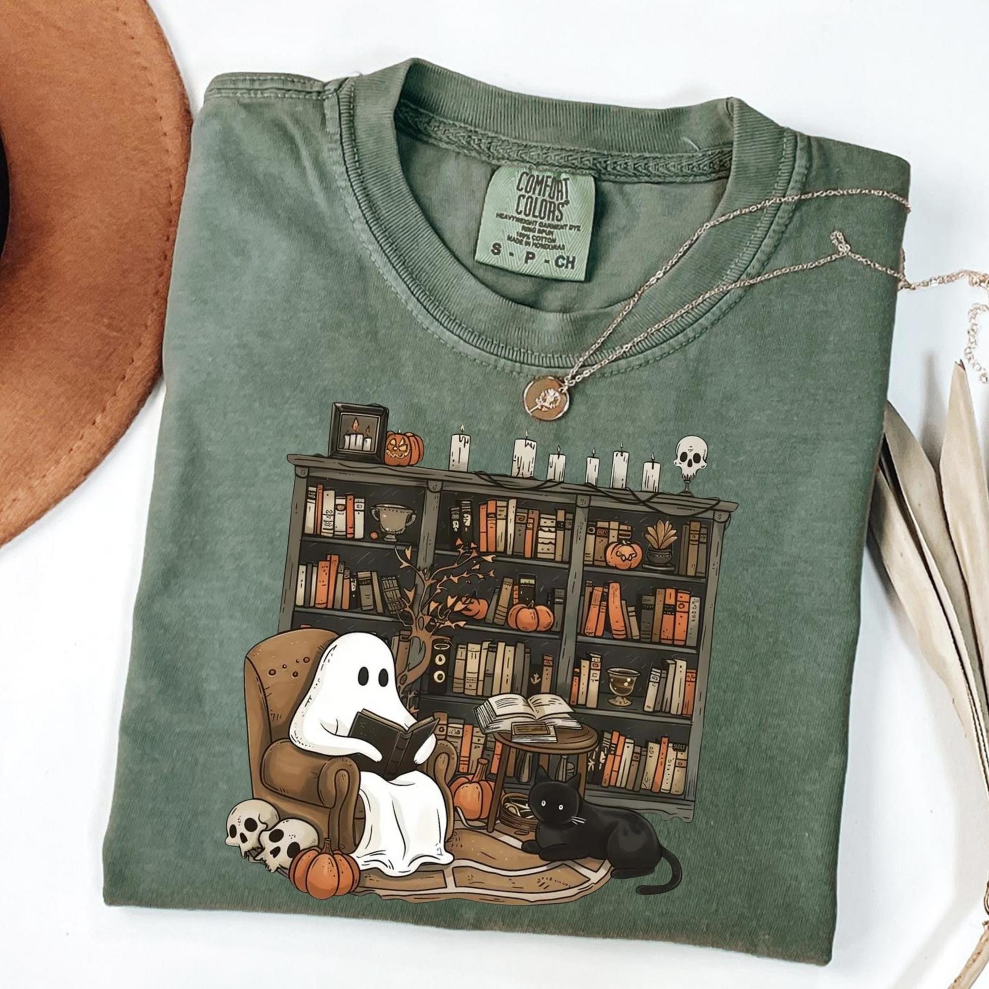 Comfort Colors® Retro Ghost Reading Books, Librarian Ghost, Halloween Teacher Sweatshirt, Halloween Shirt, Teacher Gift, Boo School