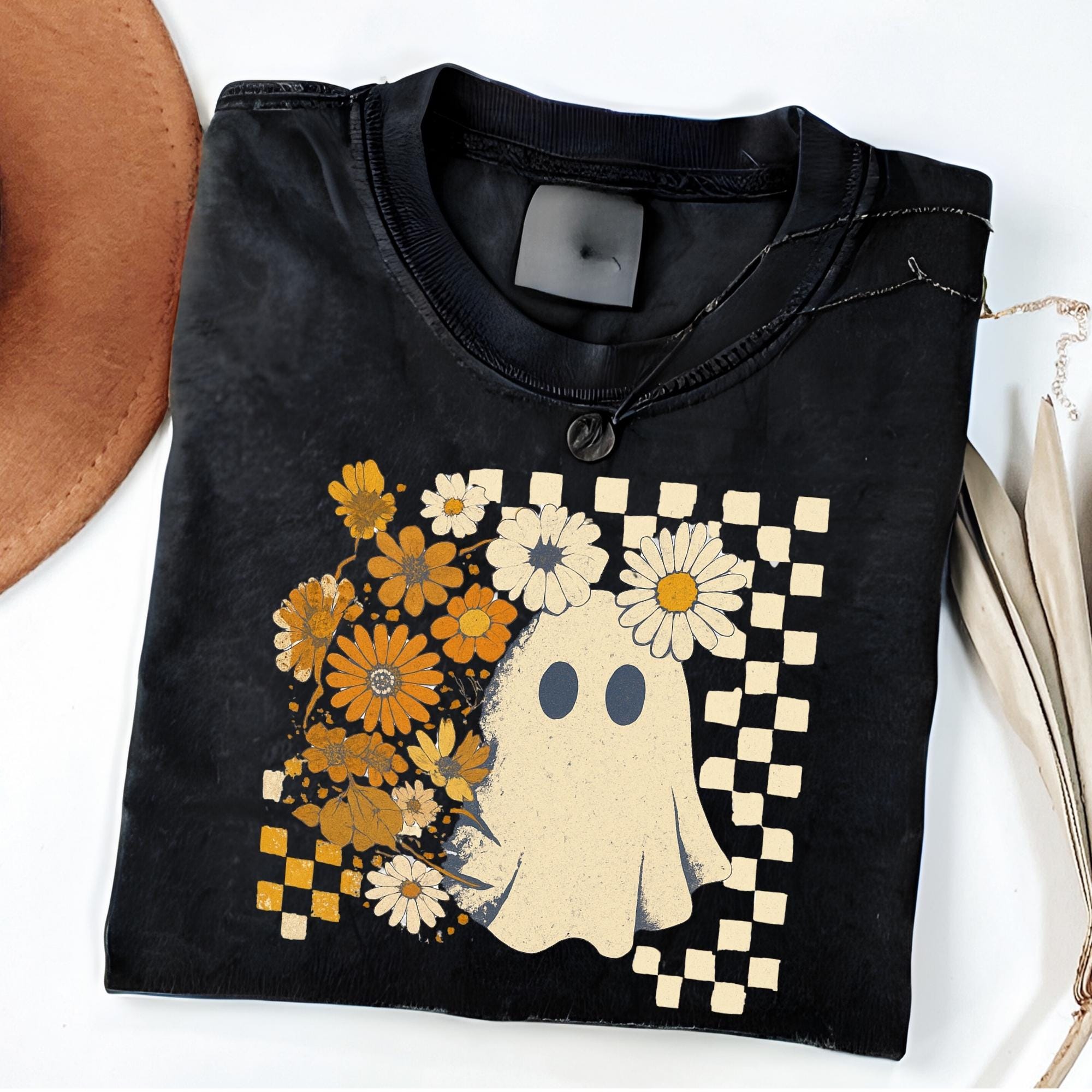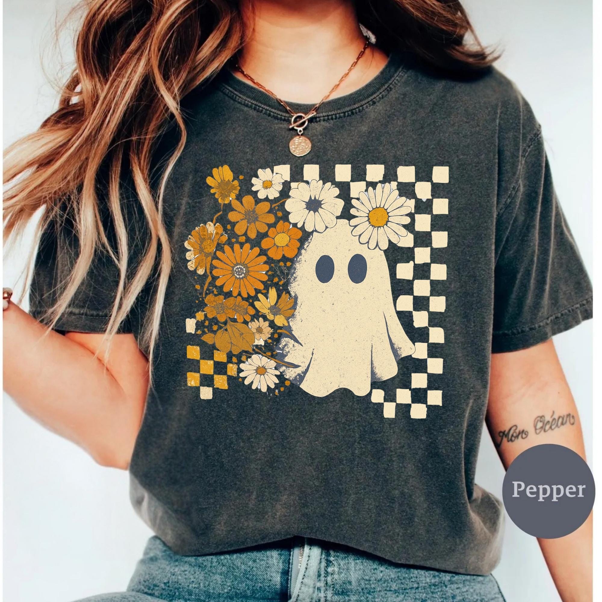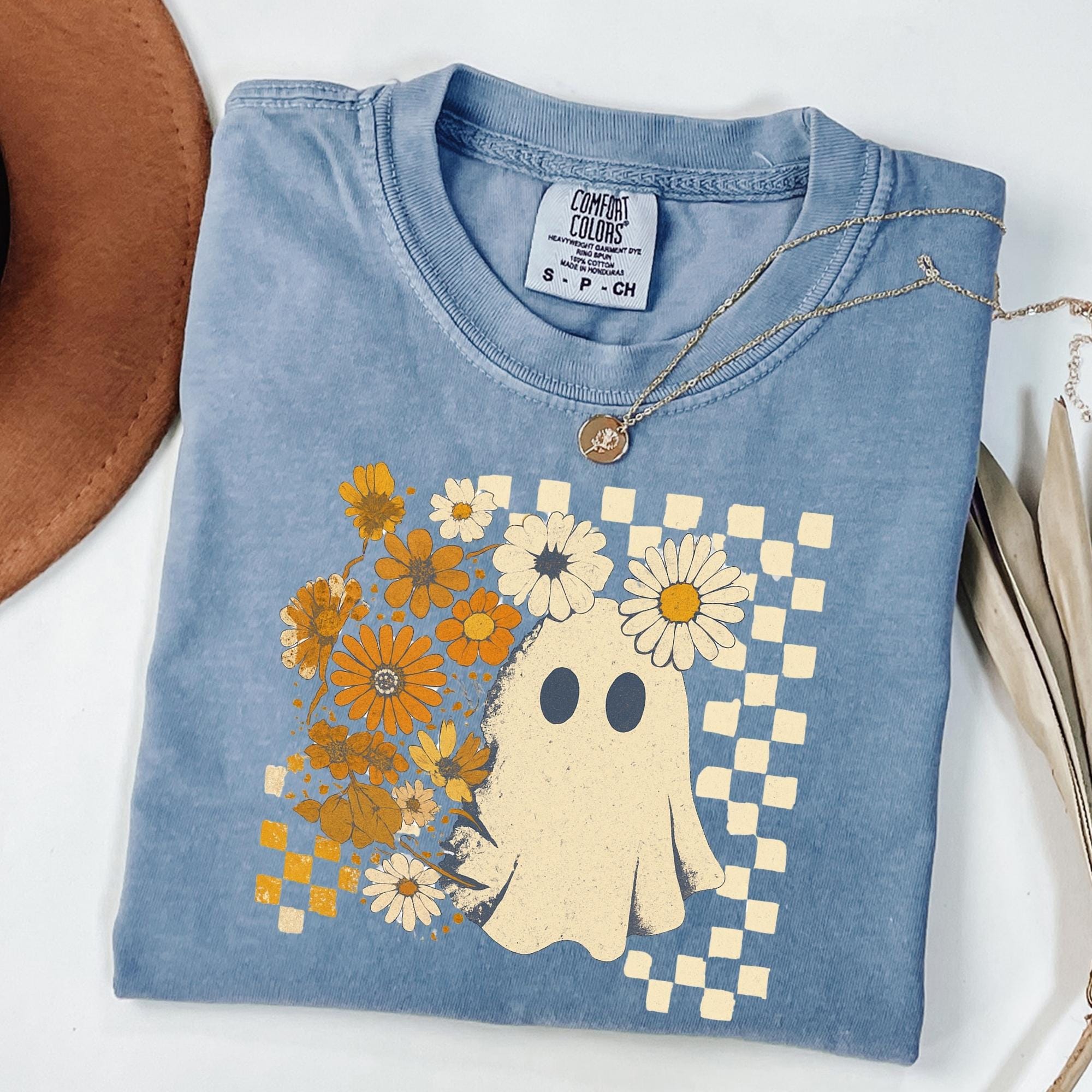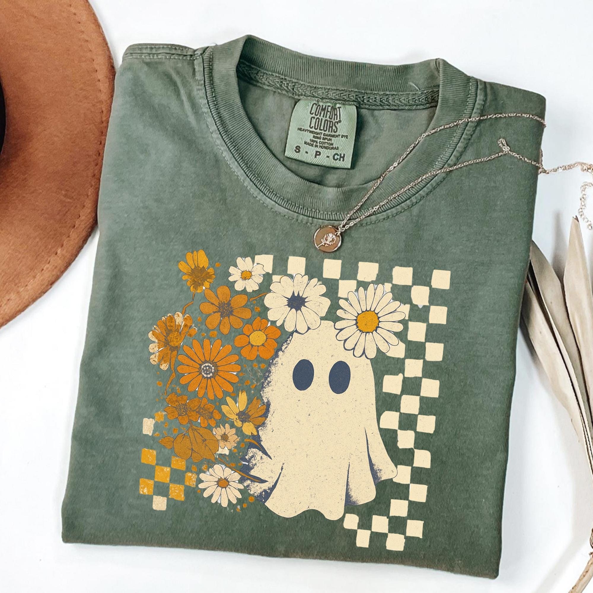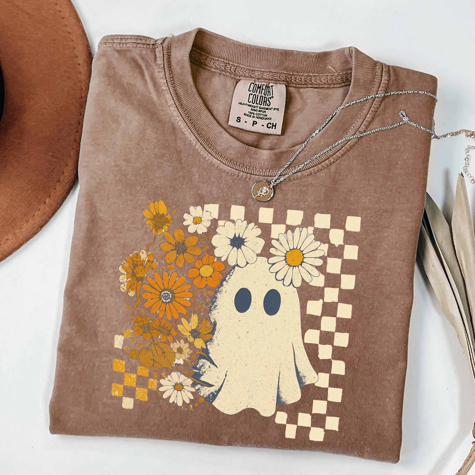 Comfort Colors® Checkered Ghost Shirt, Halloween Floral Ghost Shirt, Cute Fall Shirt, Cottagecore Ghost Tee