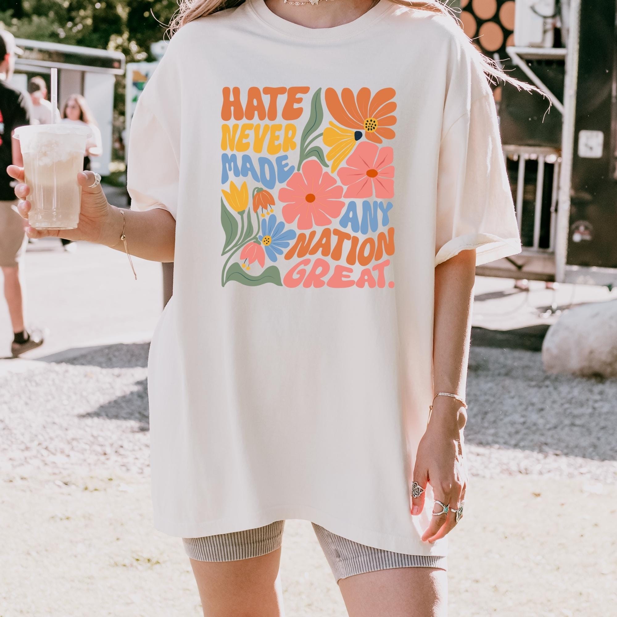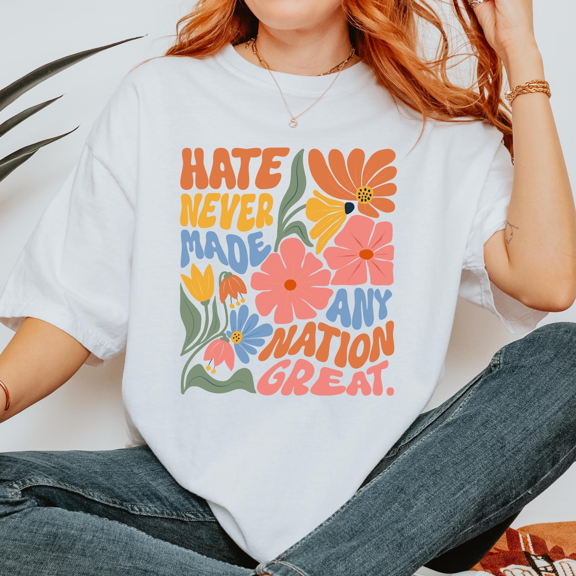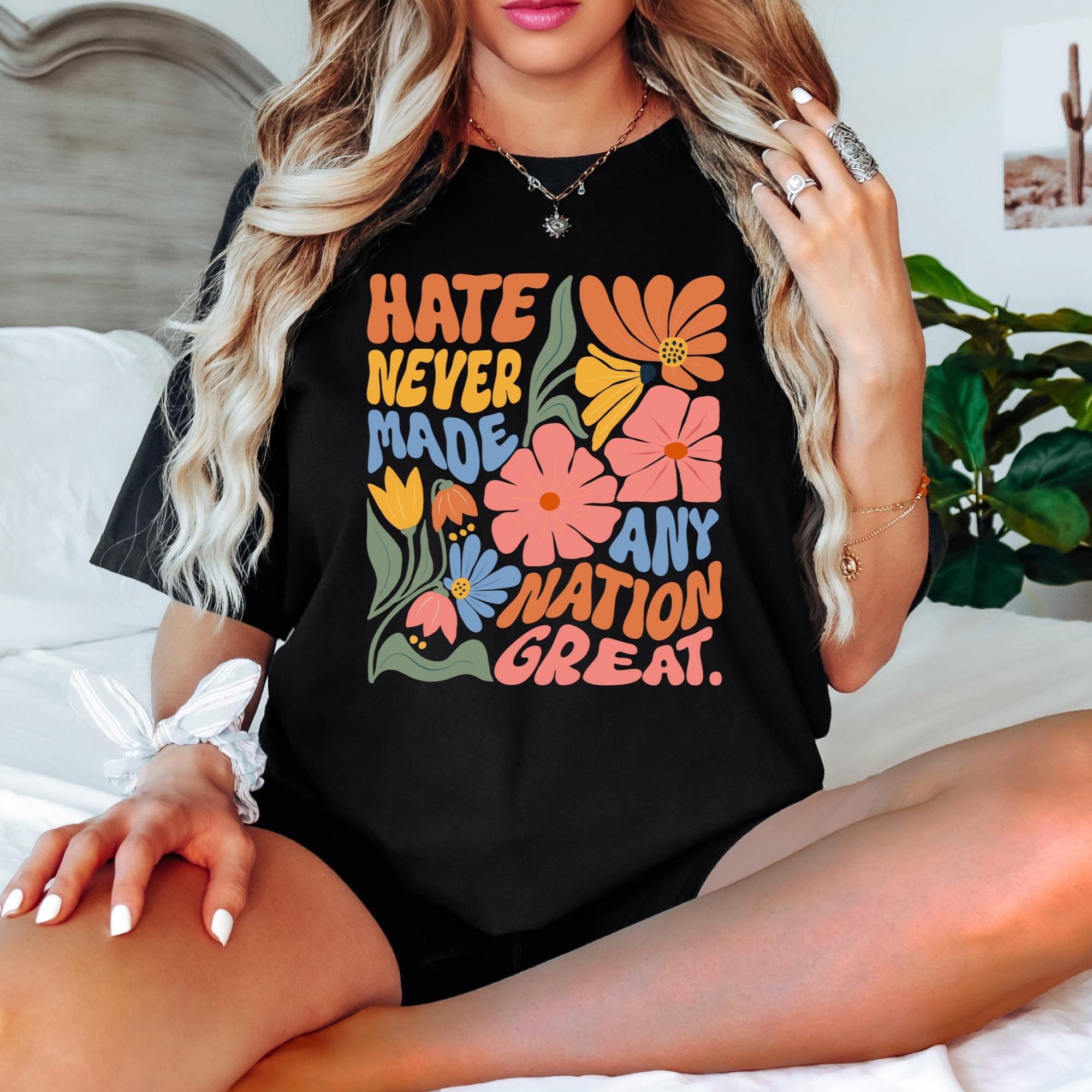Retro Flower TShirt, Hate Never Made Any Nation Great Graphic Tee, Positive Message Shirt, Peace Love Equality Top, Comfort Colors Shirt Express positivity and unity with this retro floral graphic tee. Featuring the bold message “Hate Never Made Any Nation Great”, this shirt combines vibrant flower designs with a powerful statement. Perfect for activists, peace lovers, and anyone who believes in equality and kindness. Great gift for women, men, and teens who want to spread love, not hate.