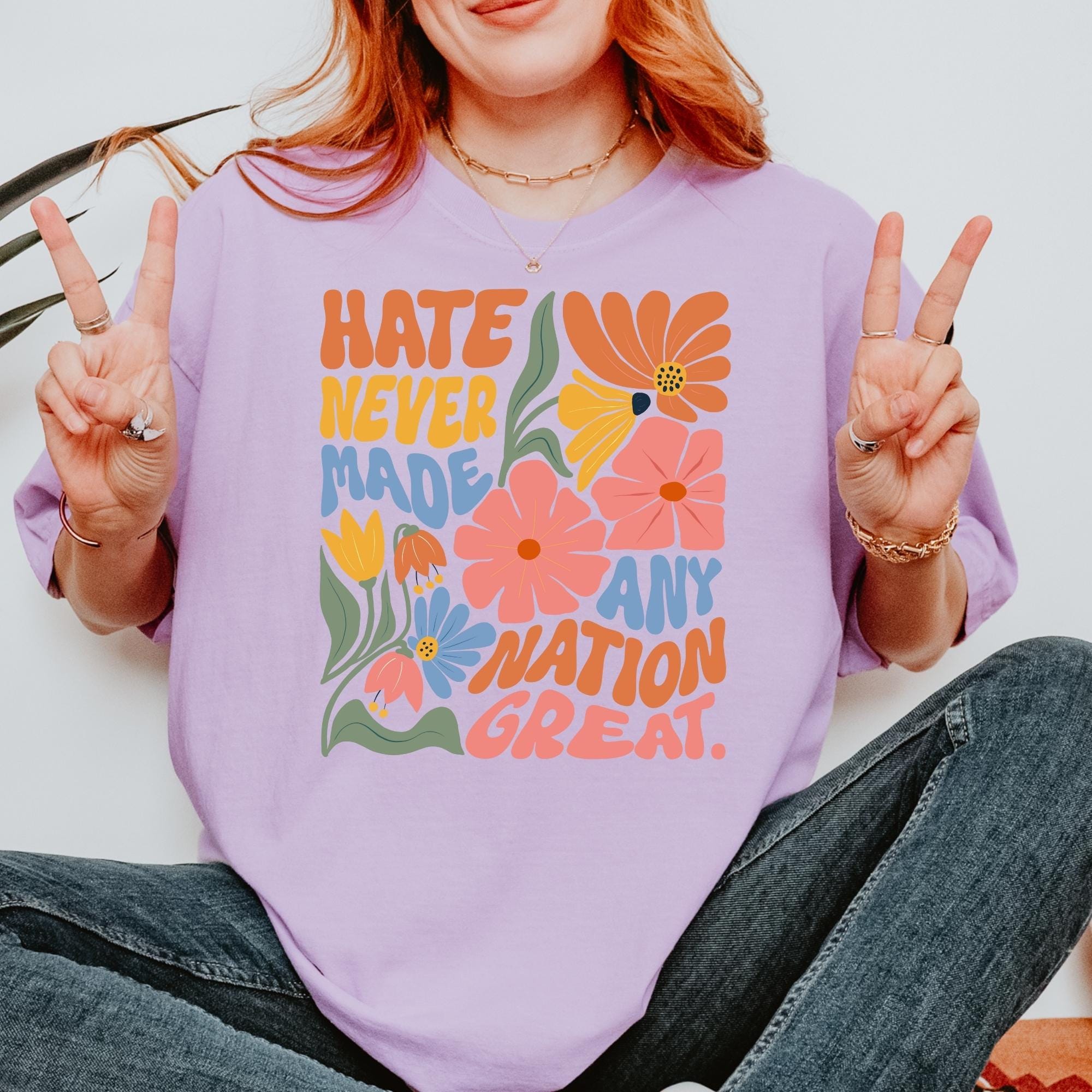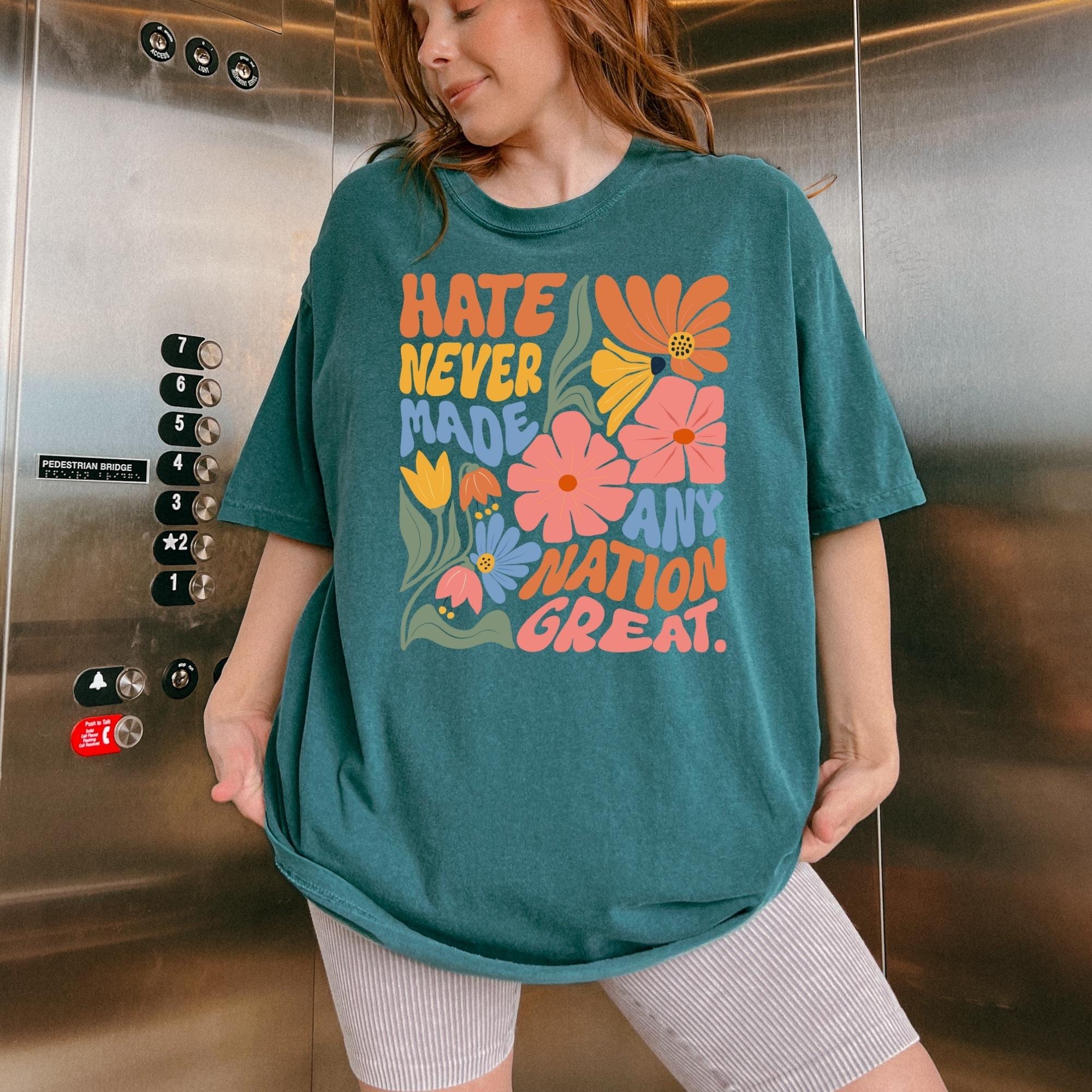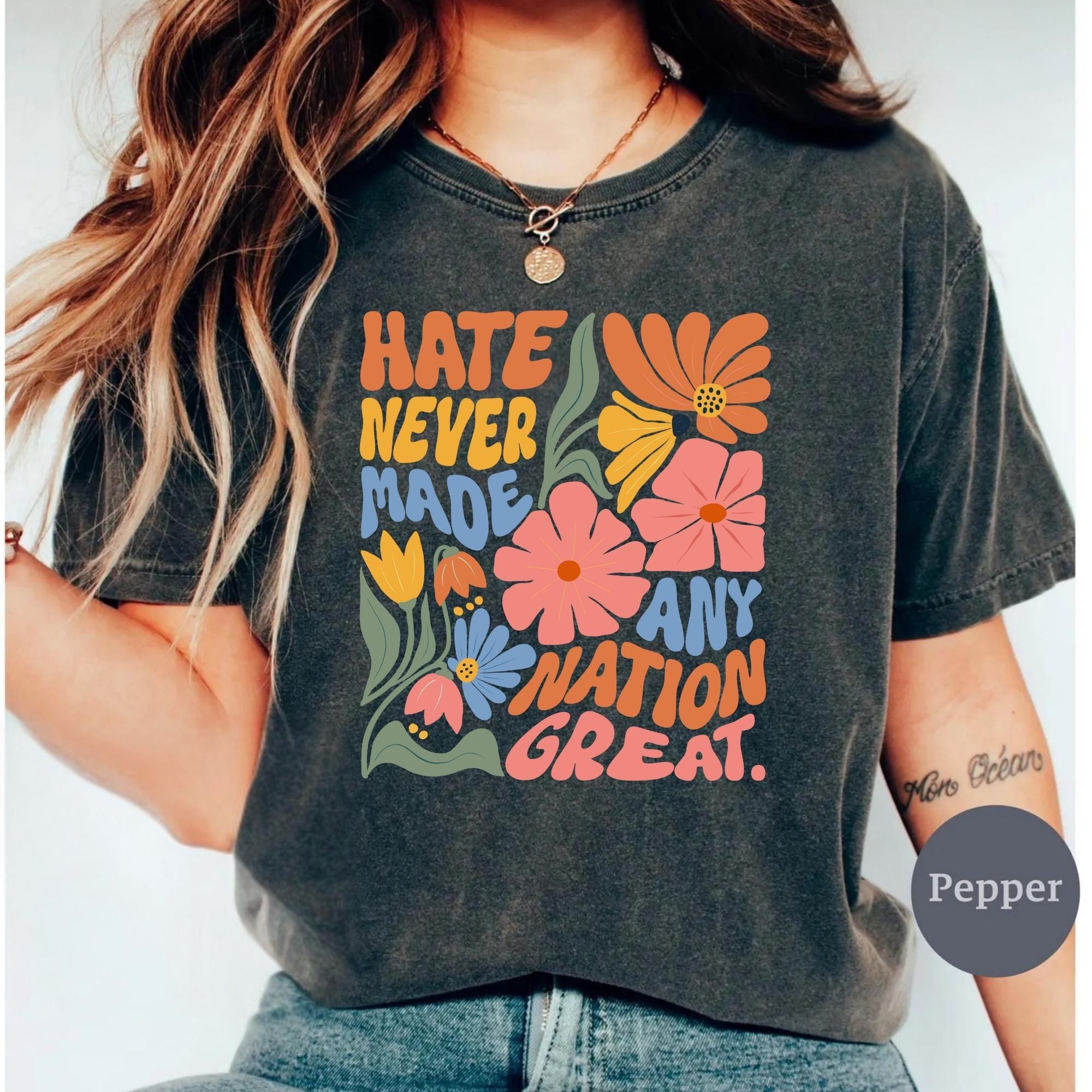 Retro Flower TShirt, Hate Never Made Any Nation Great Graphic Tee, Positive Message Shirt, Peace Love Equality Top, Comfort Colors Shirt Express positivity and unity with this retro floral graphic tee. Featuring the bold message “Hate Never Made Any Nation Great”, this shirt combines vibrant flower designs with a powerful statement. Perfect for activists, peace lovers, and anyone who believes in equality and kindness. Great gift for women, men, and teens who want to spread love, not hate.