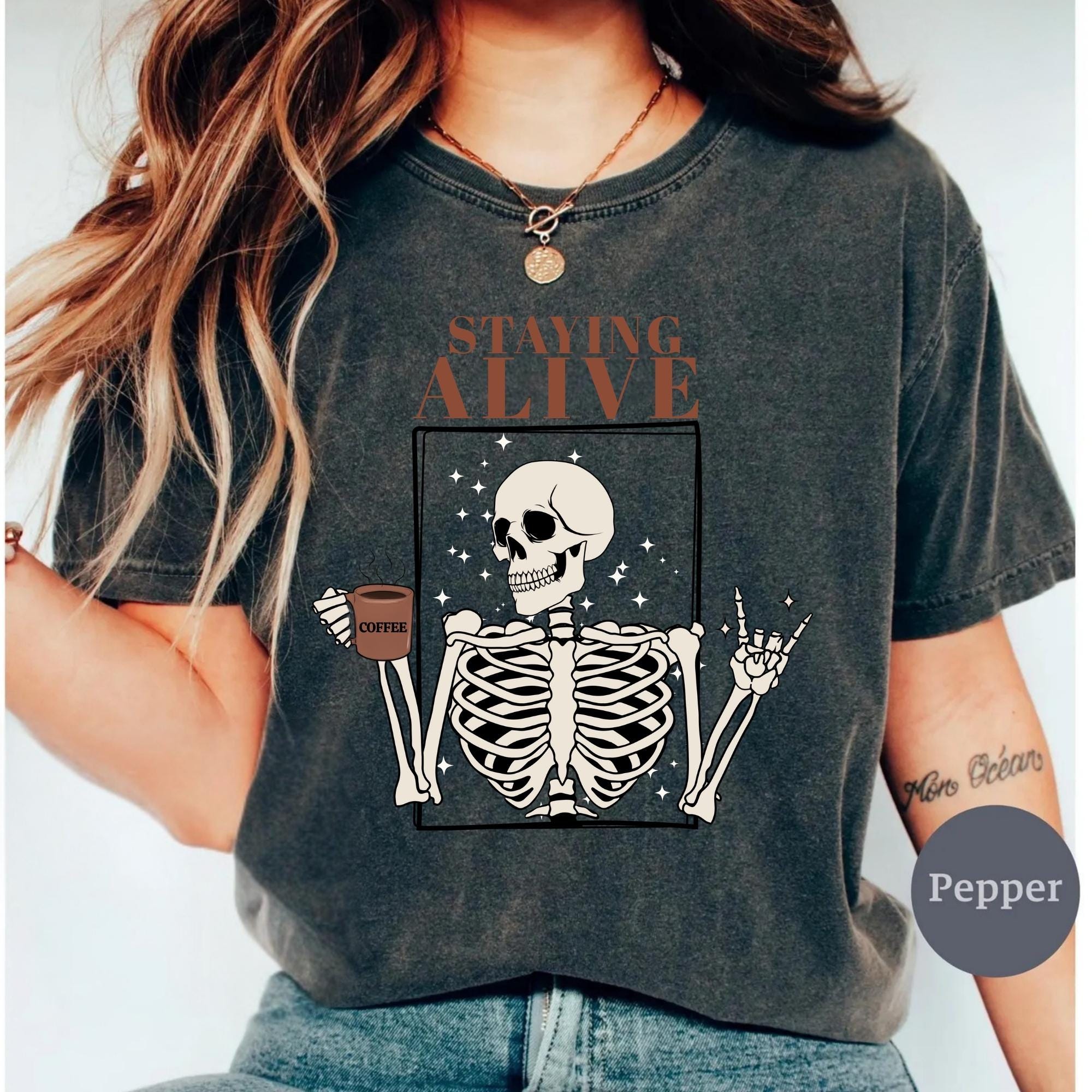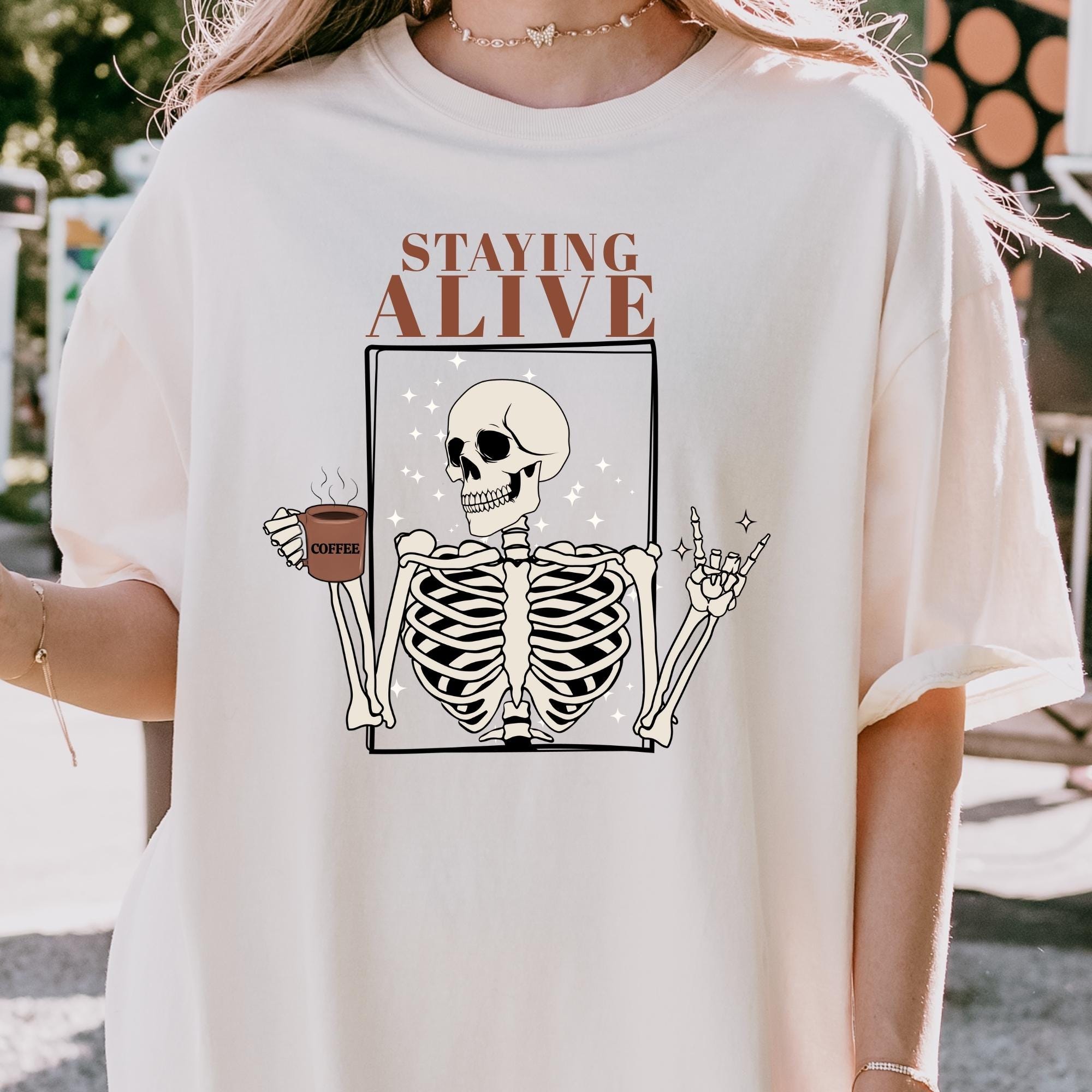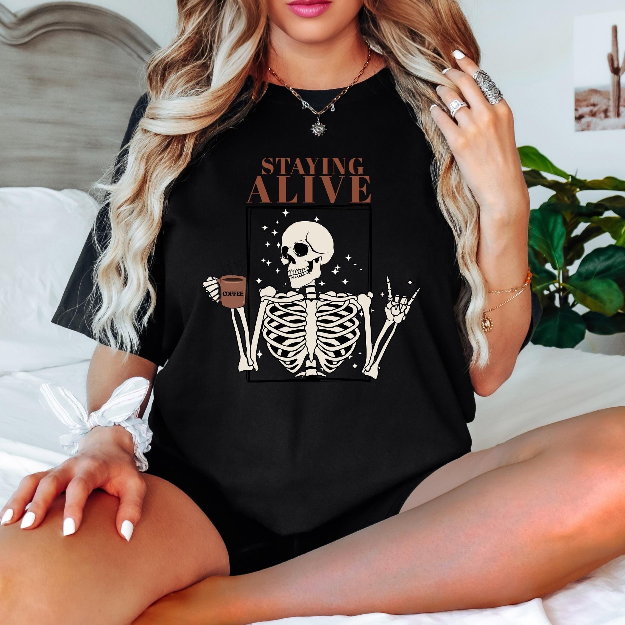 Staying Alive Shirt, Trendy Coffee Shirt, Funny Skeleton T-Shirt, Coffee Lovers Gift Skull retro Halloween Tshirt Women Comfort Colors Tee
