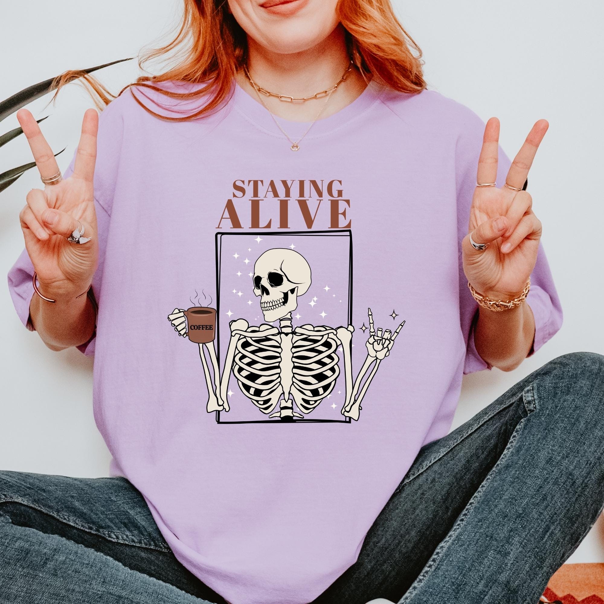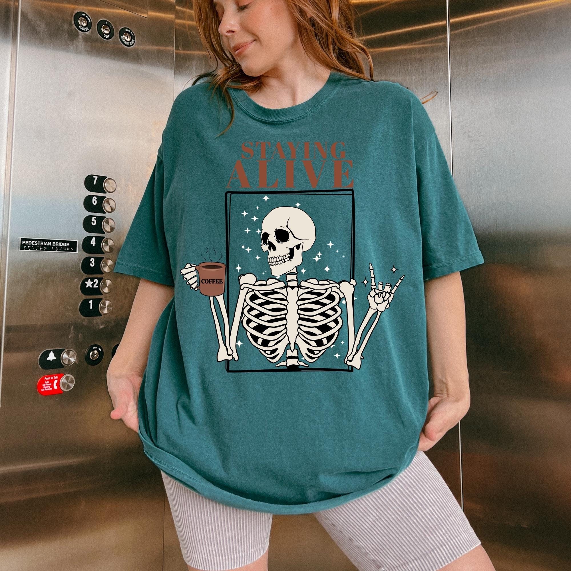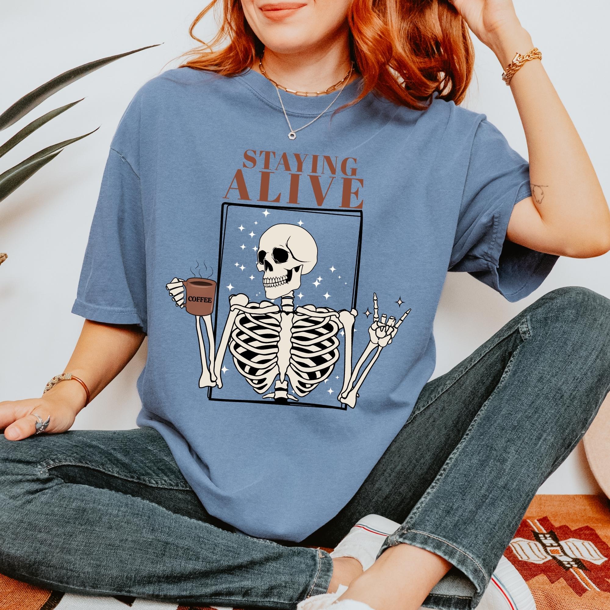 Staying Alive Shirt, Trendy Coffee Shirt, Funny Skeleton T-Shirt, Coffee Lovers Gift Skull retro Halloween Tshirt Women Comfort Colors Tee