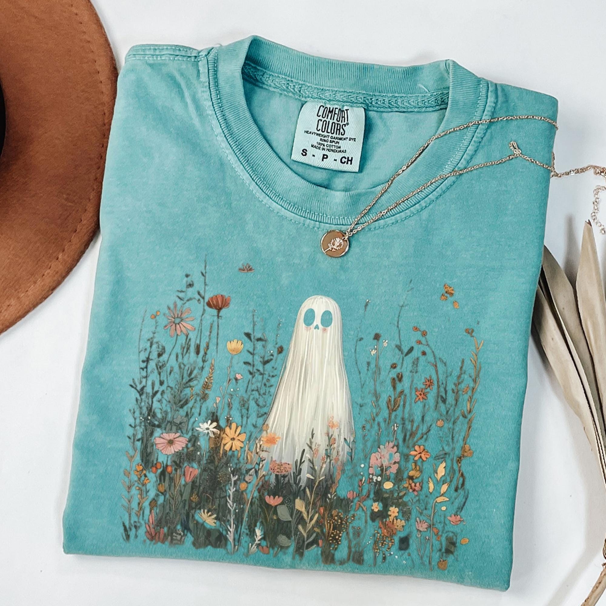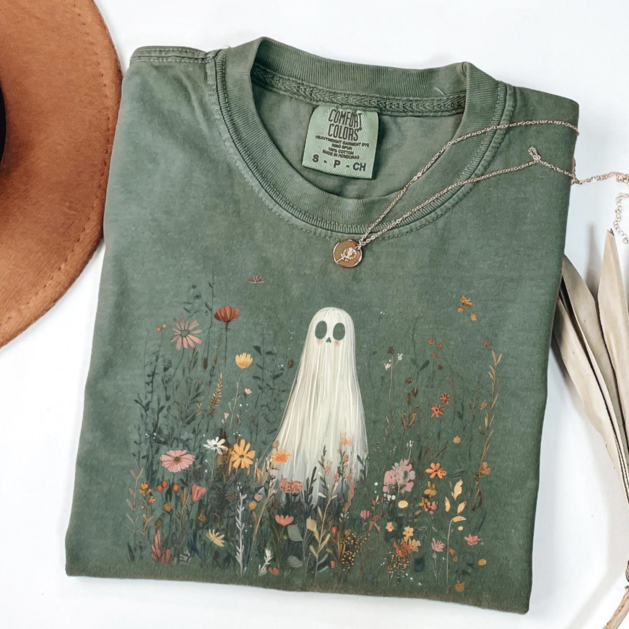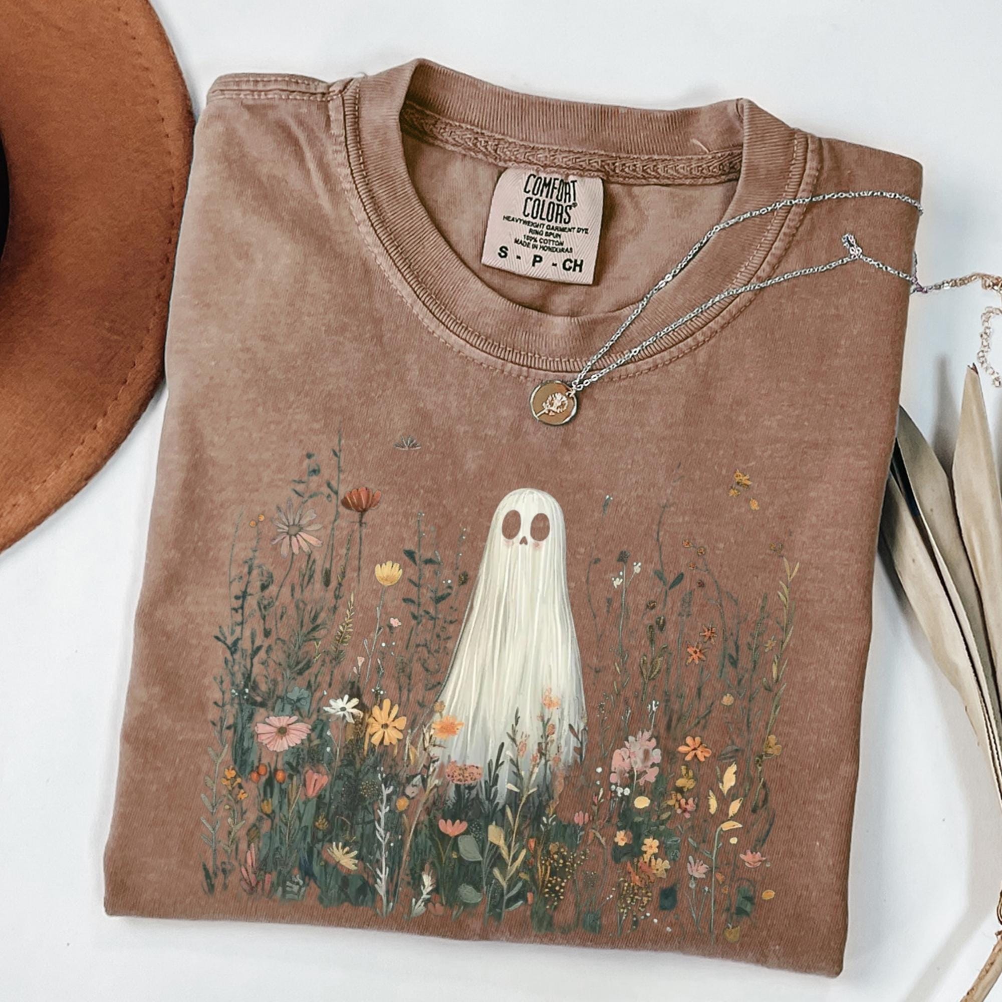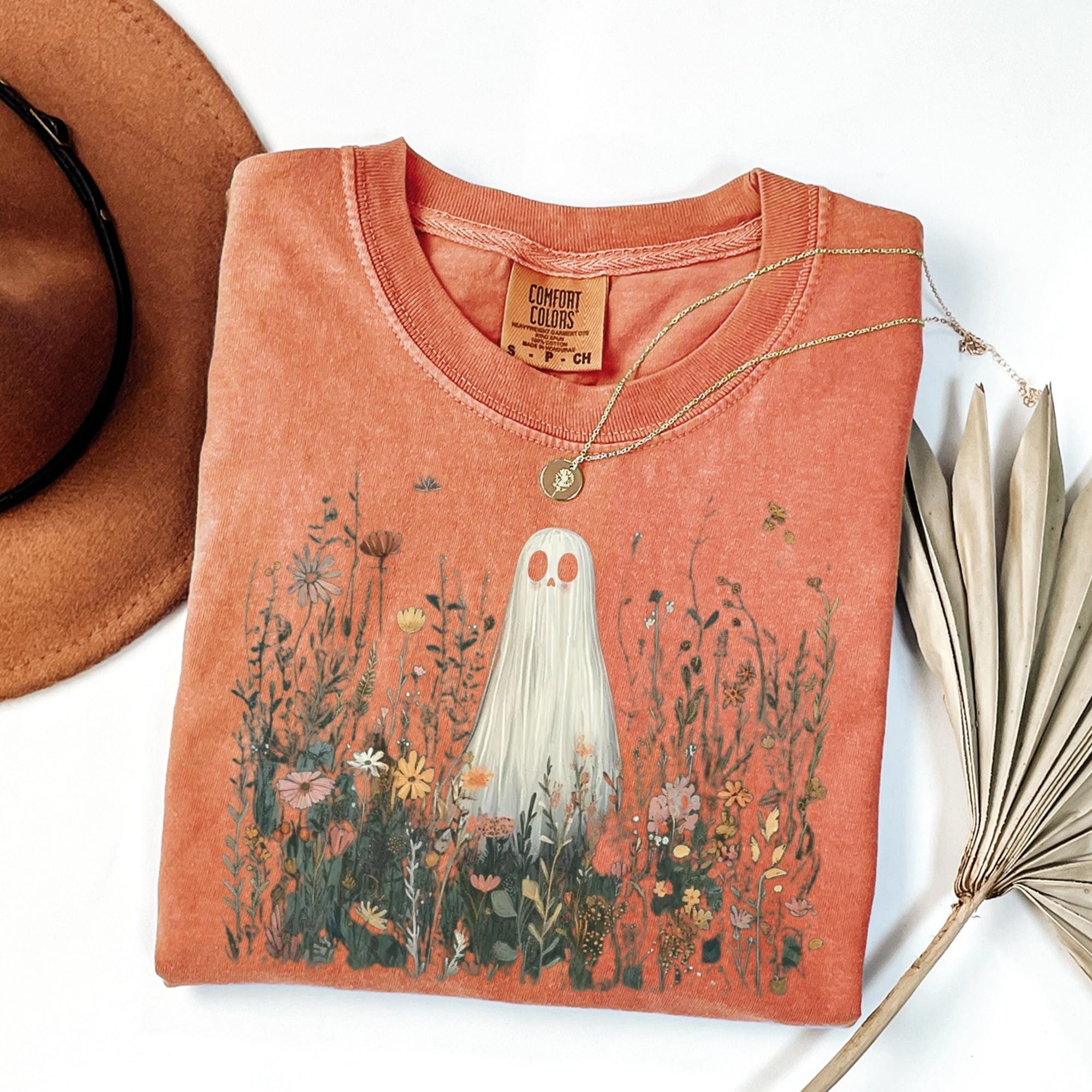 Comfort Colors® Cute Ghost in Wildflowers Shirt Spooky Fall Aesthetic Halloween Floral Tee Retro October Graphic T-Shirt Cozy Ghostcore Gift