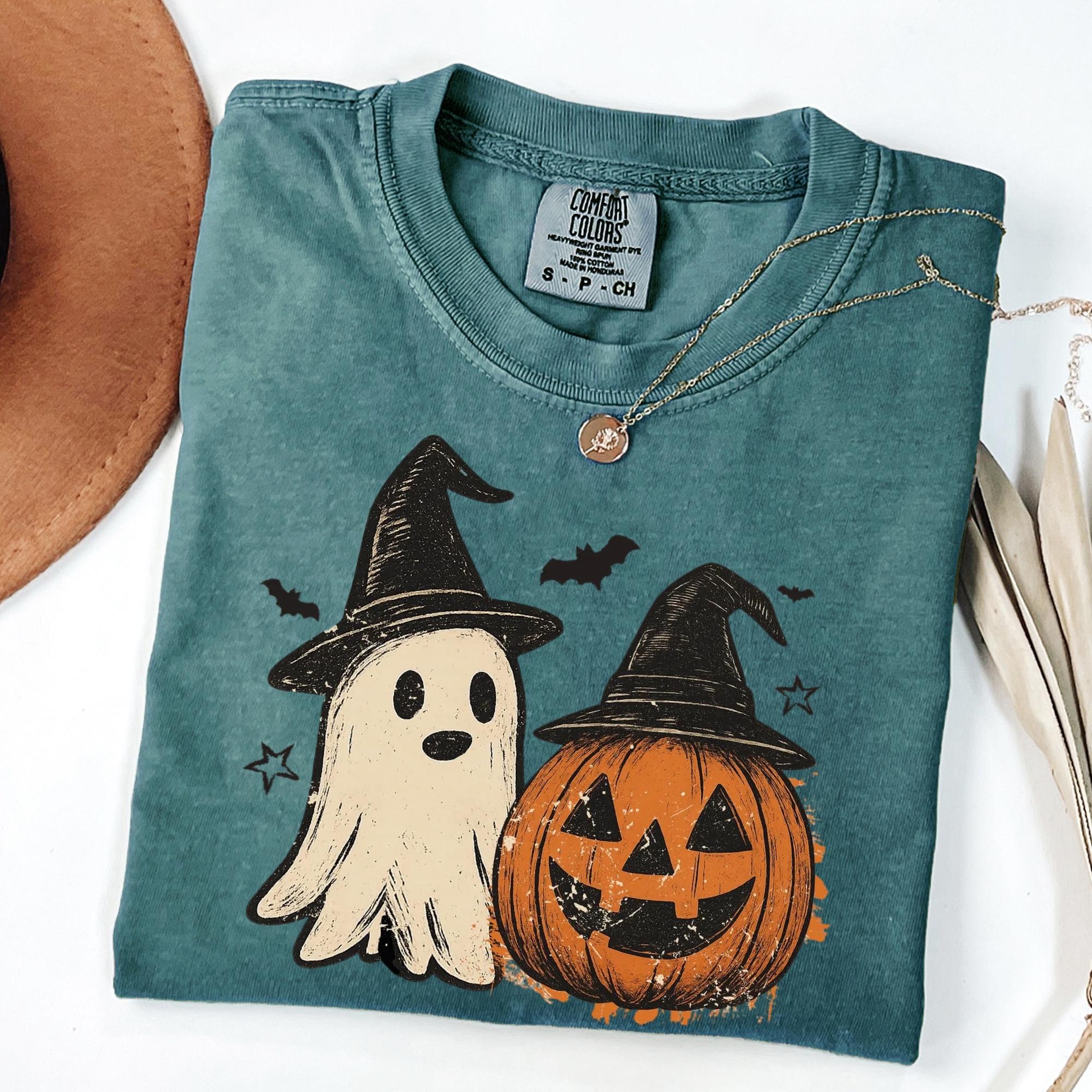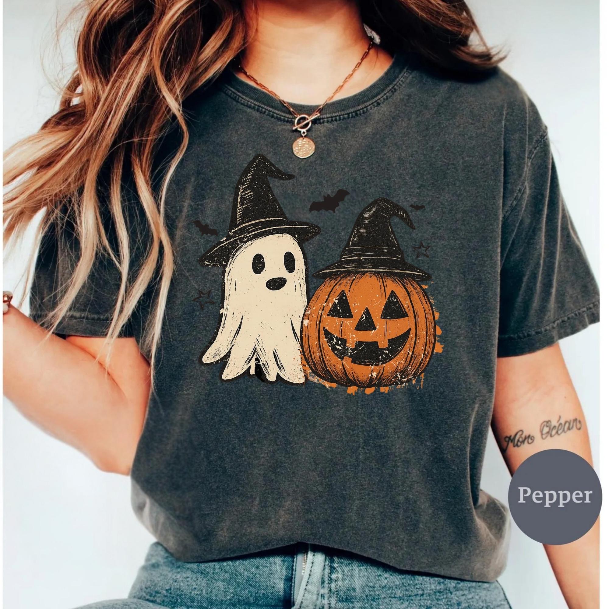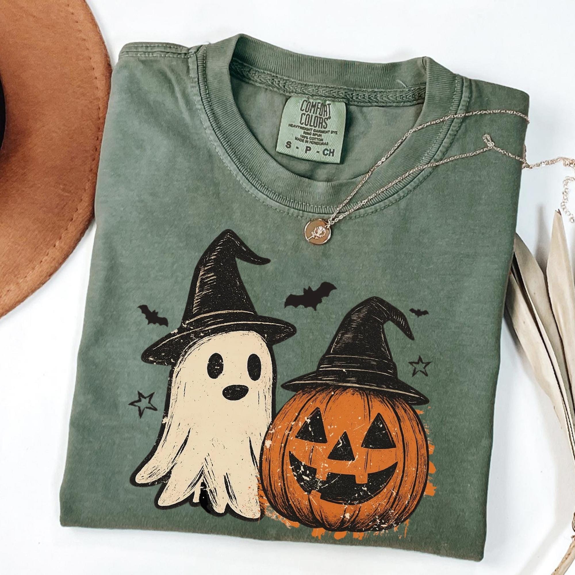 Spooky Ghost Halloween Comfort Colors Shirt, Preppy Floral Pumpkin Tee, Spooky Season T-Shirt, Ghost Aesthetic Tee Floral Patchwork Shirt