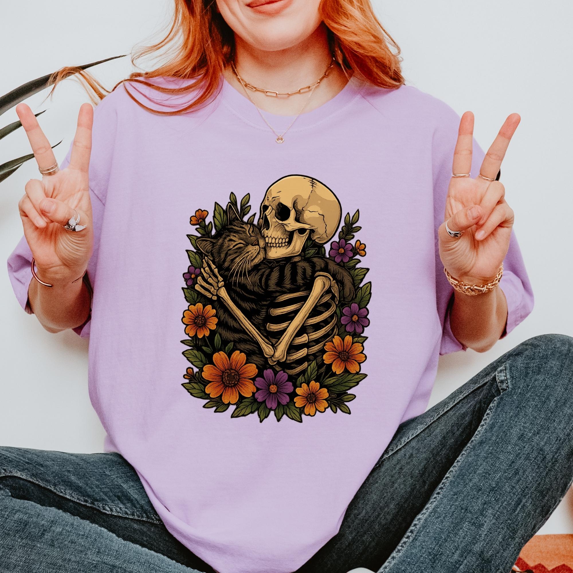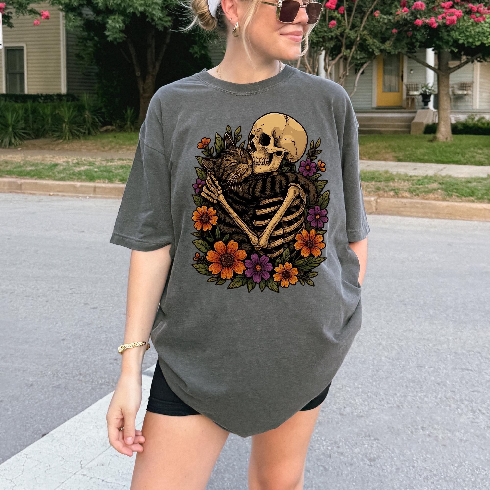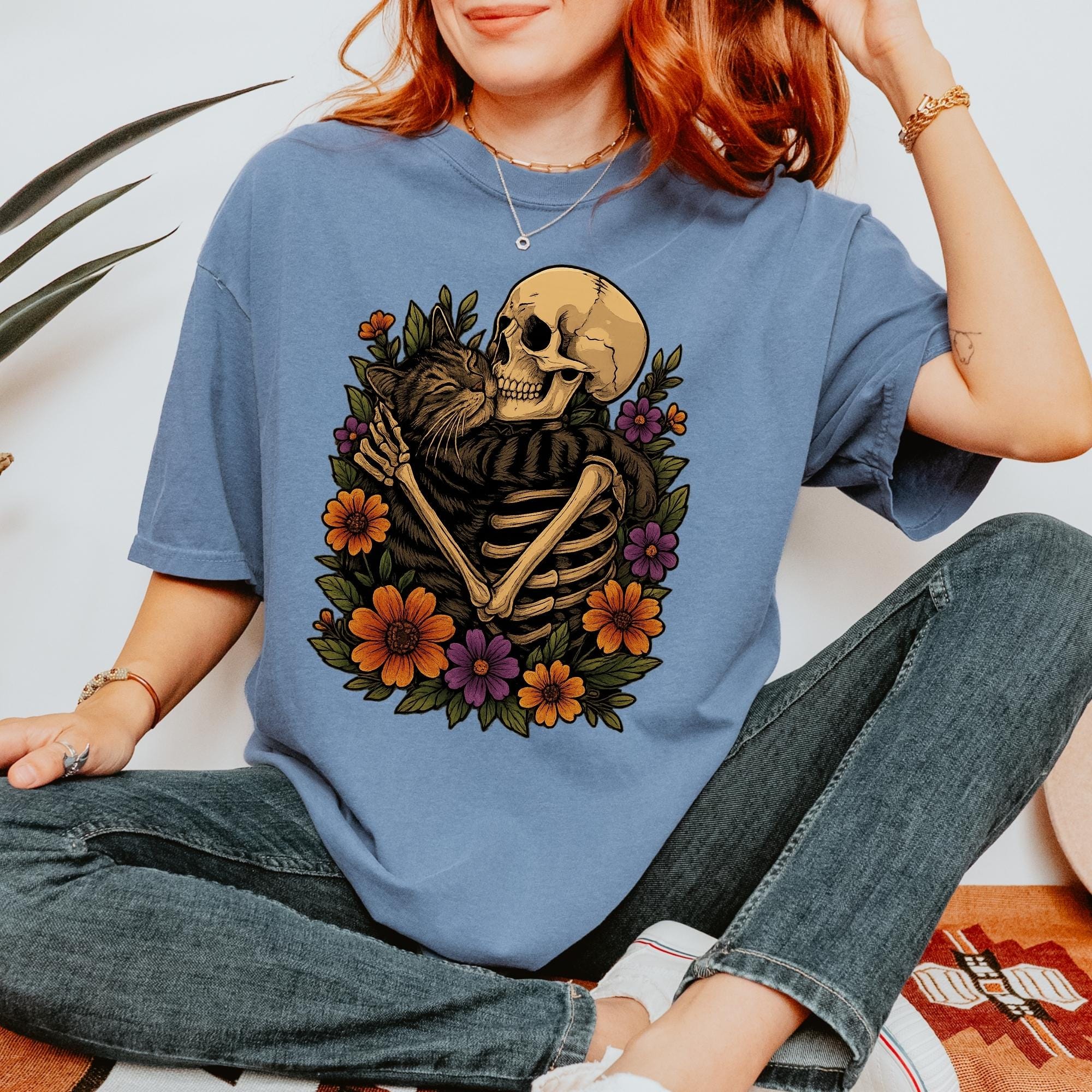 Skeleton Hugging Cat Floral Halloween Comfort Colors® Shirt Cute Spooky Unisex Shirt – Unique Gift Idea for Cat Lovers