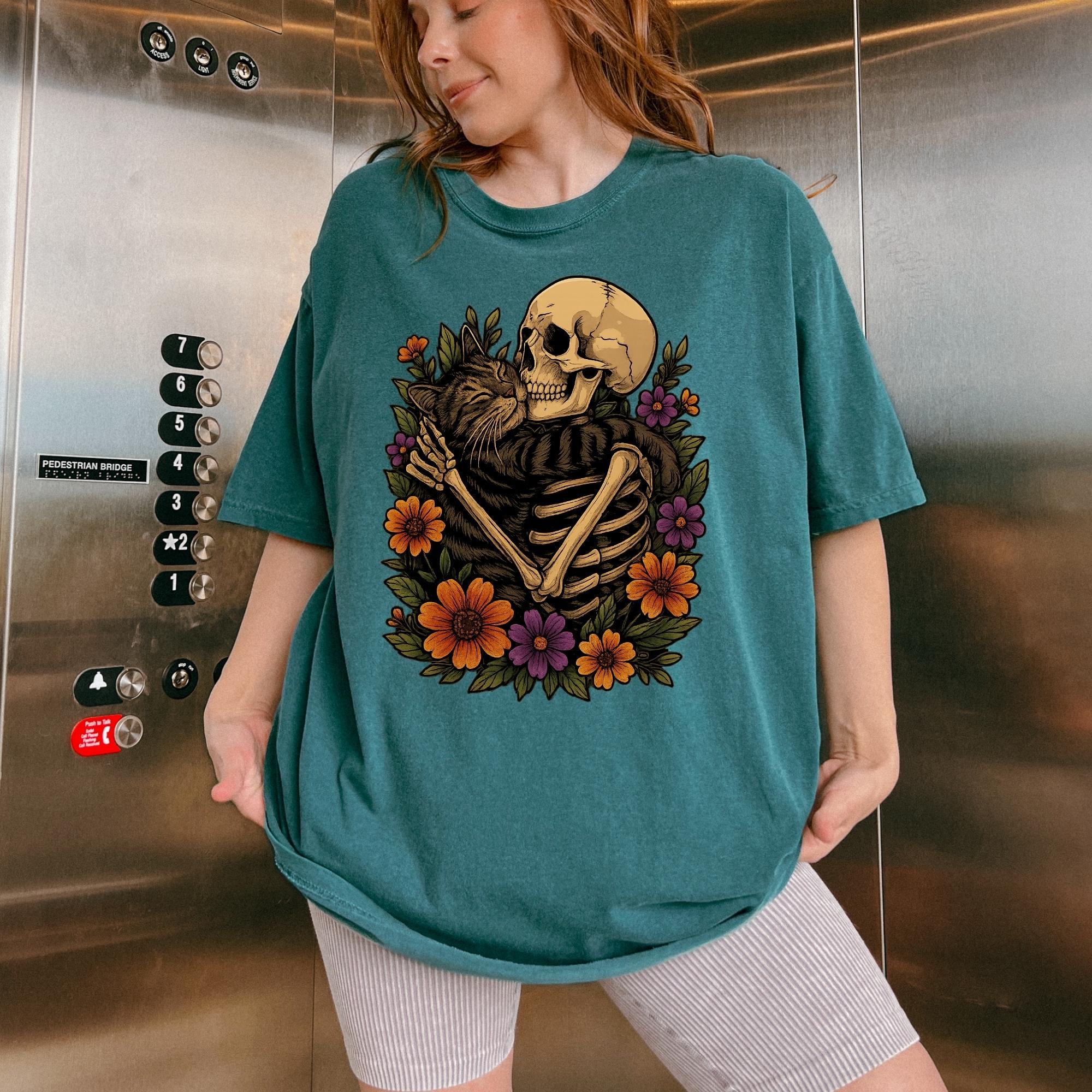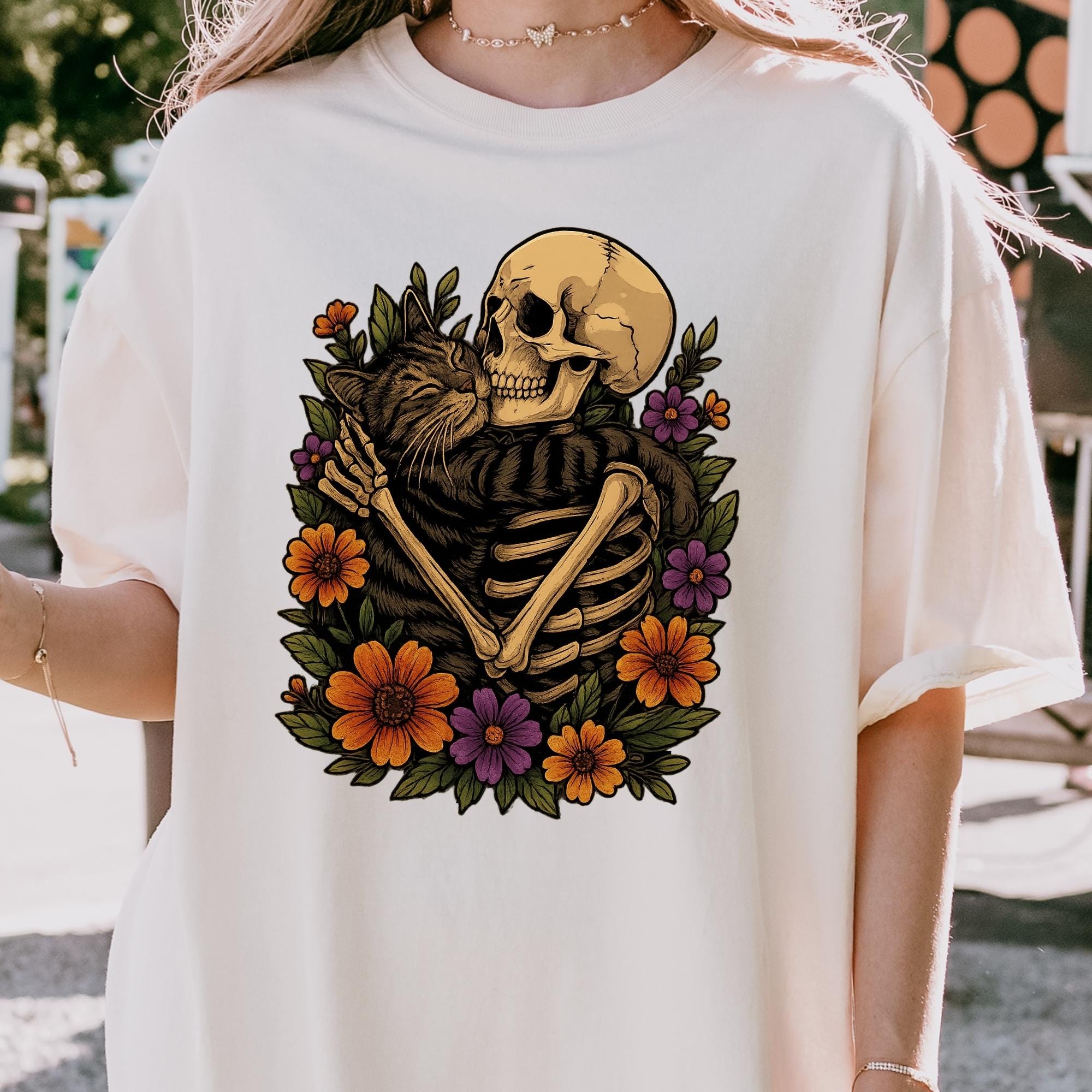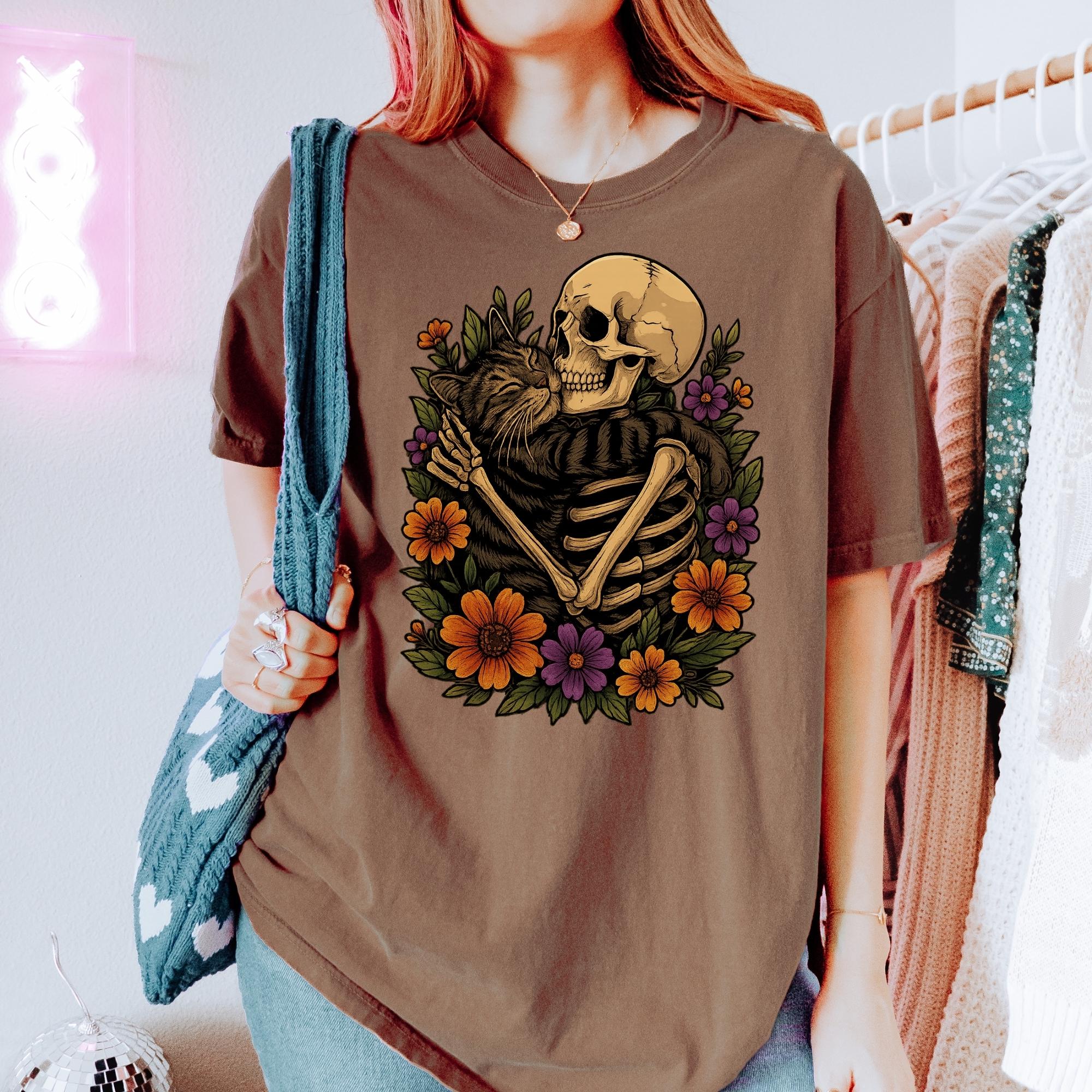 Skeleton Hugging Cat Floral Halloween Comfort Colors® Shirt Cute Spooky Unisex Shirt – Unique Gift Idea for Cat Lovers