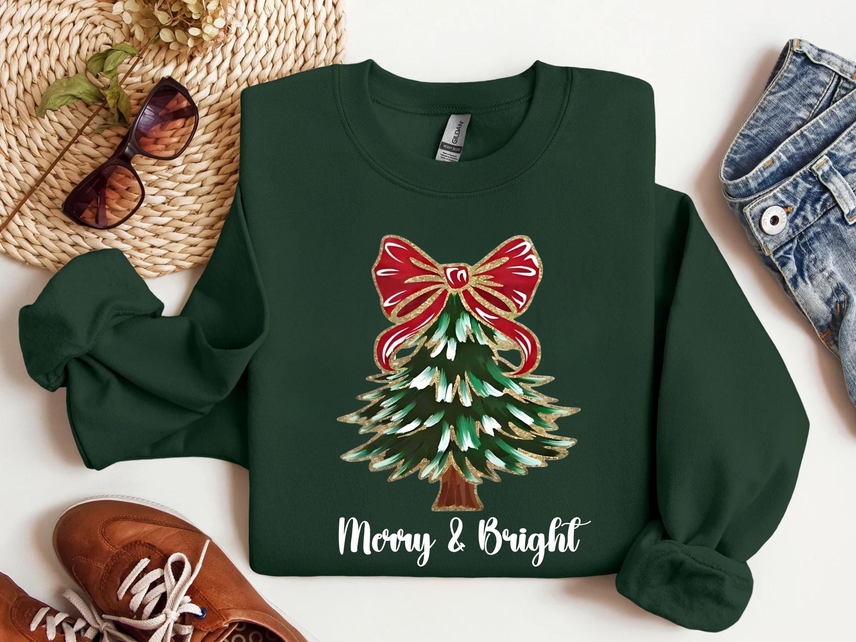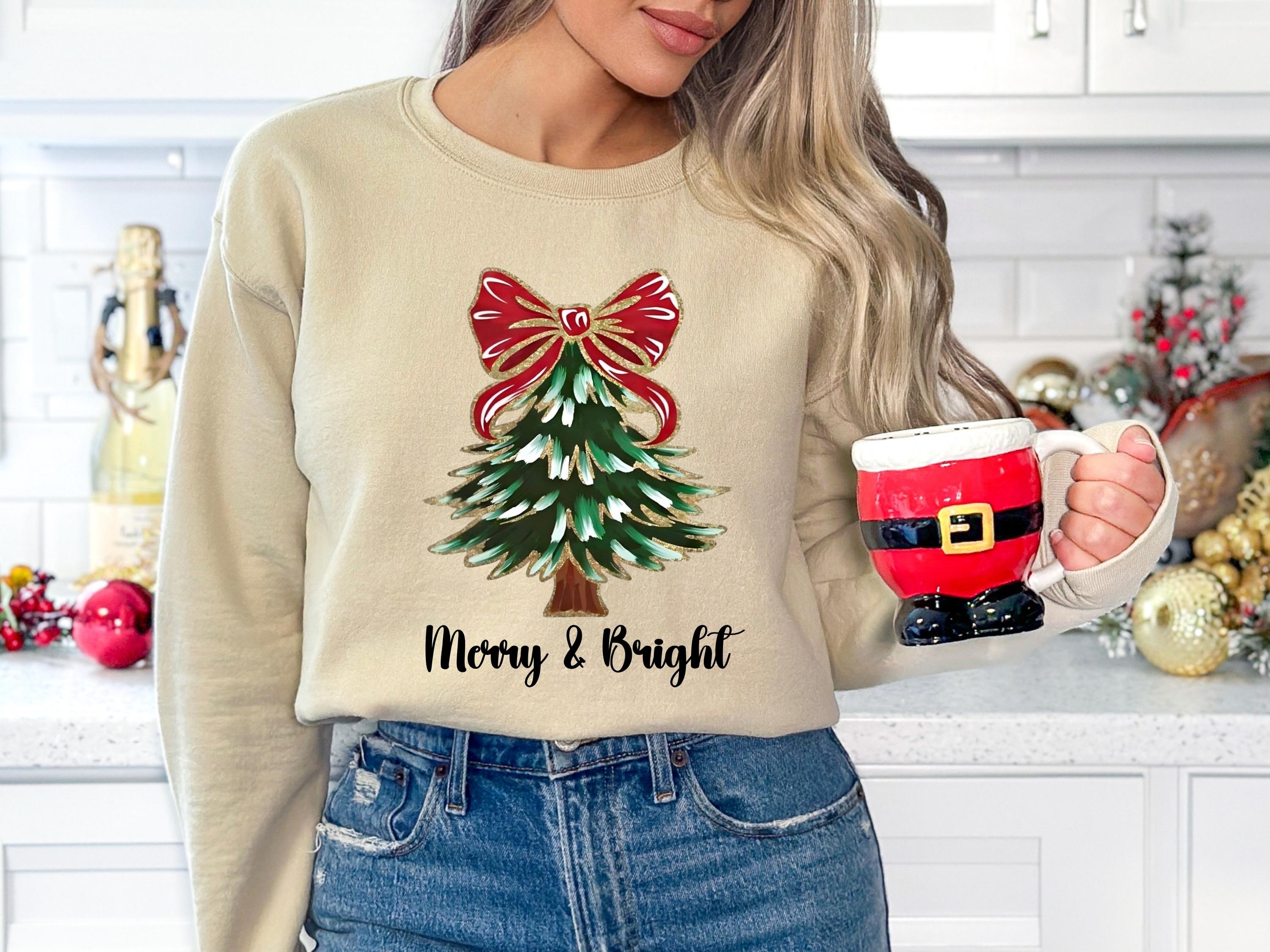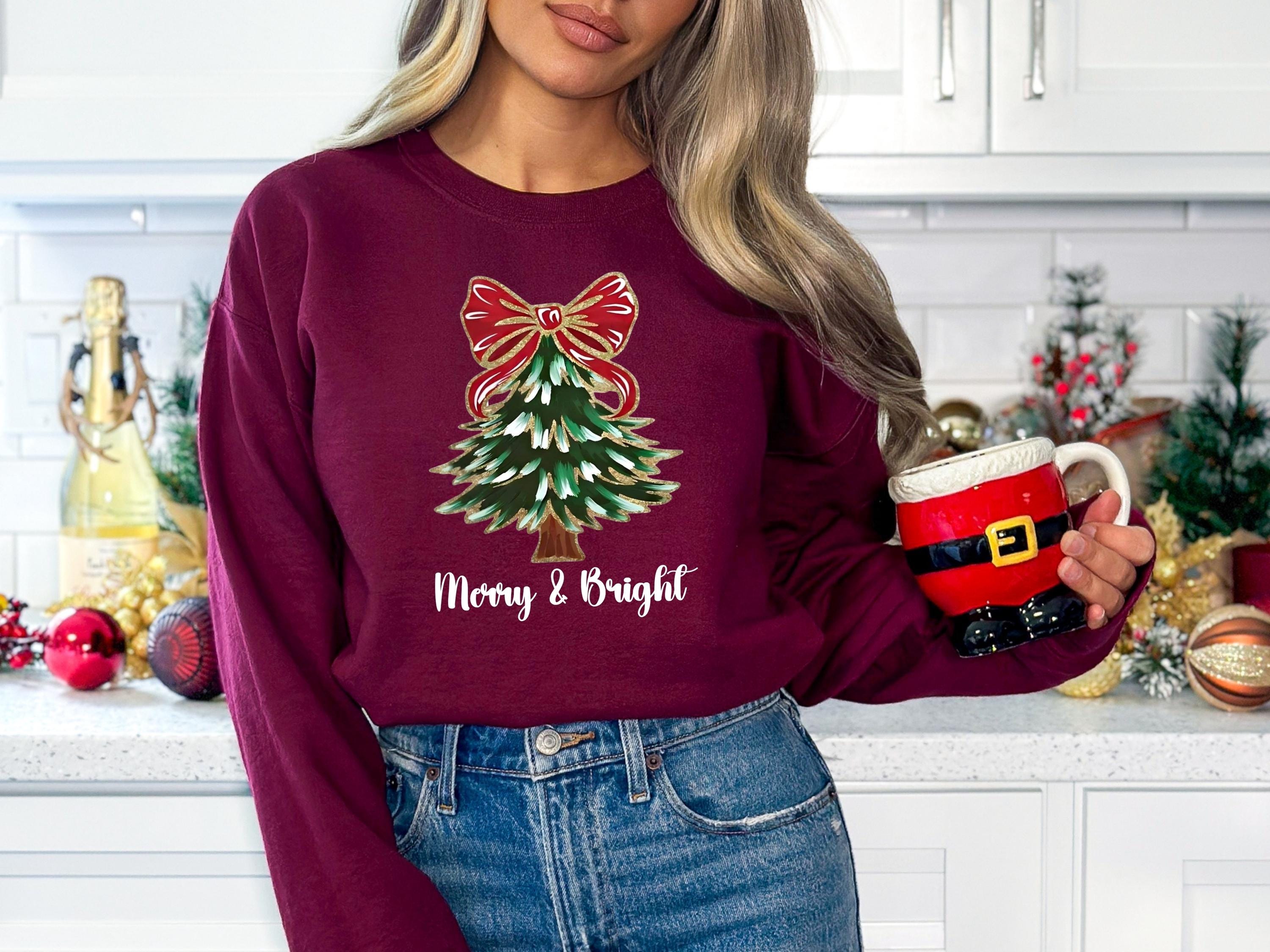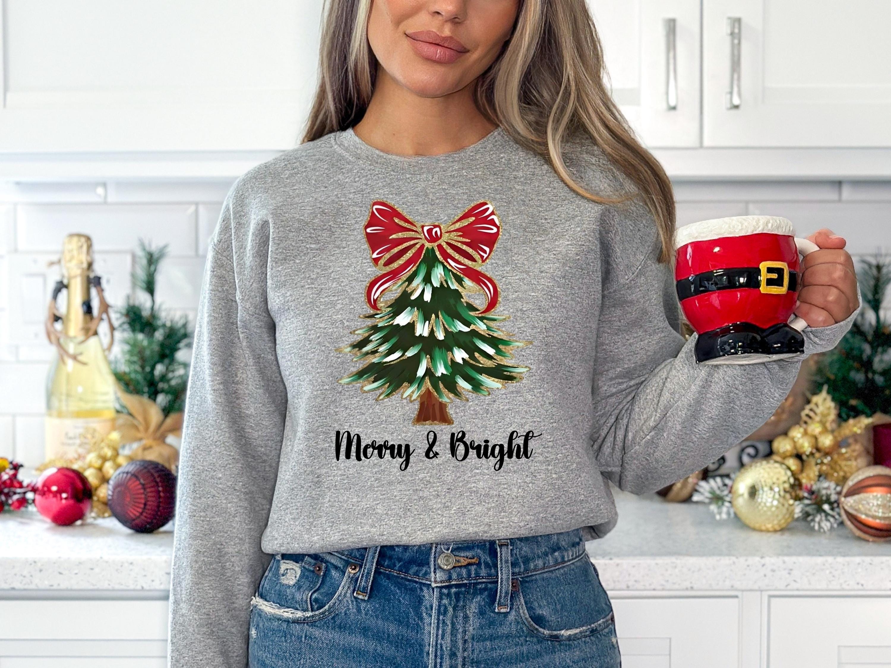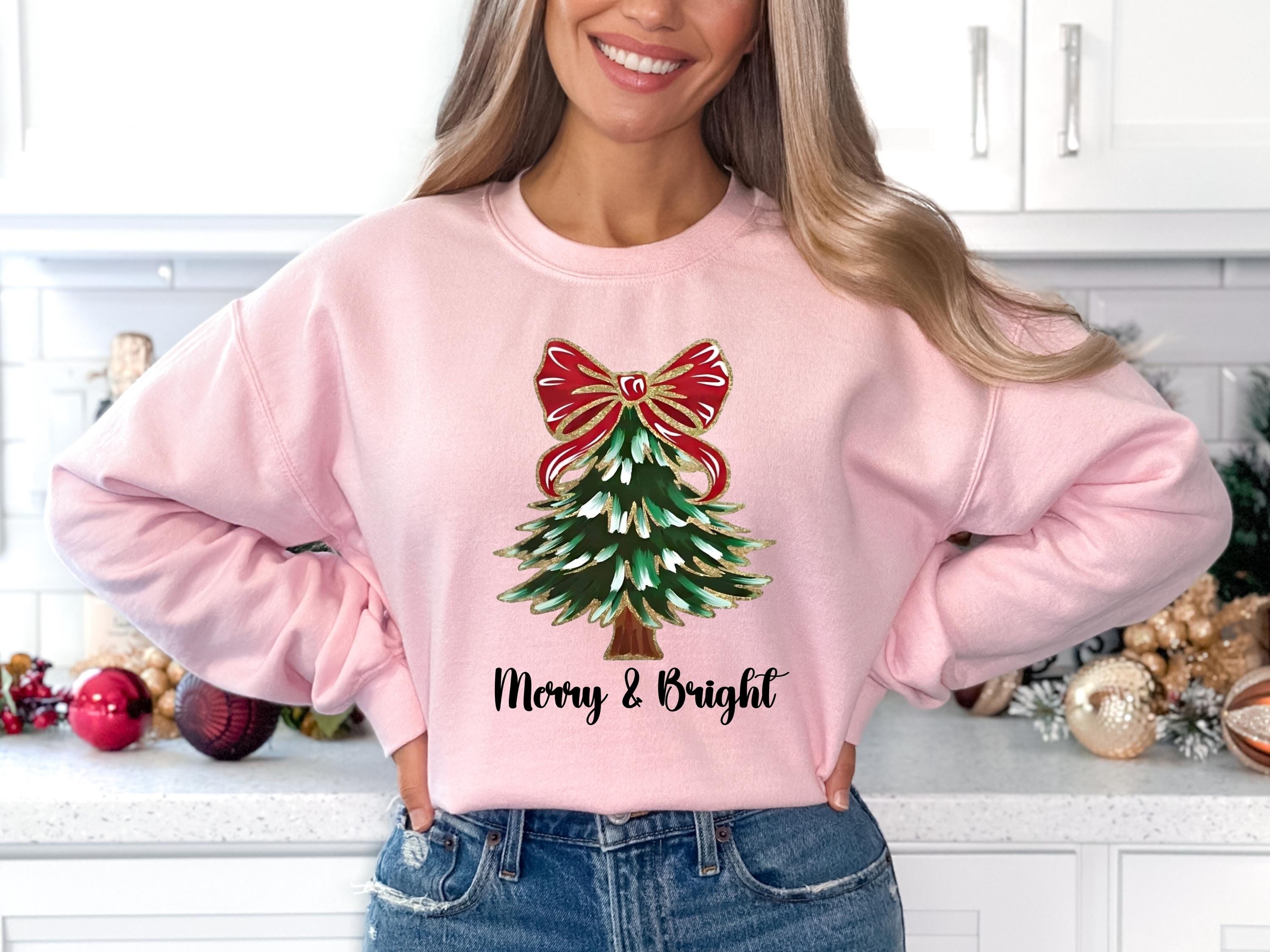 Christmas Sweatshirt Merry & Bright Xmas Tree Sweatshirt, Pink Holiday Festive Bow Lights Tshirt Cute Jolly Tee Merry Christmas Tshirt
