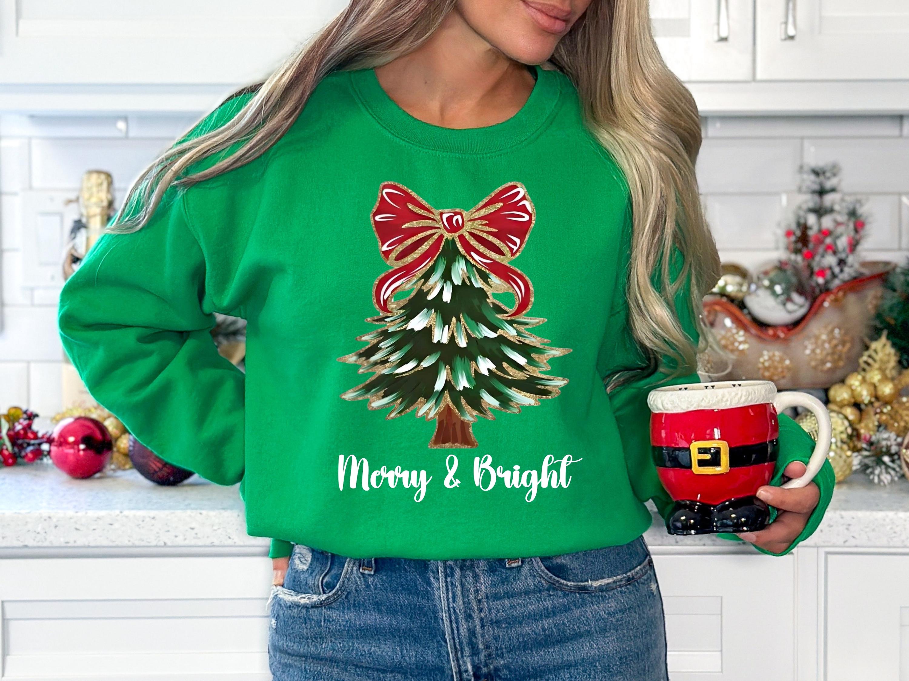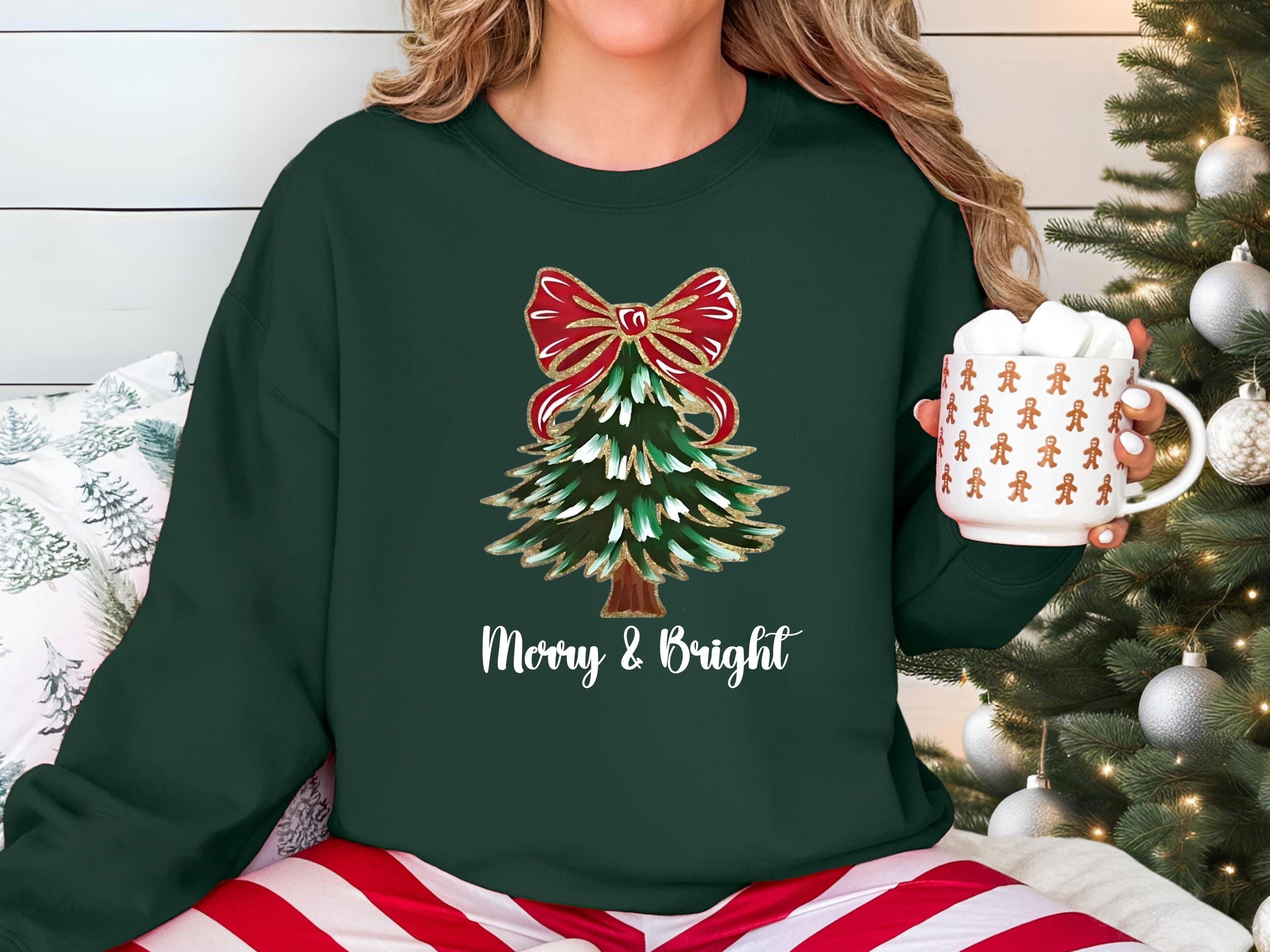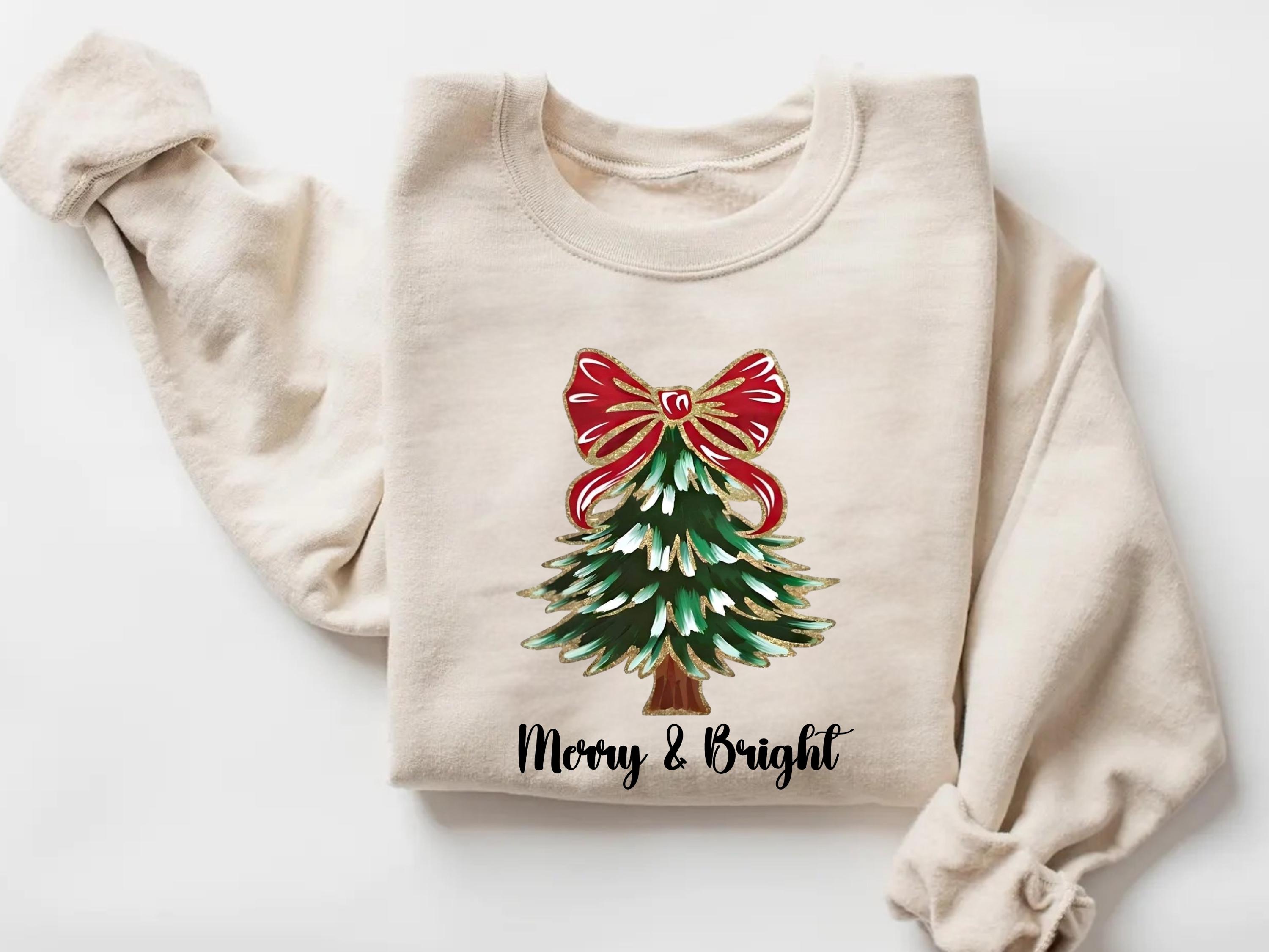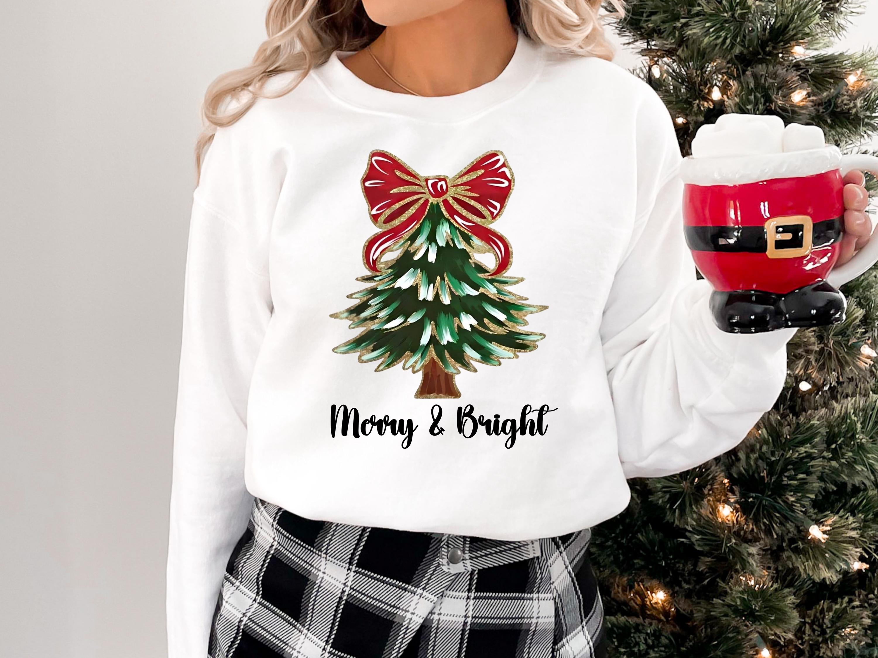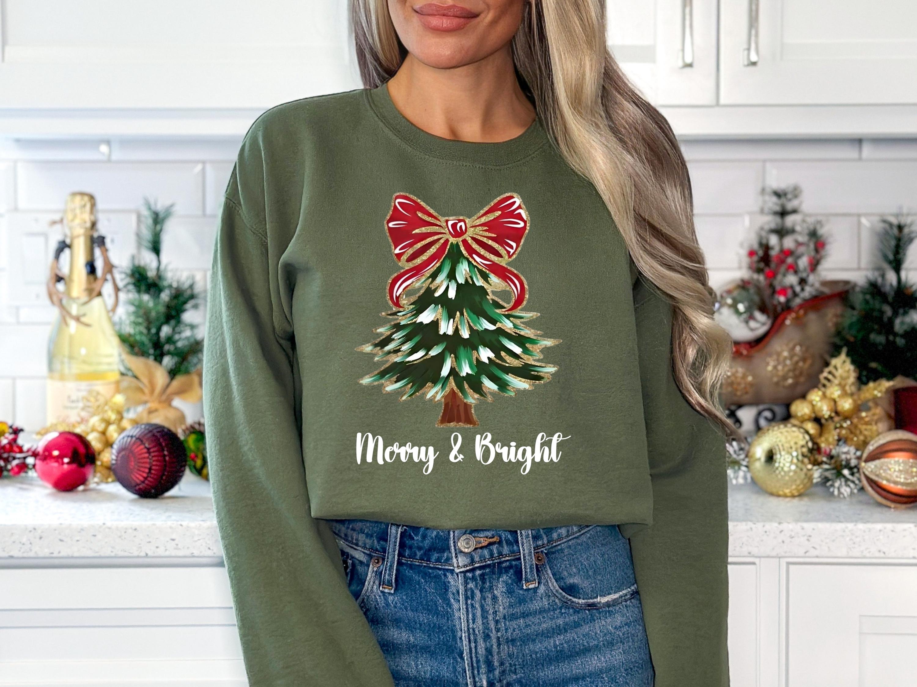 Christmas Sweatshirt Merry & Bright Xmas Tree Sweatshirt, Pink Holiday Festive Bow Lights Tshirt Cute Jolly Tee Merry Christmas Tshirt