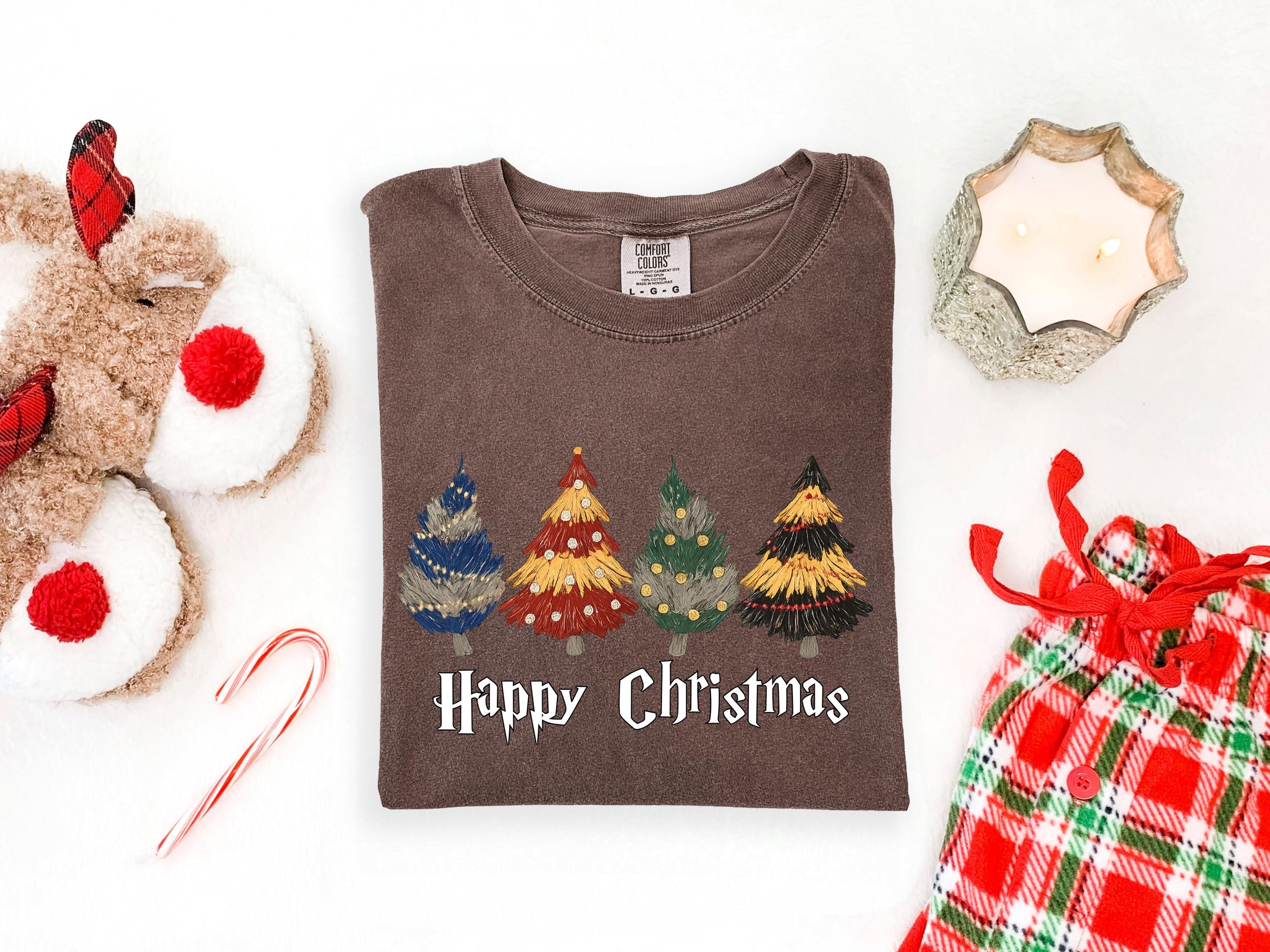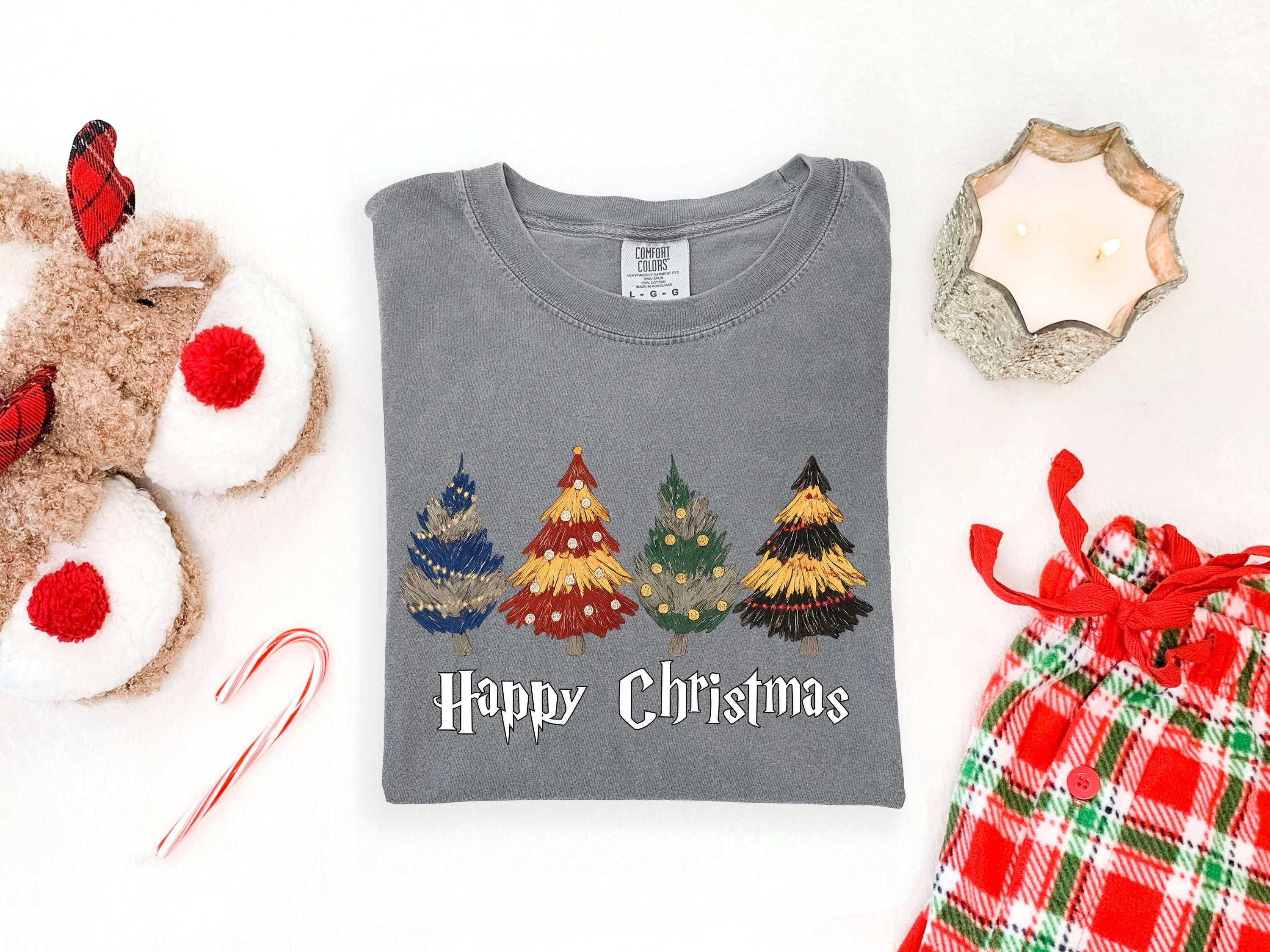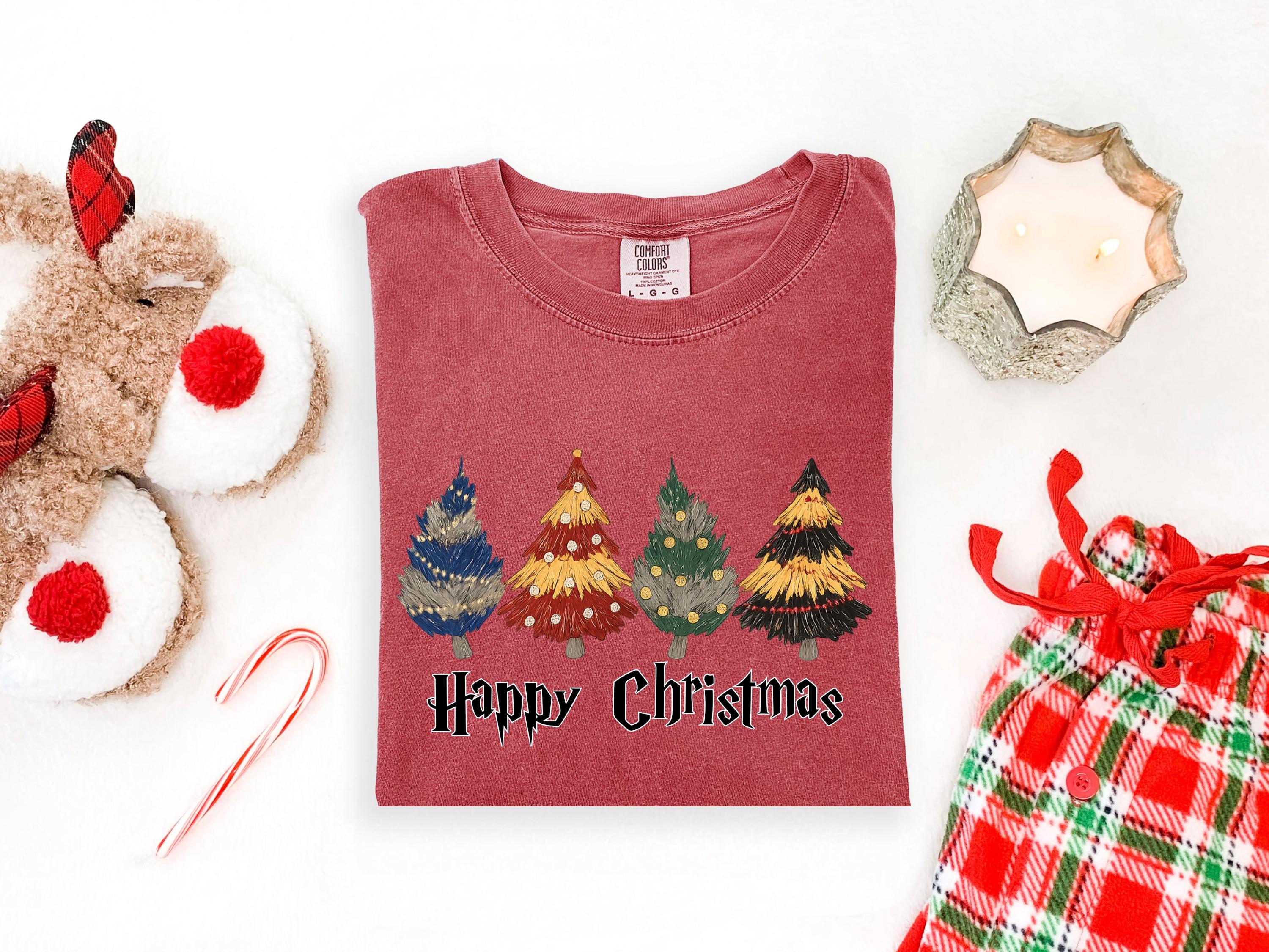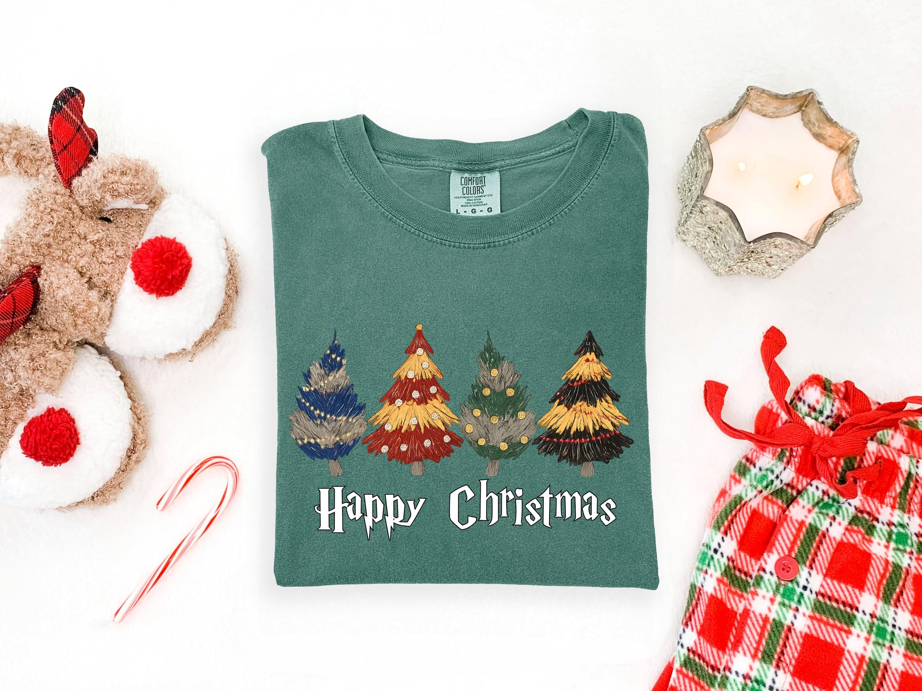 Christmas Tree Comfort Colors Shirt, HP Wizard Houses Christmas Tree Shirt, Happy Christmas Wizard Trees Shirt, Christmas Magical Pine Trees