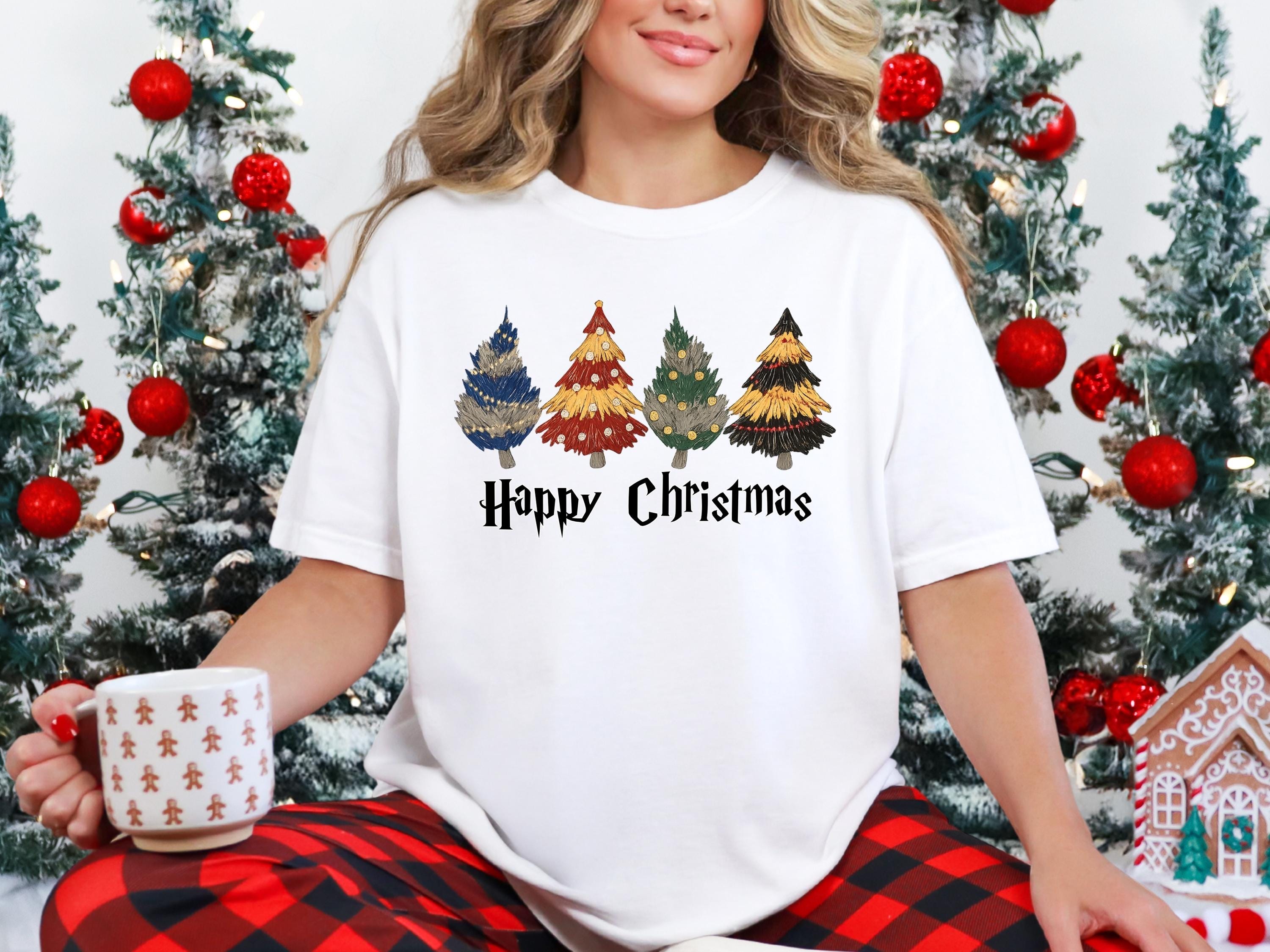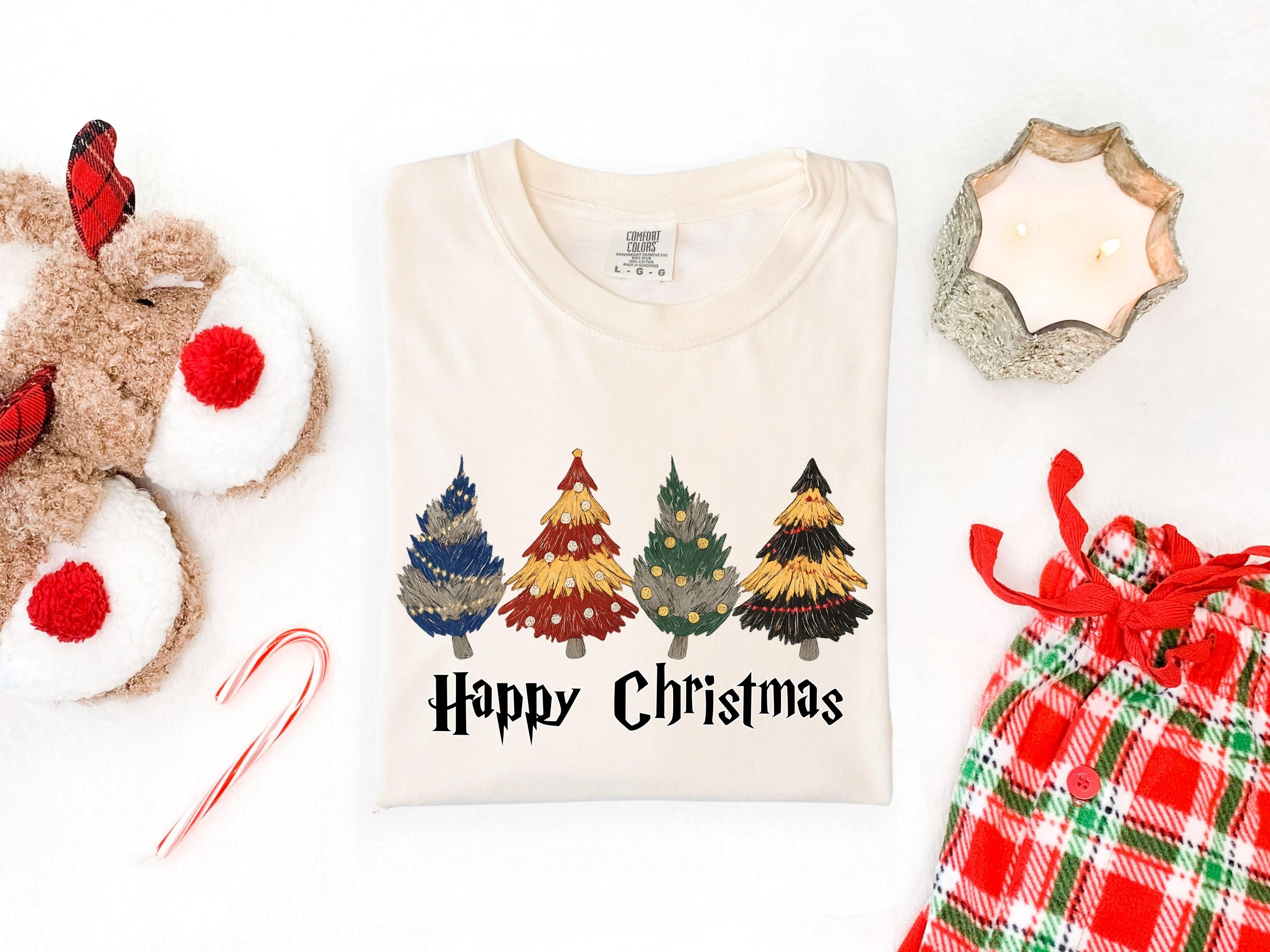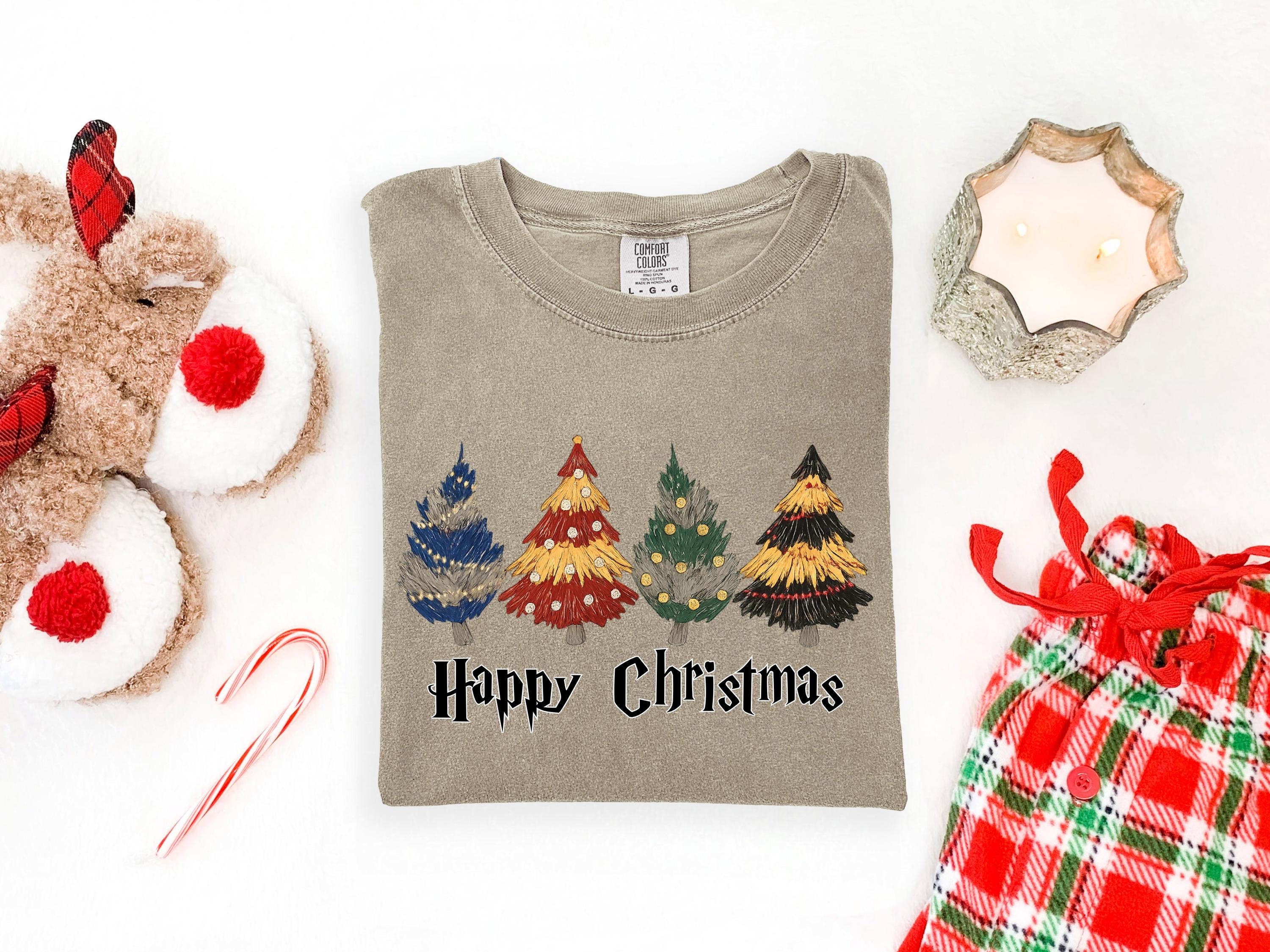 Christmas Tree Comfort Colors Shirt, HP Wizard Houses Christmas Tree Shirt, Happy Christmas Wizard Trees Shirt, Christmas Magical Pine Trees