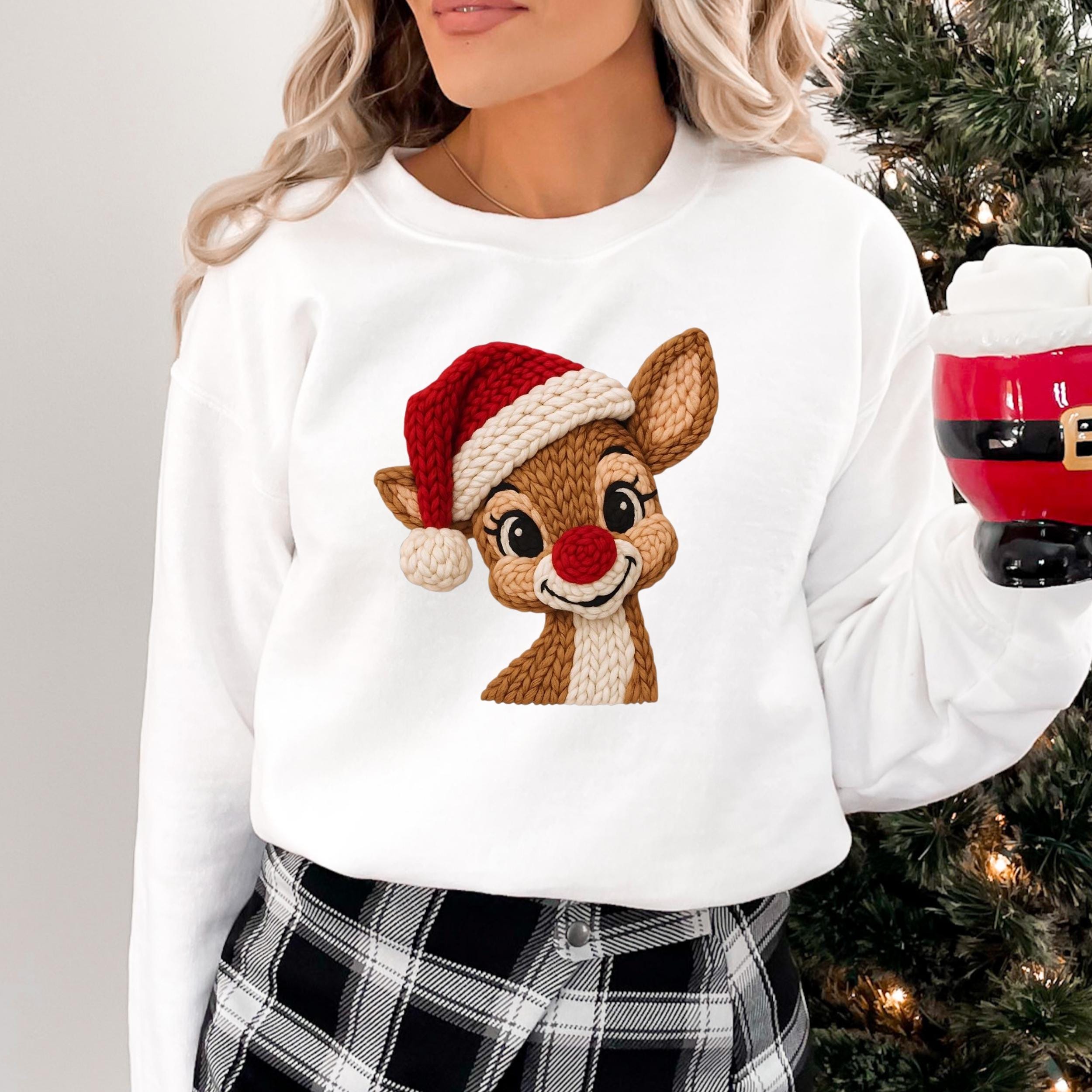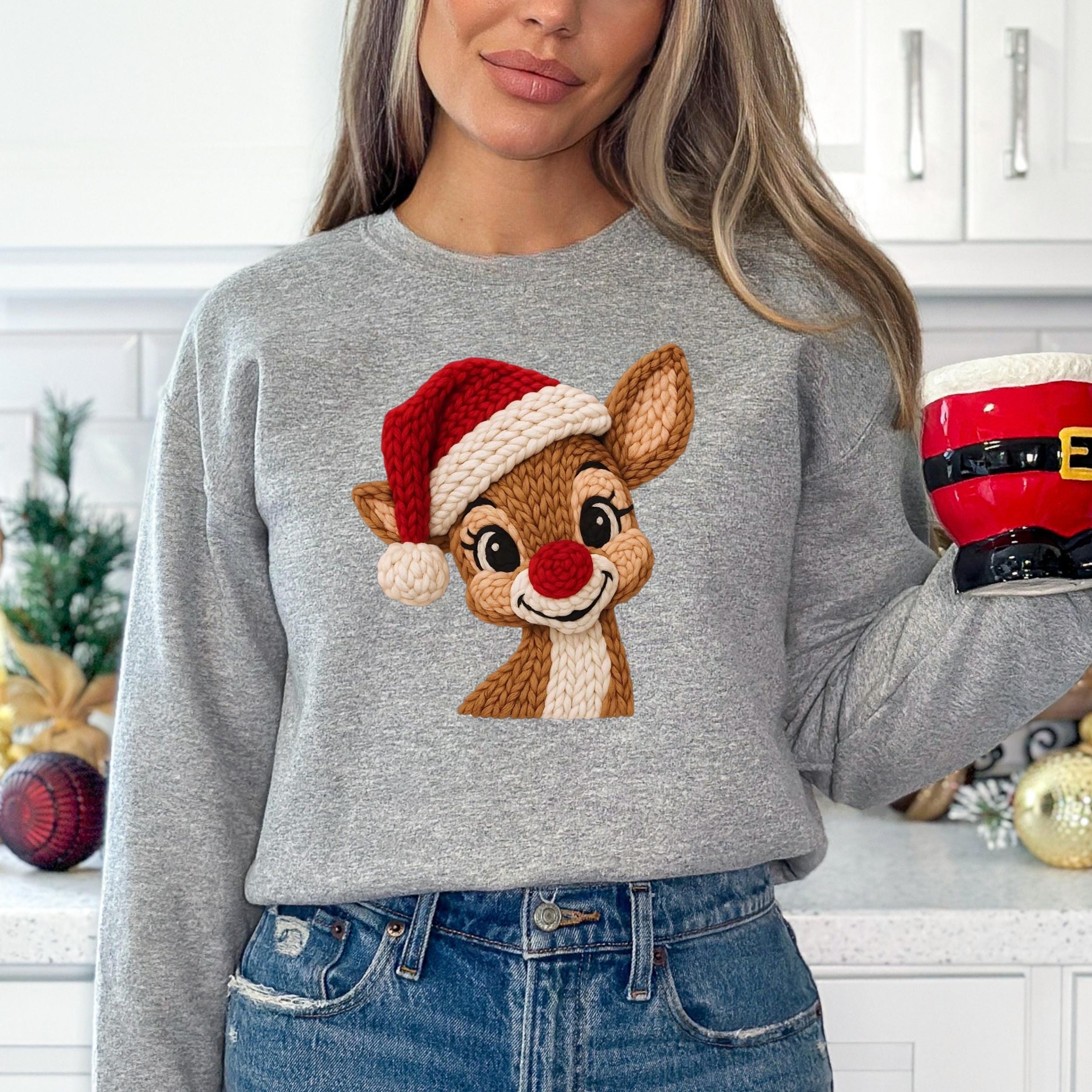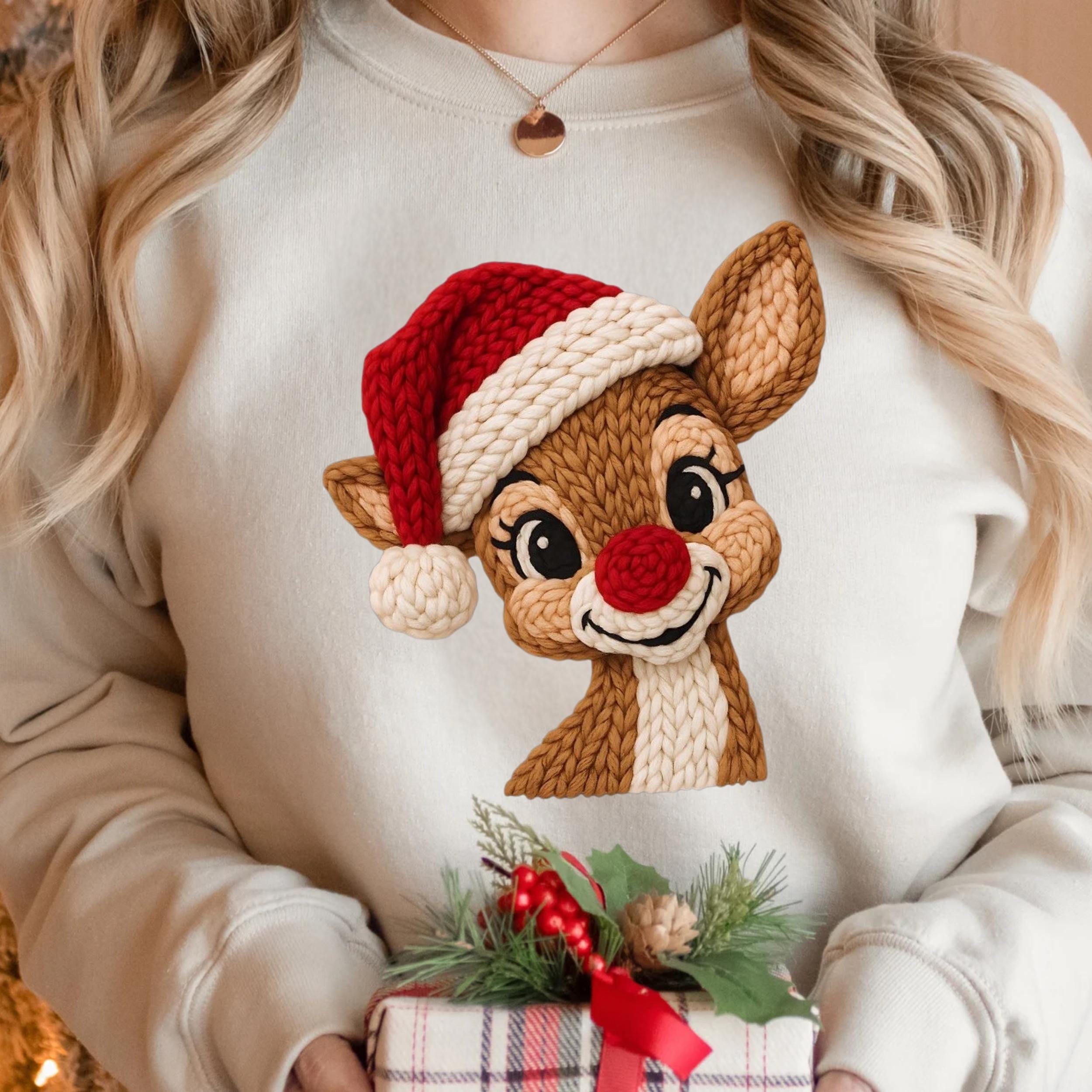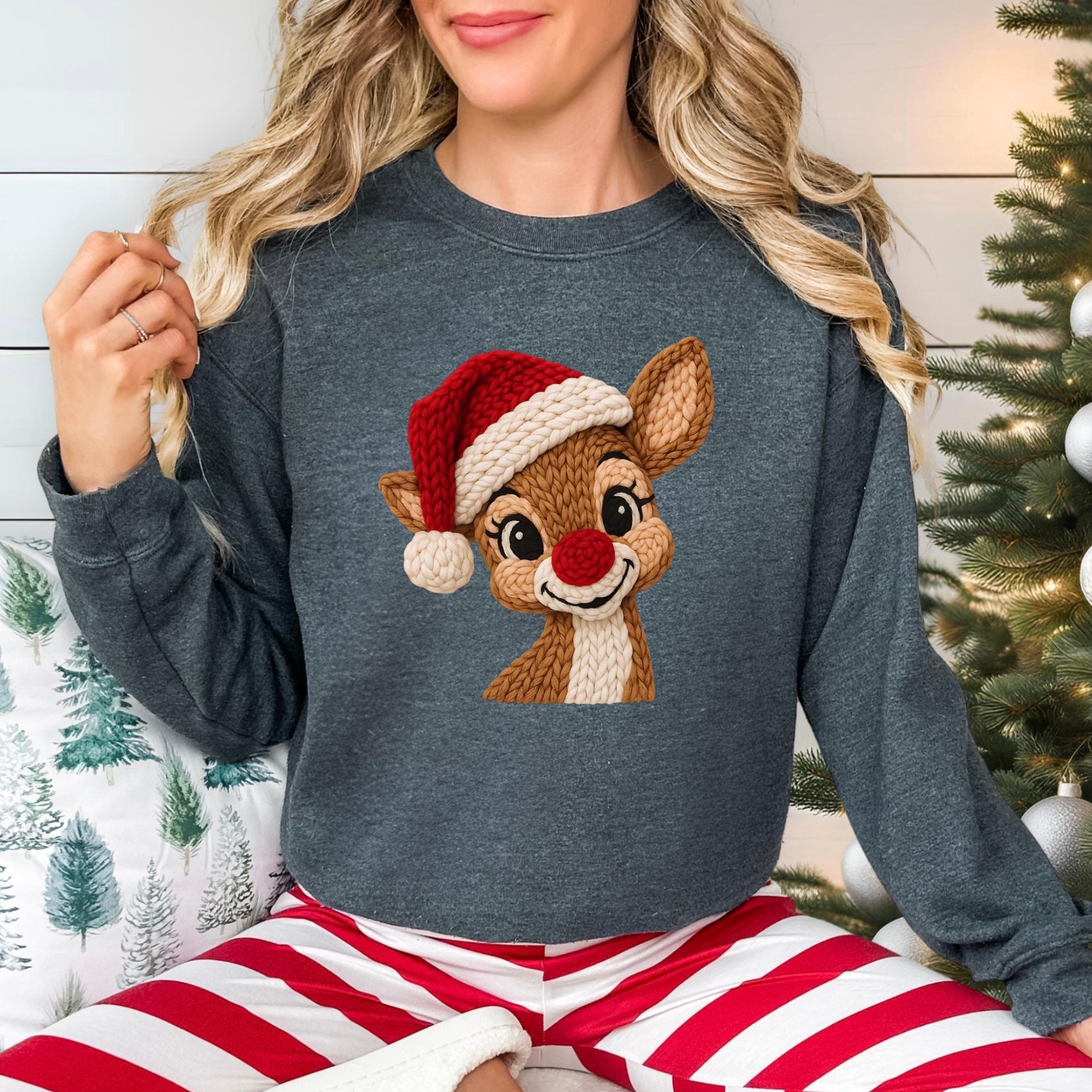 Chenille Reindeer Christmas Sweatshirt, Faux Yarn Crochet Rudolph Sweatshirt, Cute Xmas Holiday for Women Gift Sweatshirt