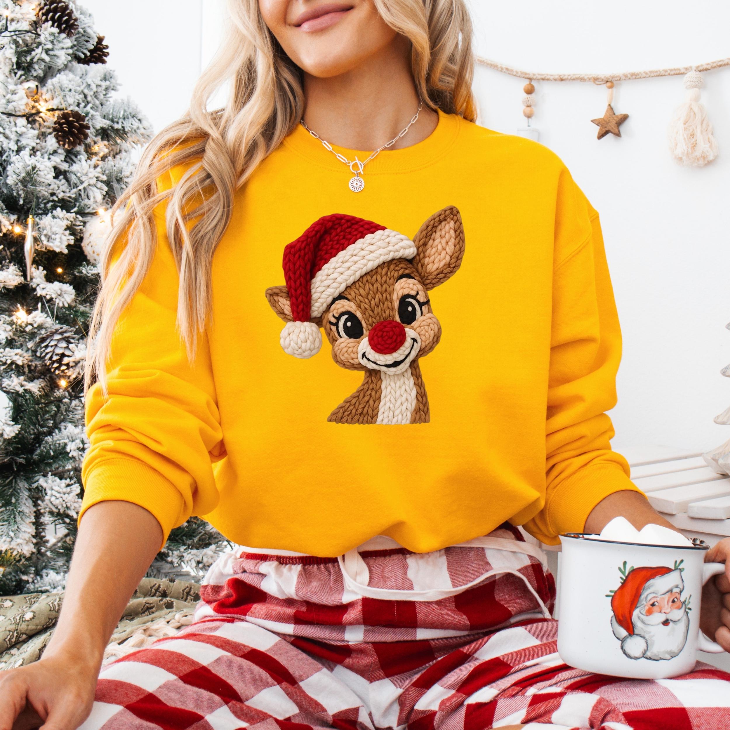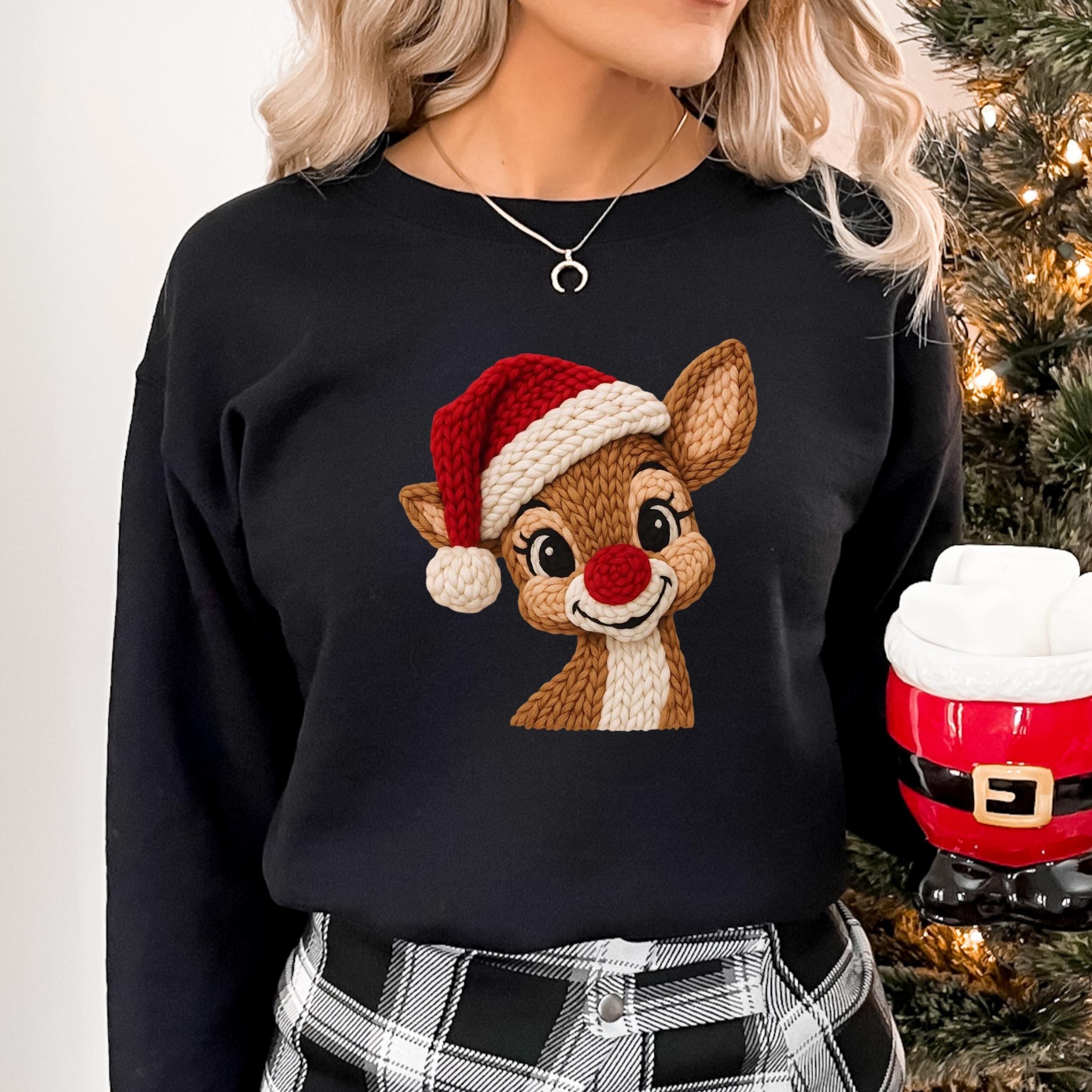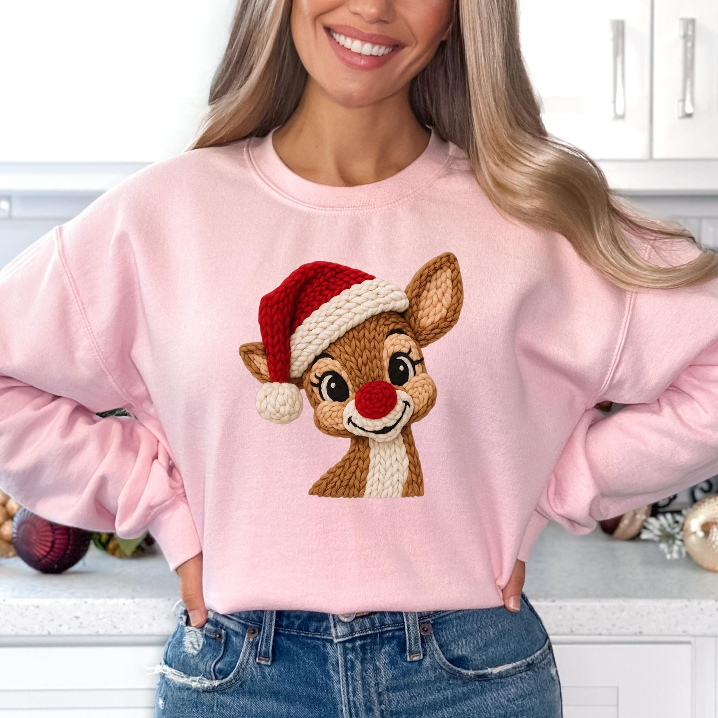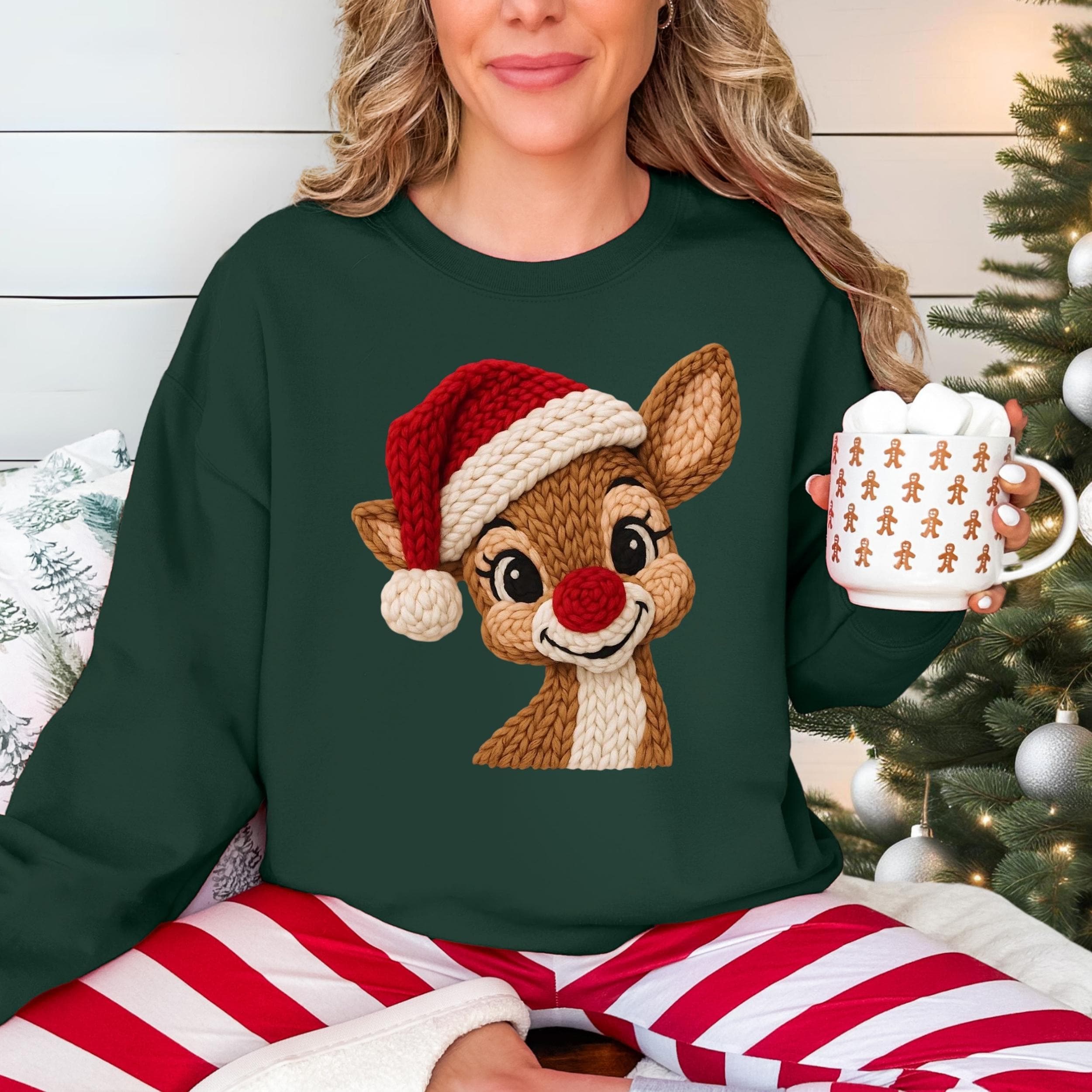 Chenille Reindeer Christmas Sweatshirt, Faux Yarn Crochet Rudolph Sweatshirt, Cute Xmas Holiday for Women Gift Sweatshirt