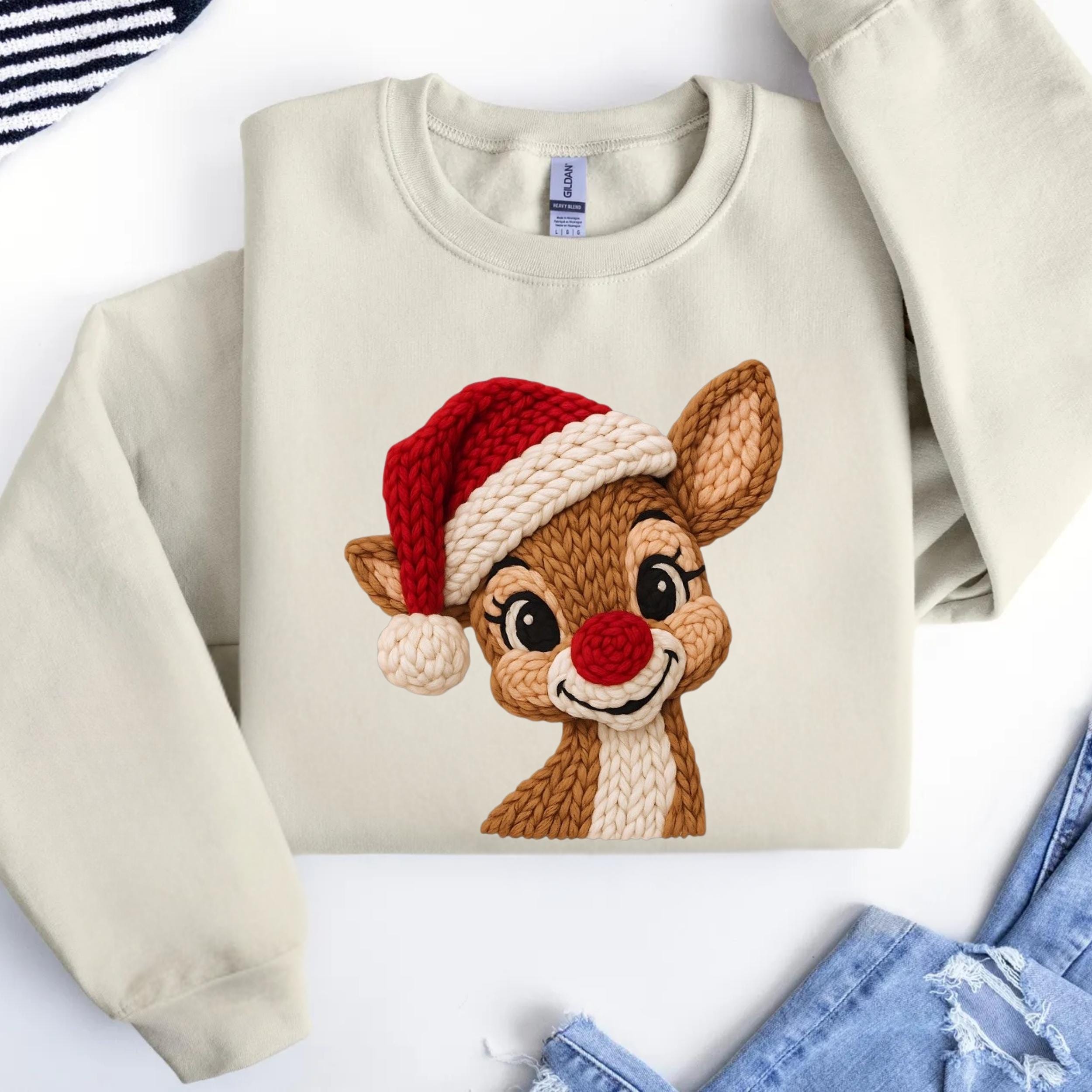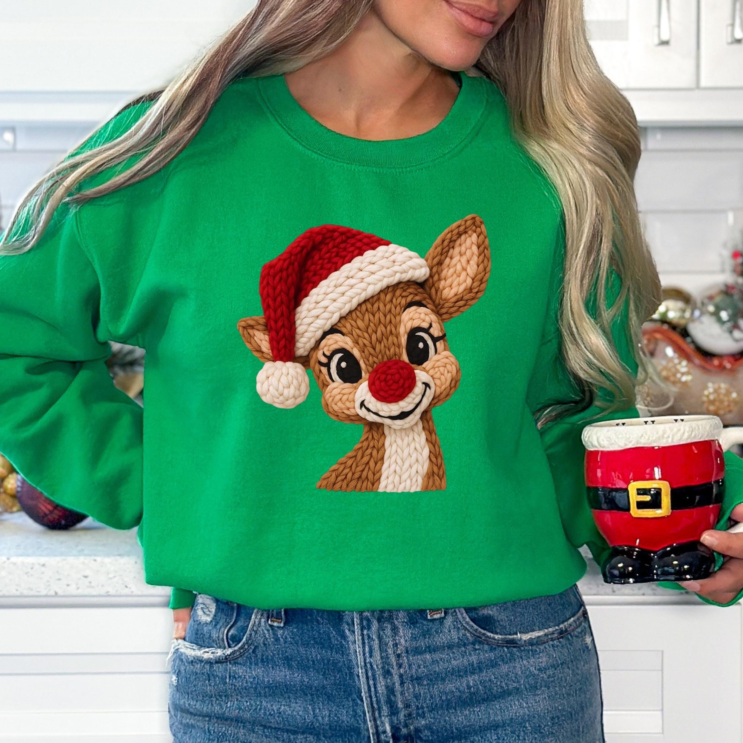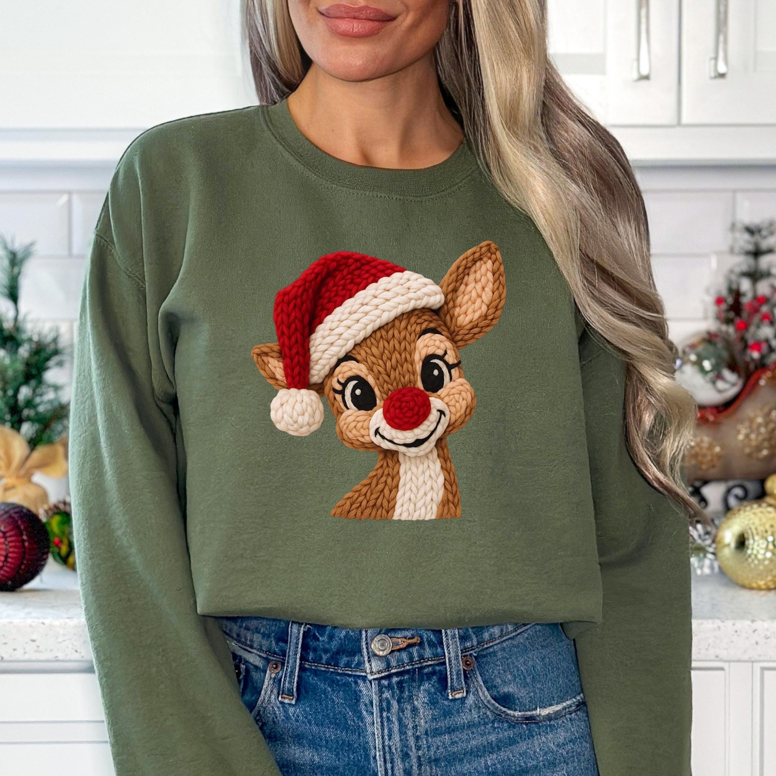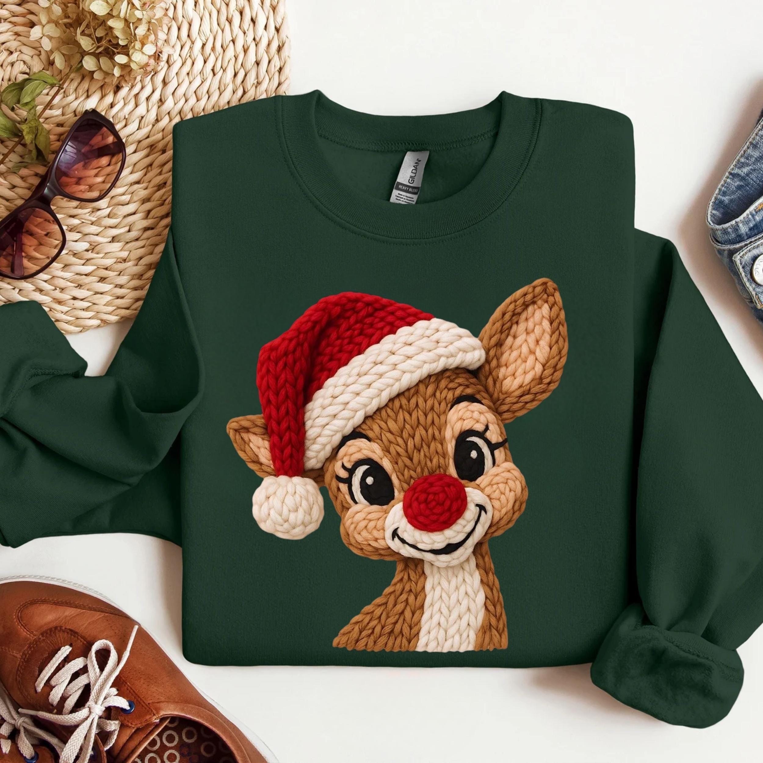 Chenille Reindeer Christmas Sweatshirt, Faux Yarn Crochet Rudolph Sweatshirt, Cute Xmas Holiday for Women Gift Sweatshirt
