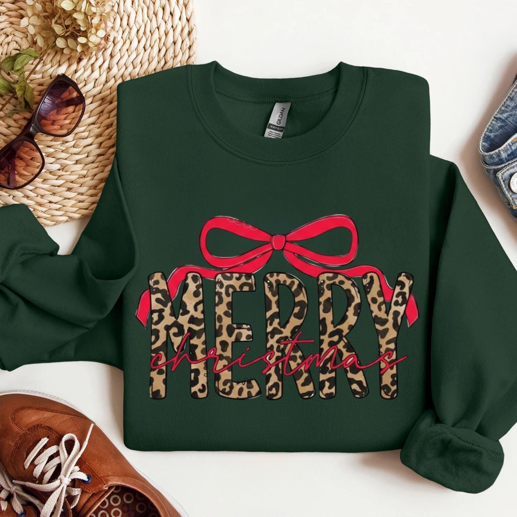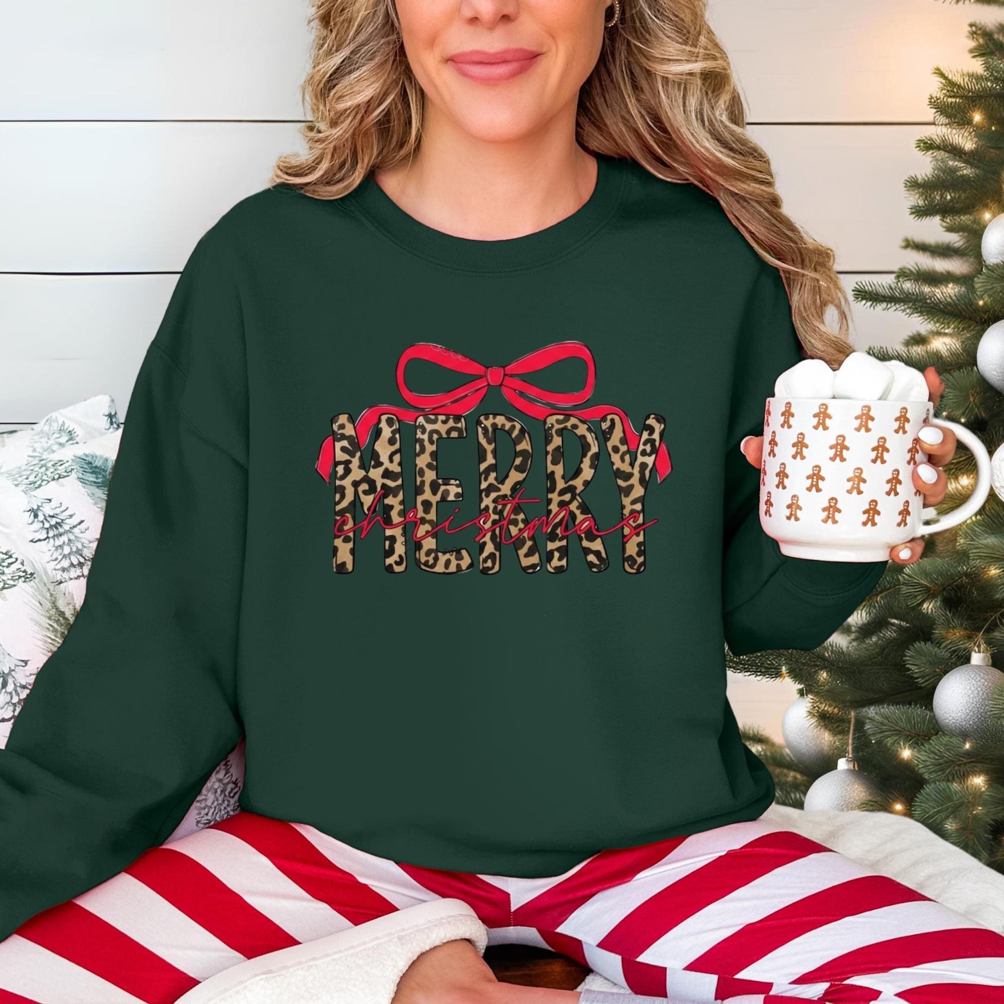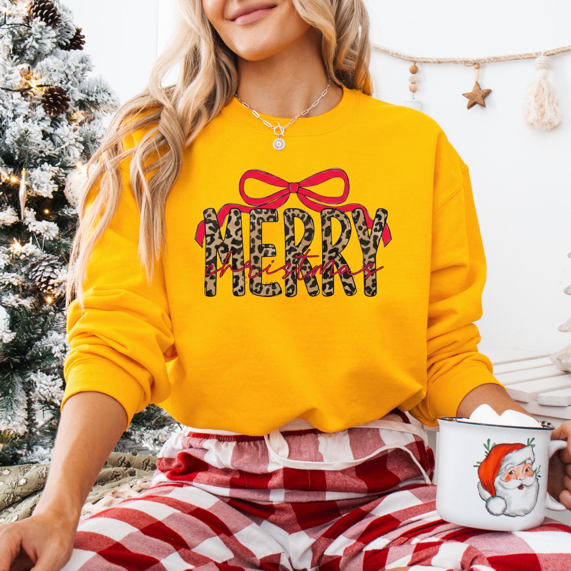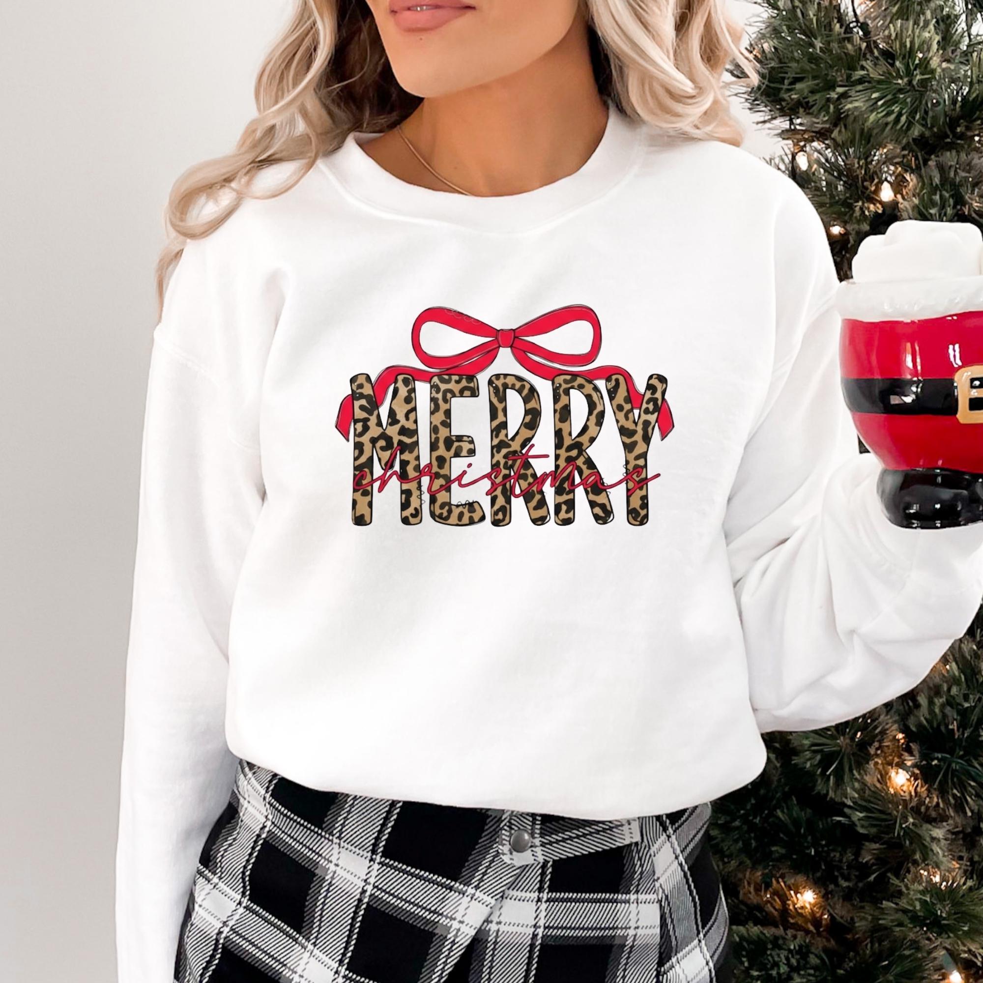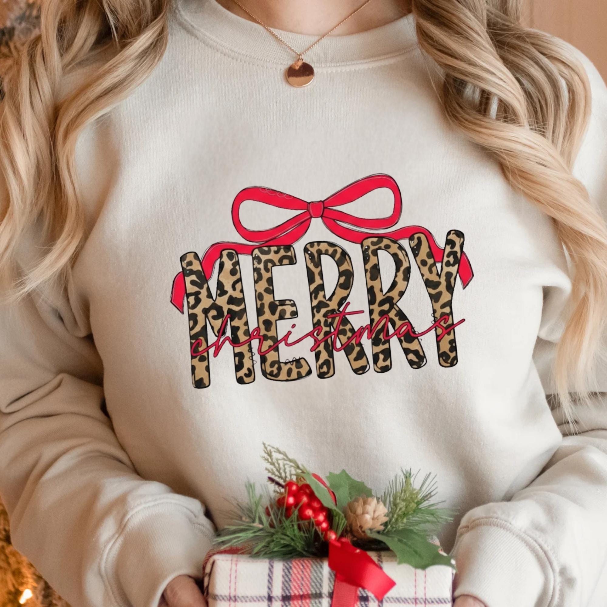 Coquette Leopard Merry Christmas Sweatshirt, Merry Christmas Shirt, Preppy Christmas Tee, Coquette Shirt, Xmas Coquette Preppy Leopard Shirt