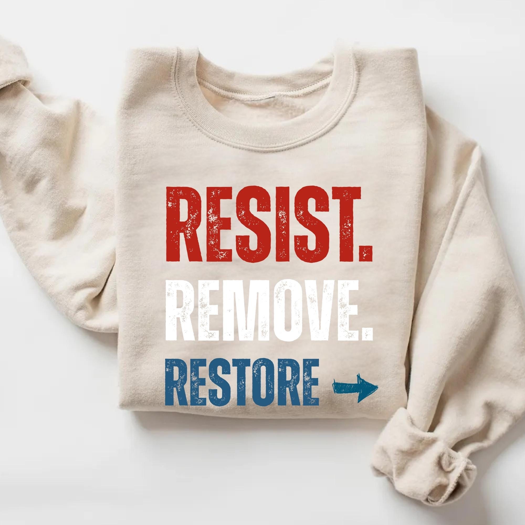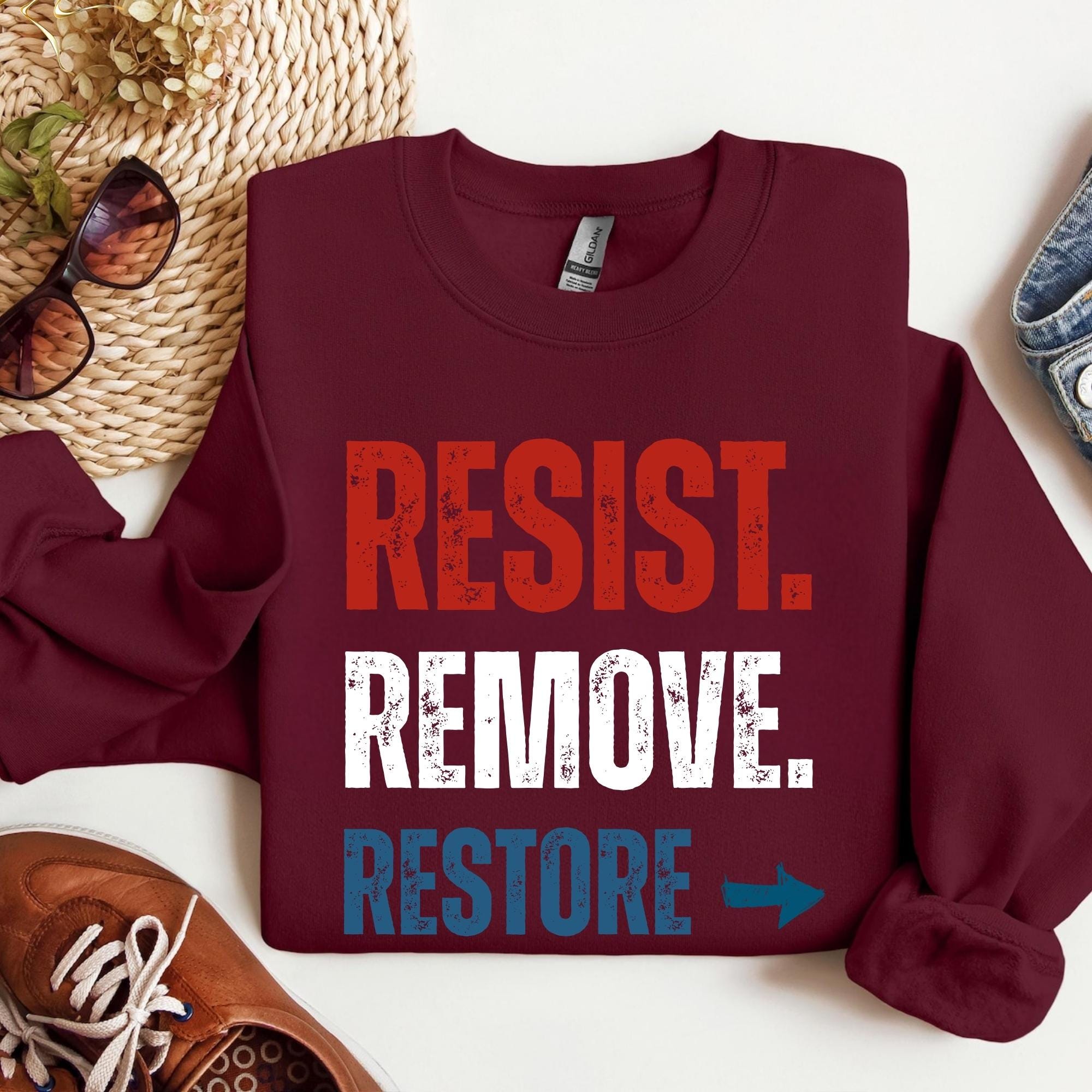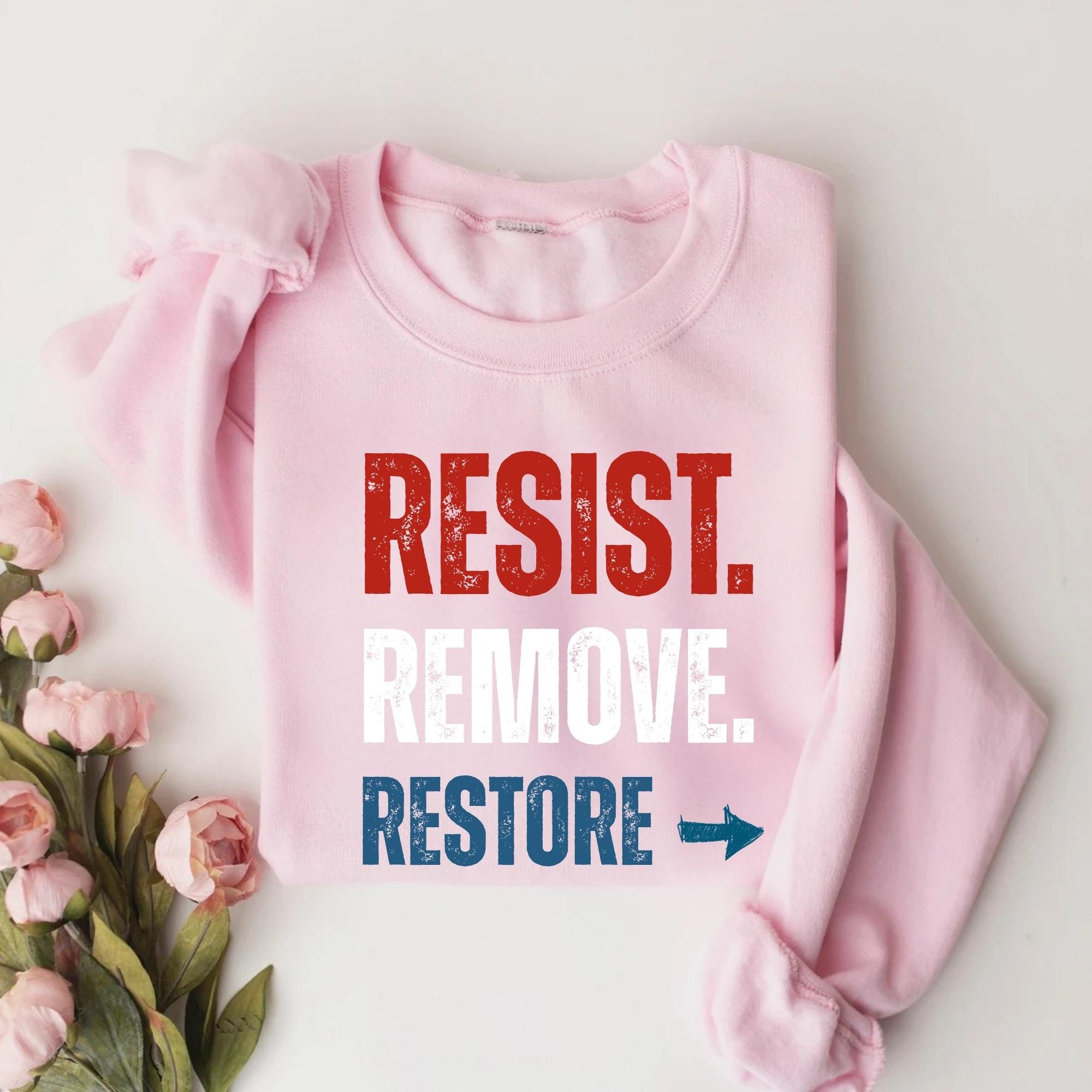 Resist Remove Restore shirt is a bold political protest t-shirt designed for activists, liberals, and resistance supporters. Resist Remove Restore Sweatshirt, Political Protest T Shirt, Anti Trump Activist Sweatshirt, Liberal Resistance Graphic Tee