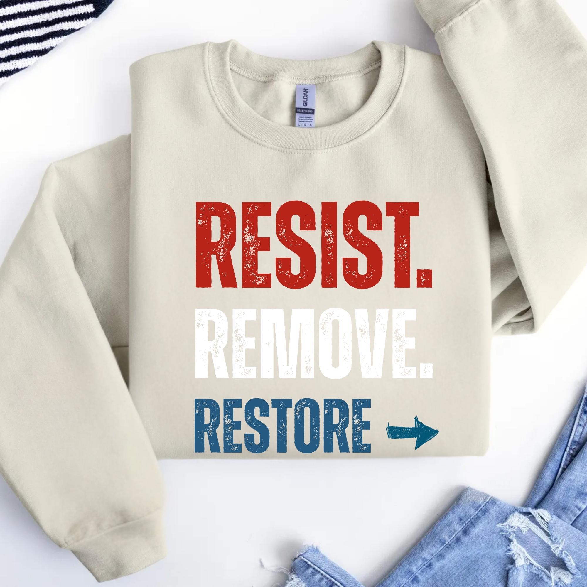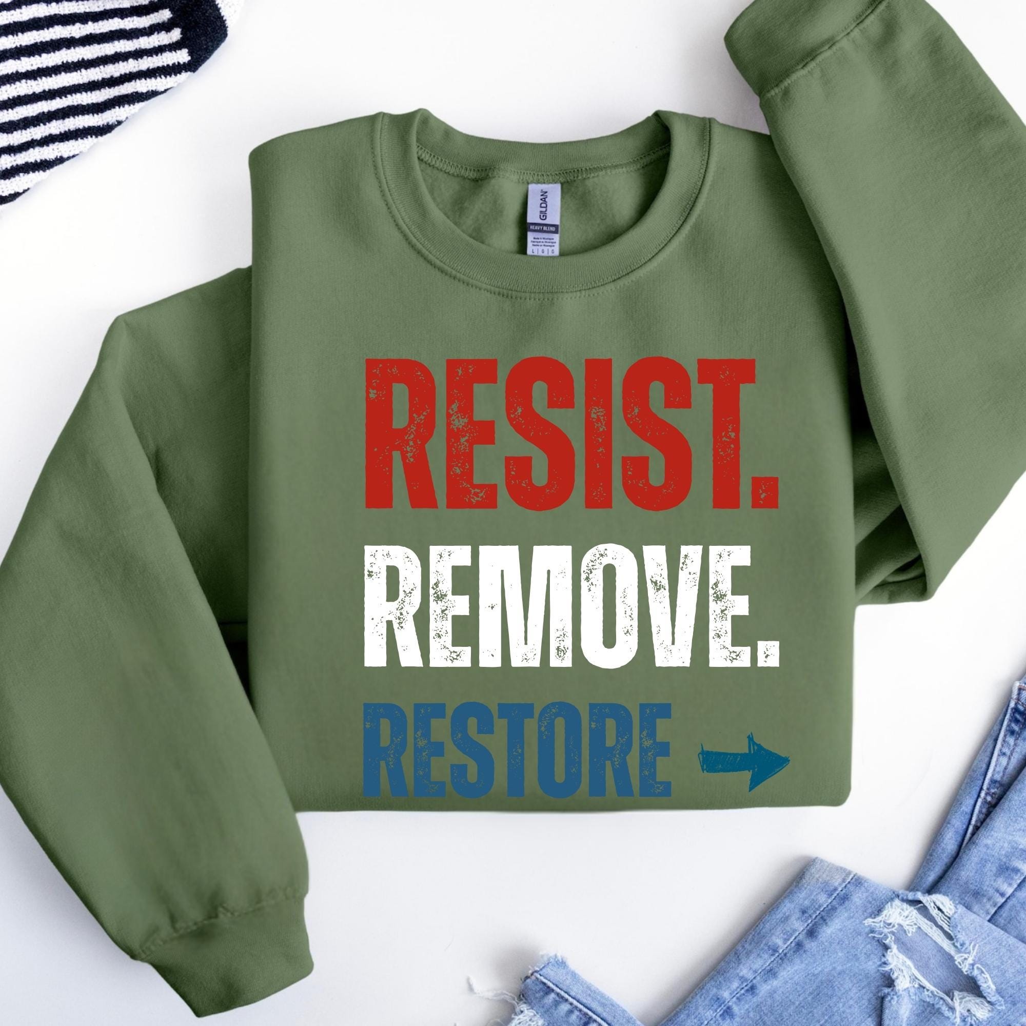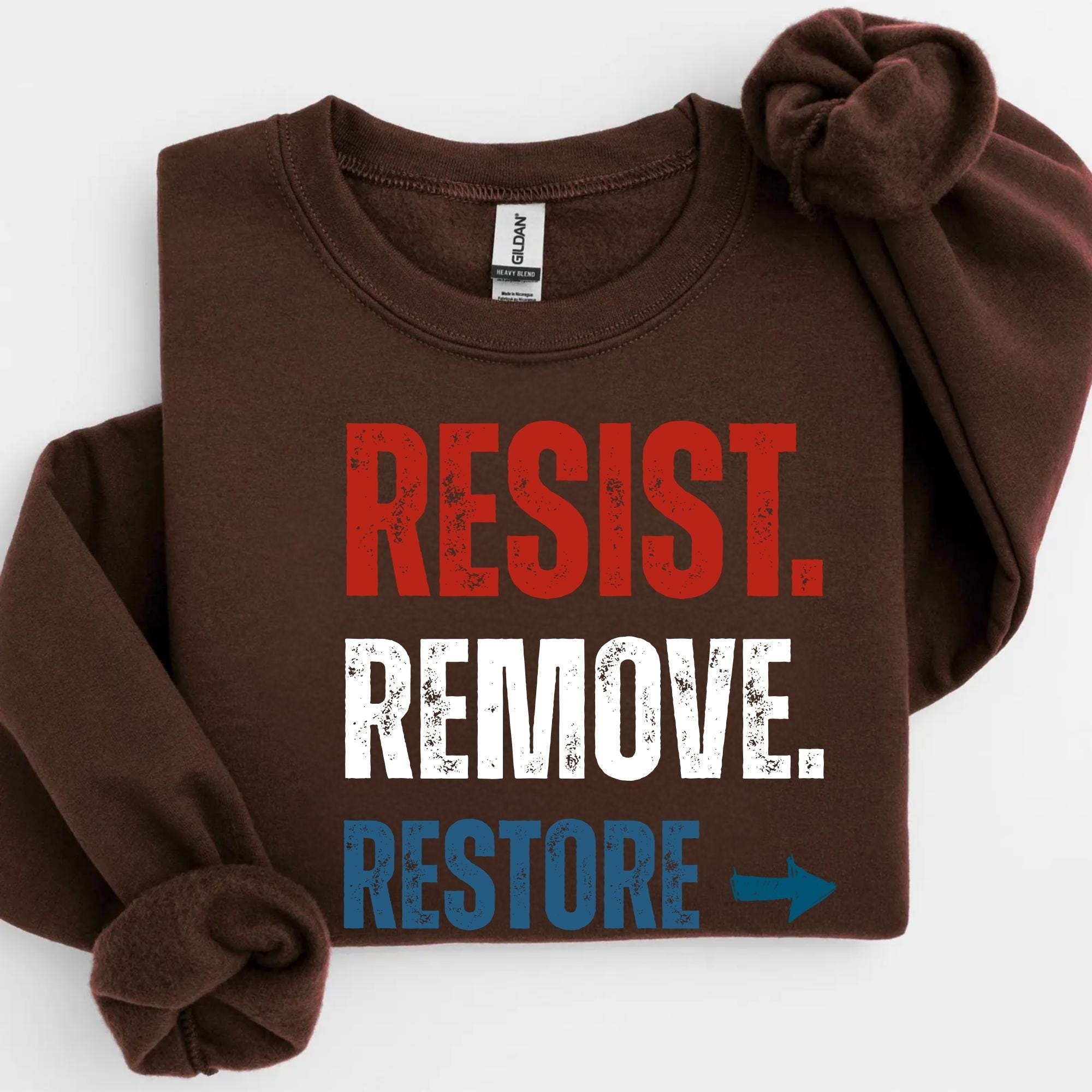 Resist Remove Restore shirt is a bold political protest t-shirt designed for activists, liberals, and resistance supporters. Resist Remove Restore Sweatshirt, Political Protest T Shirt, Anti Trump Activist Sweatshirt, Liberal Resistance Graphic Tee