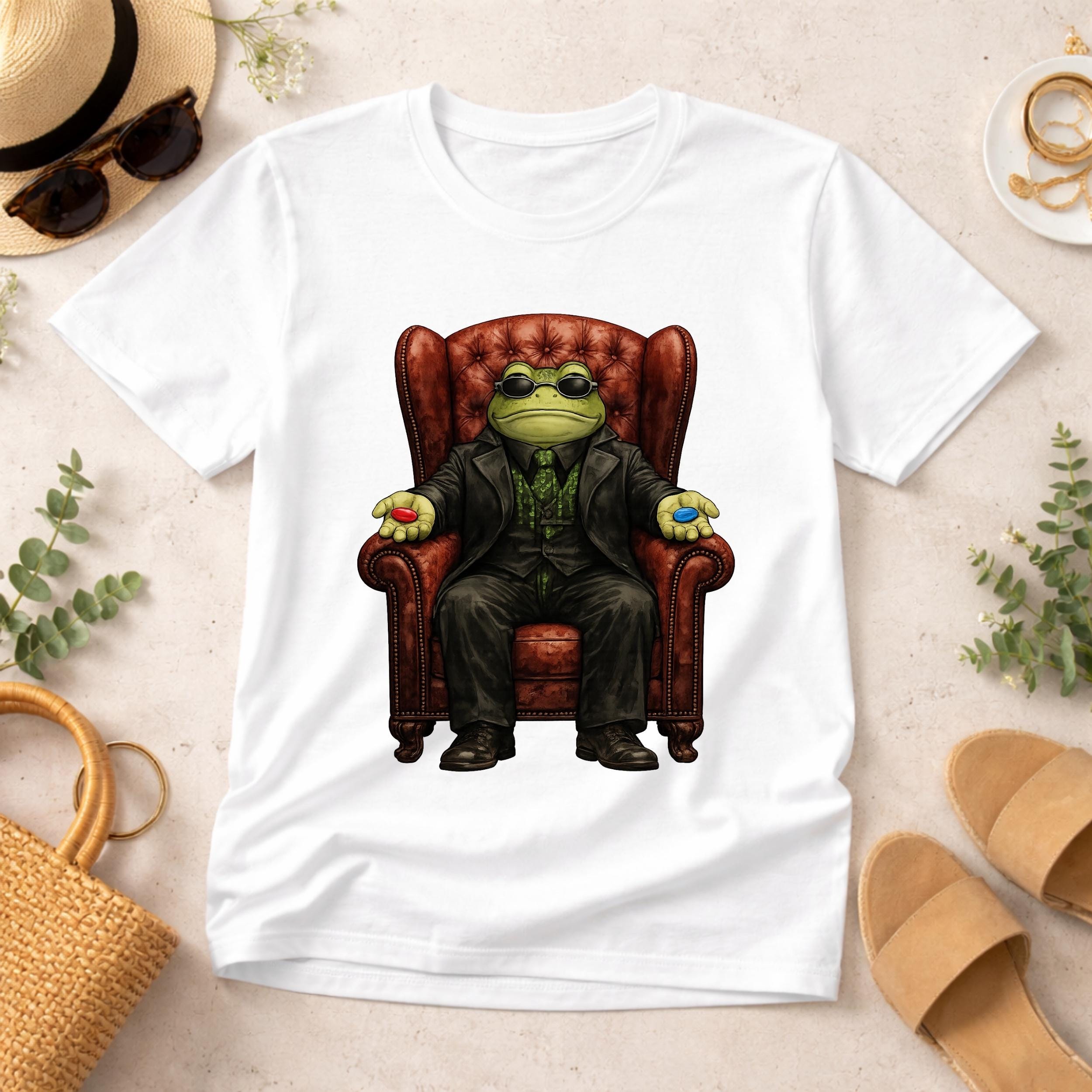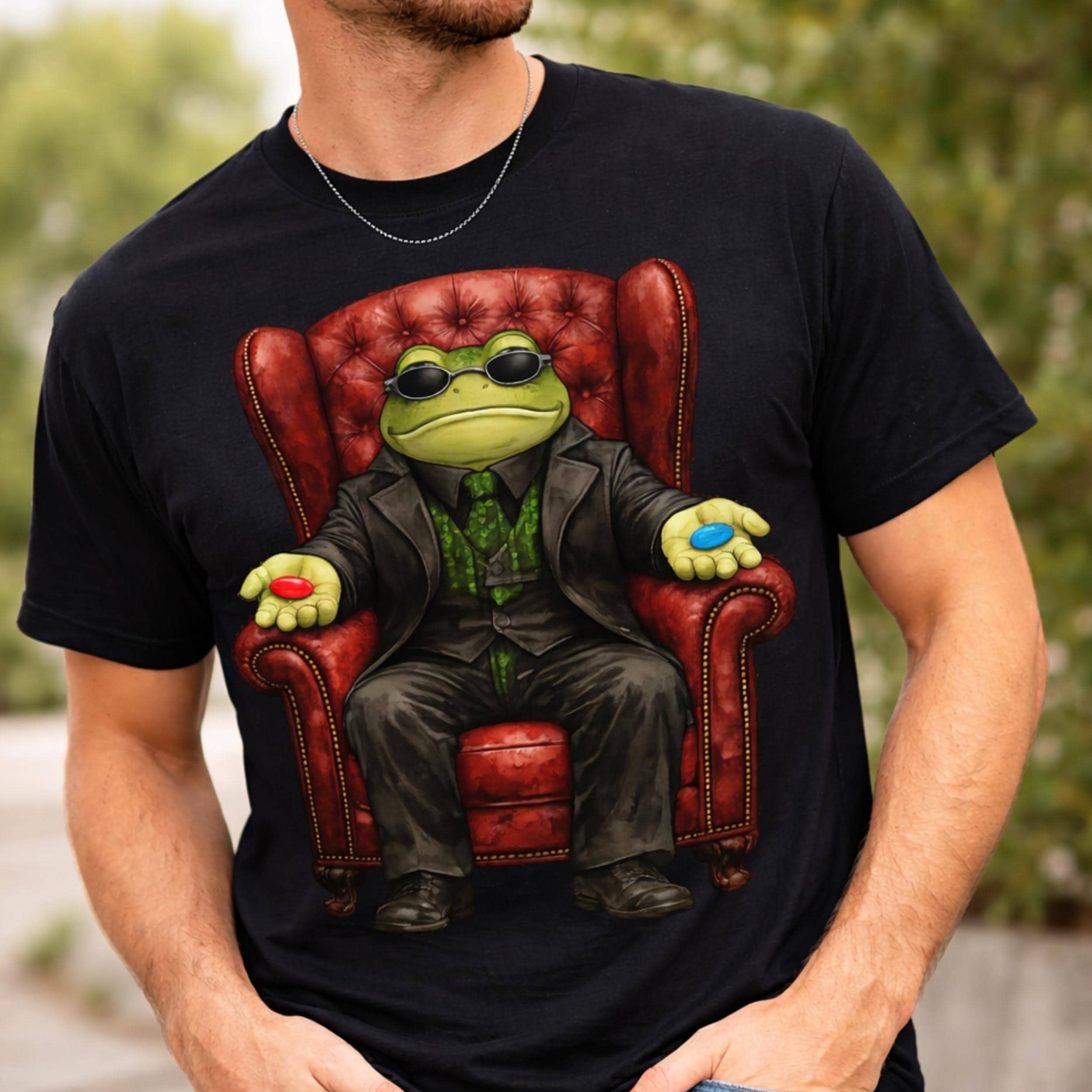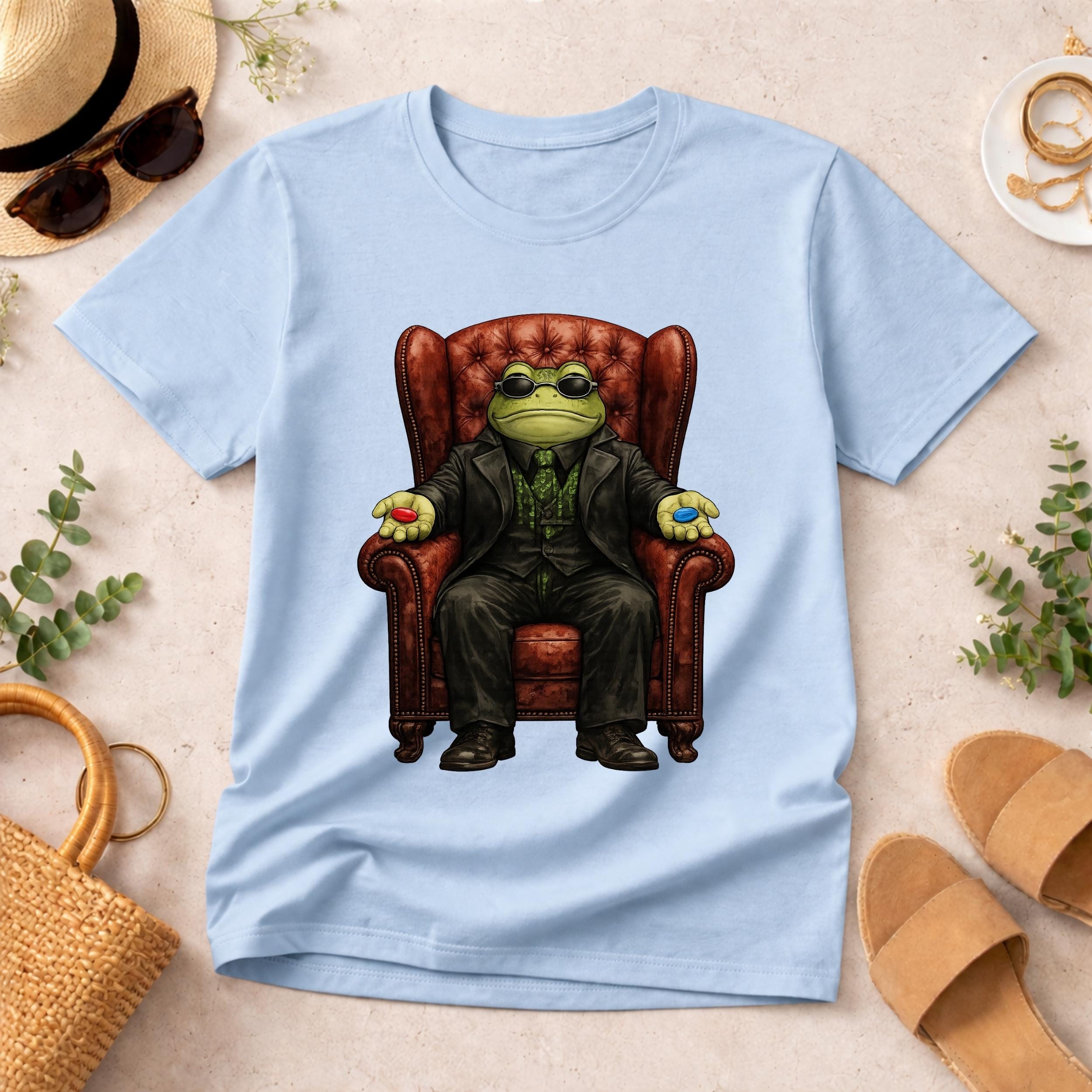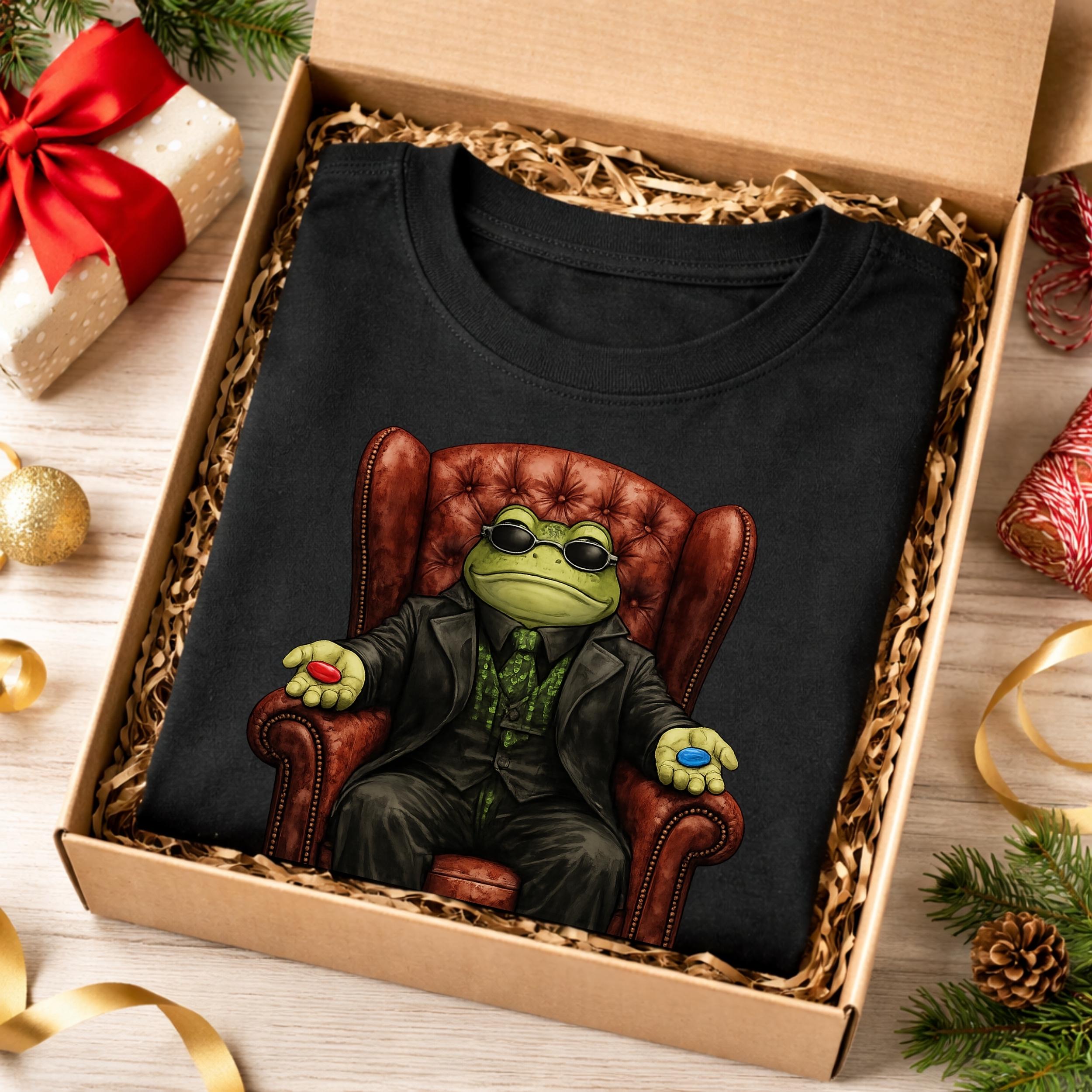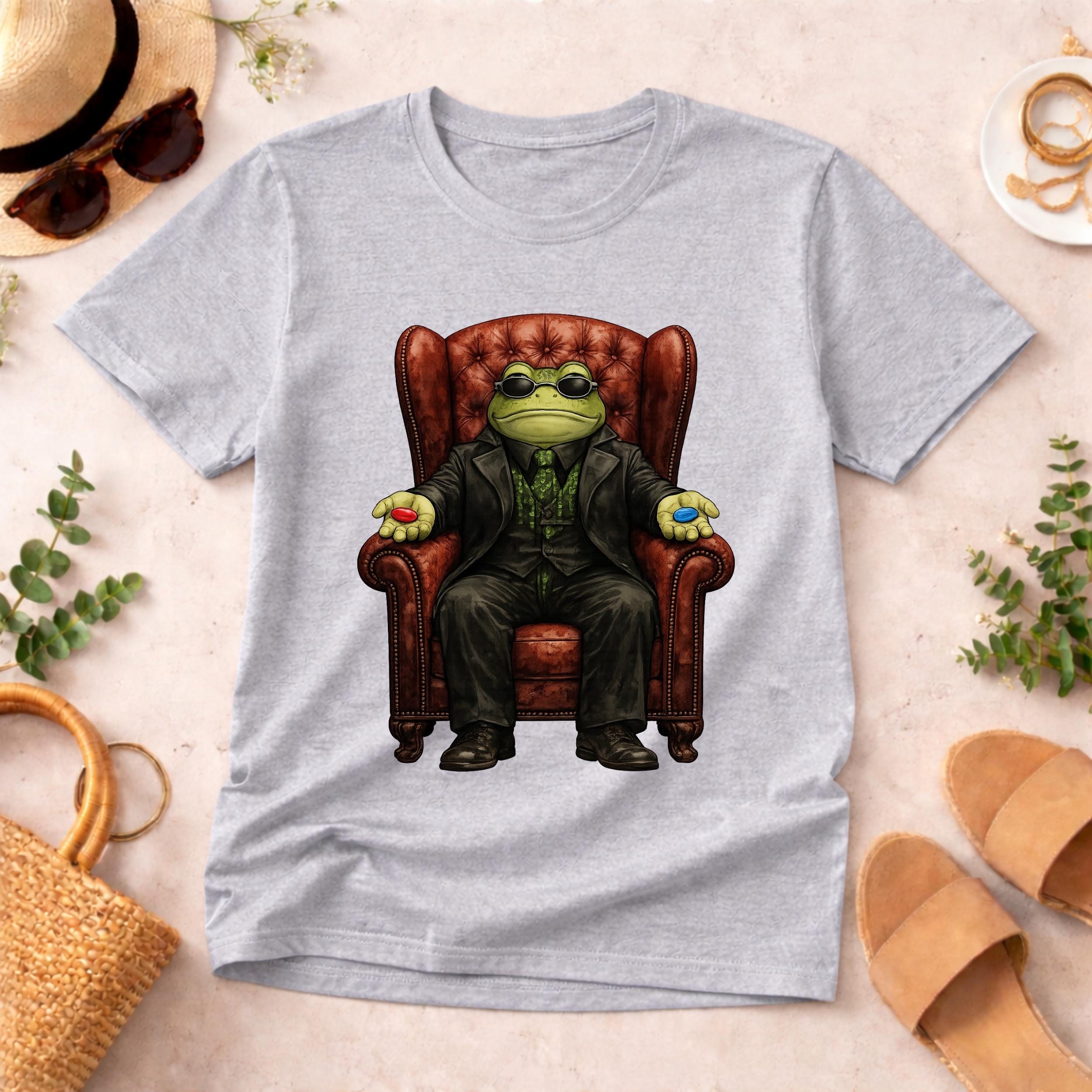 This funny red pill blue pill frog shirt features a stylish frog sitting in a classic chair offering the iconic choice. Inspired by meme culture and pop-culture references, this design combines humor, geek vibes, and unique artwork into a standout graphic tee.