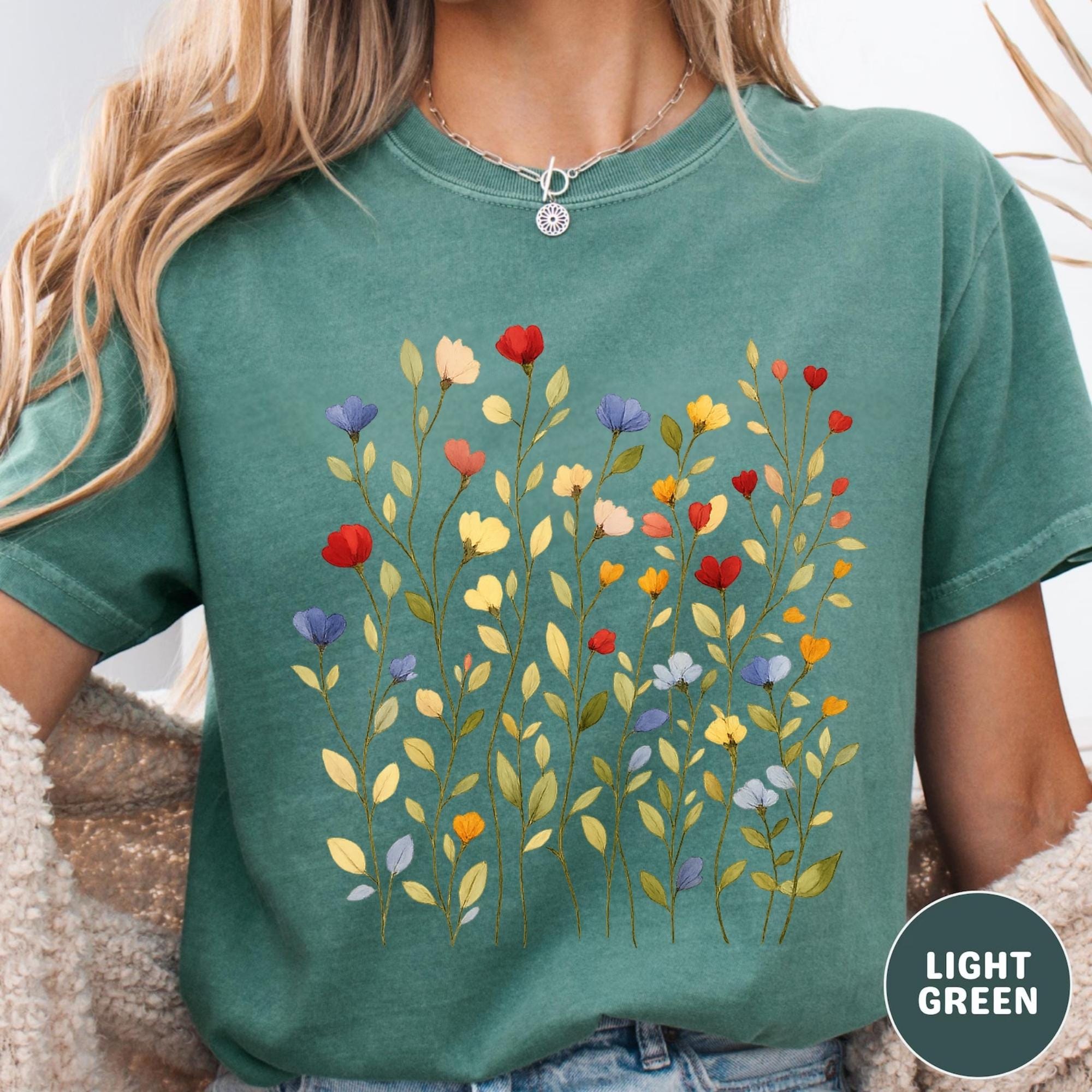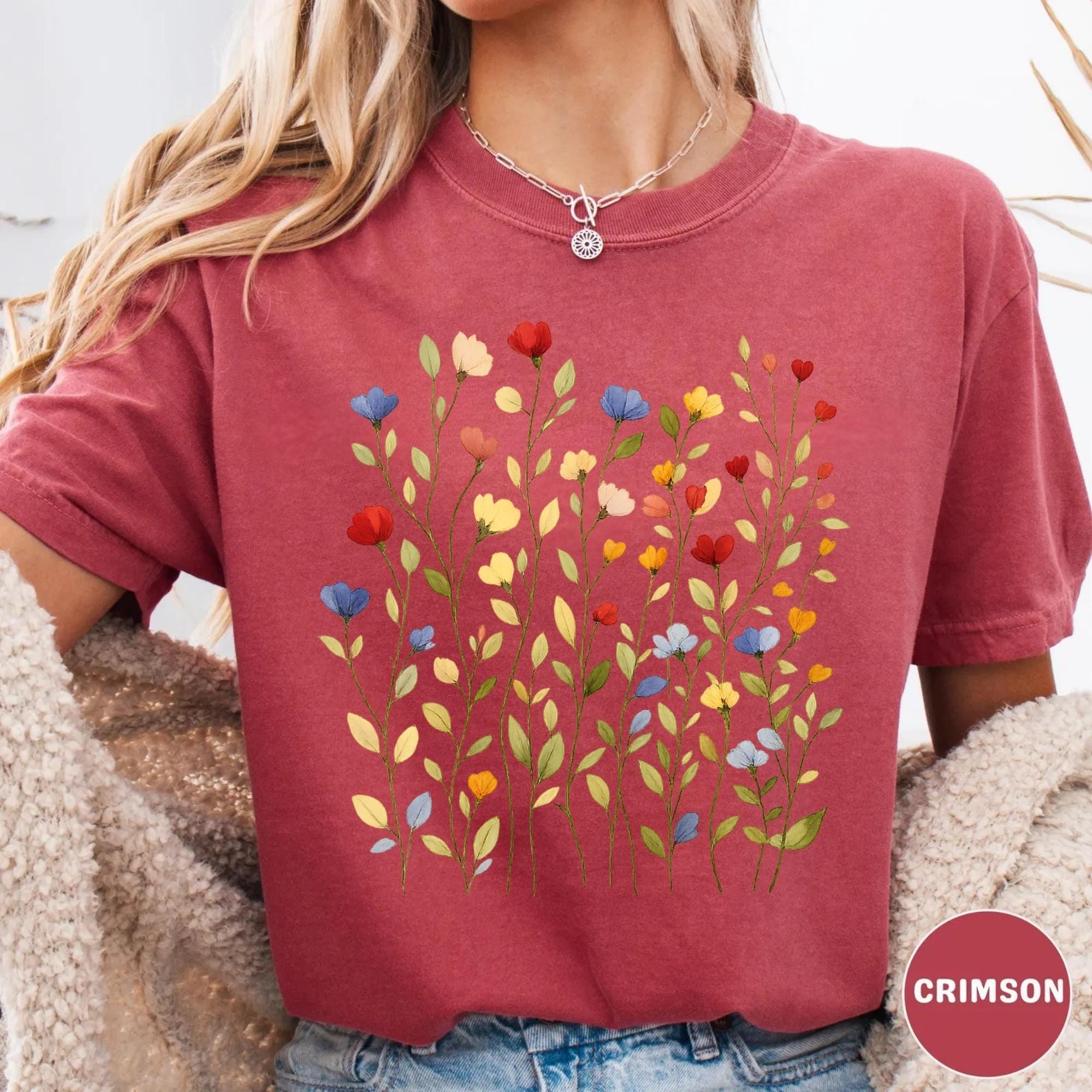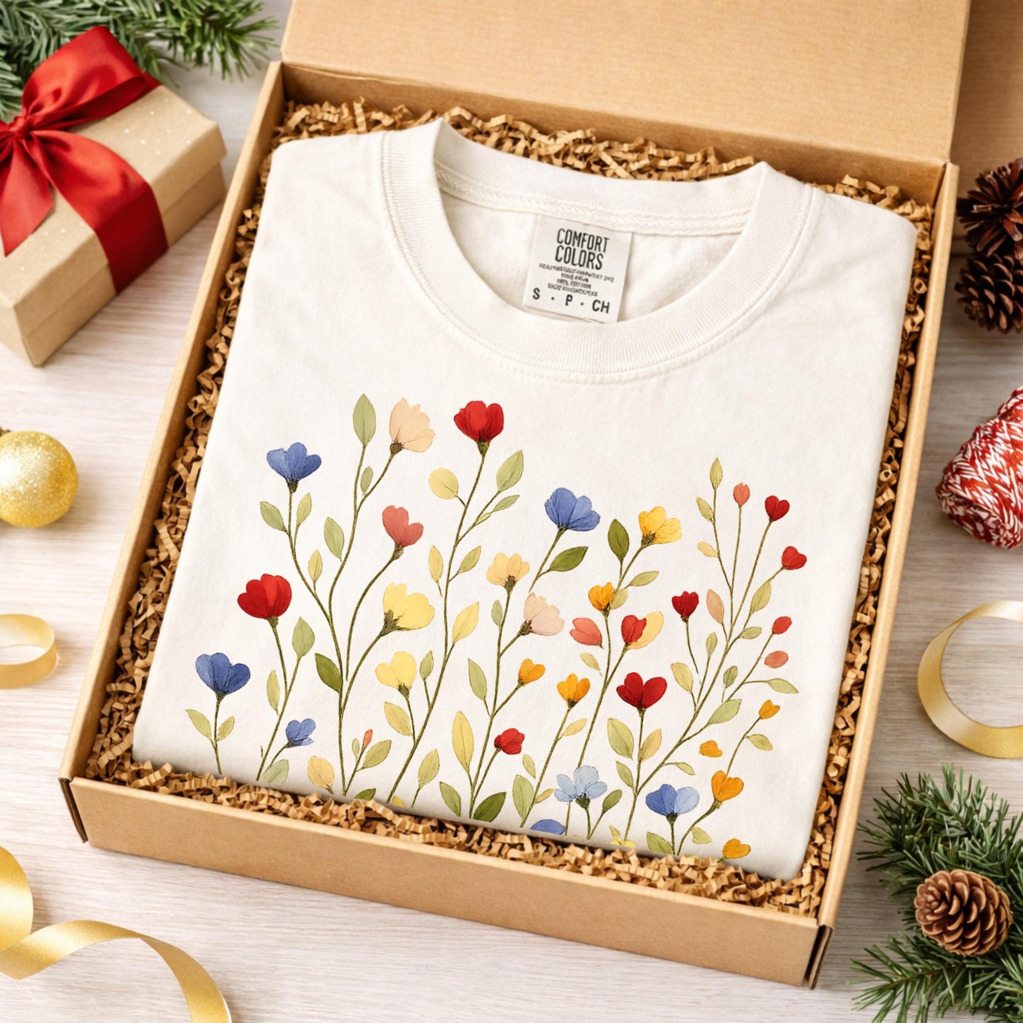 Bring soft nature vibes to your wardrobe with this beautiful wildflower botanical t-shirt. The delicate floral illustration features colorful hand-drawn flowers inspired by spring meadows and cottagecore aesthetics.