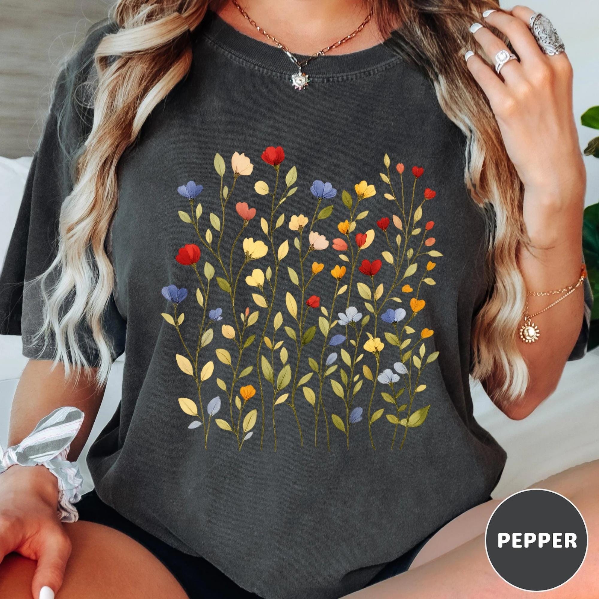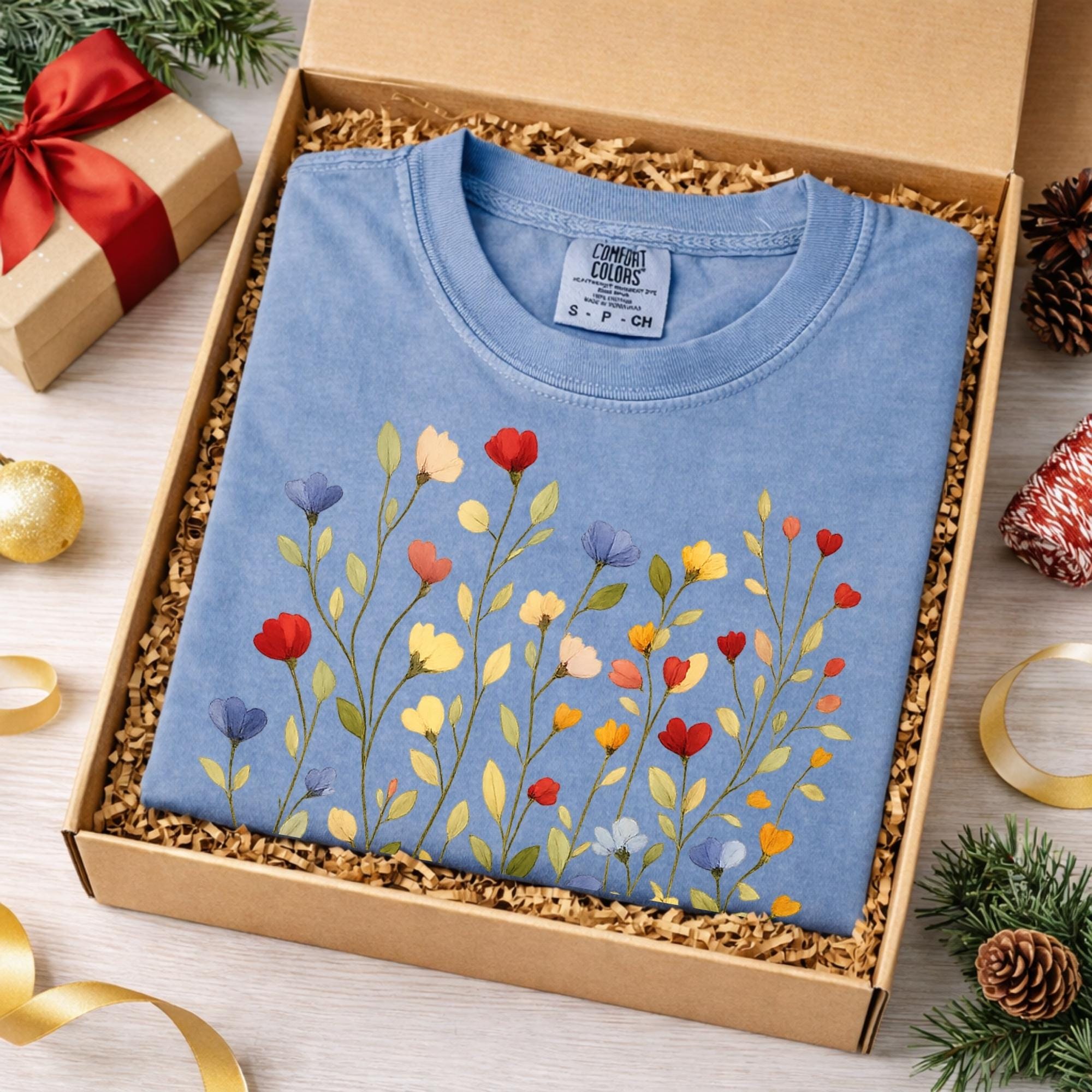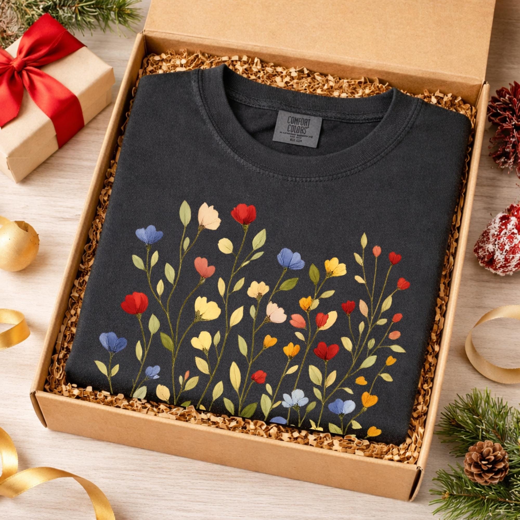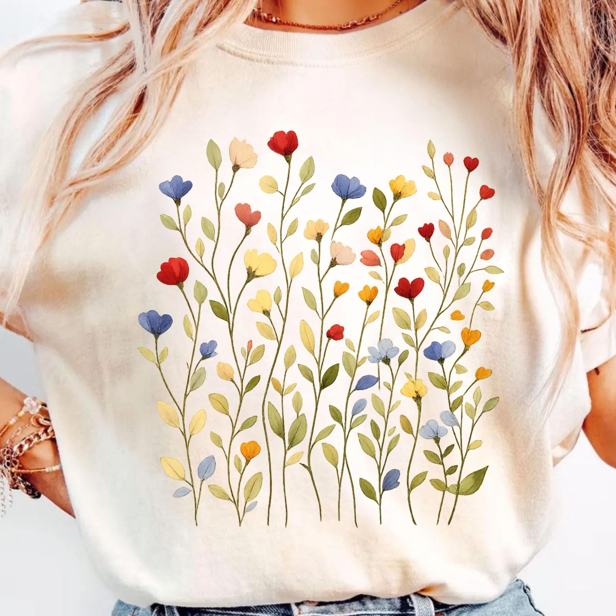 Bring soft nature vibes to your wardrobe with this beautiful wildflower botanical t-shirt. The delicate floral illustration features colorful hand-drawn flowers inspired by spring meadows and cottagecore aesthetics.